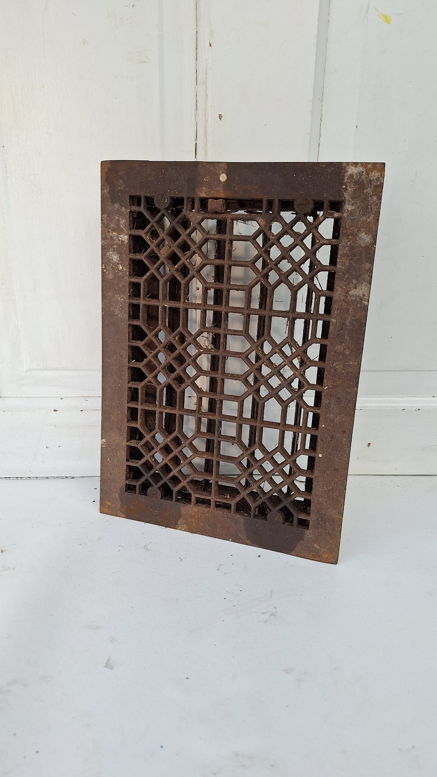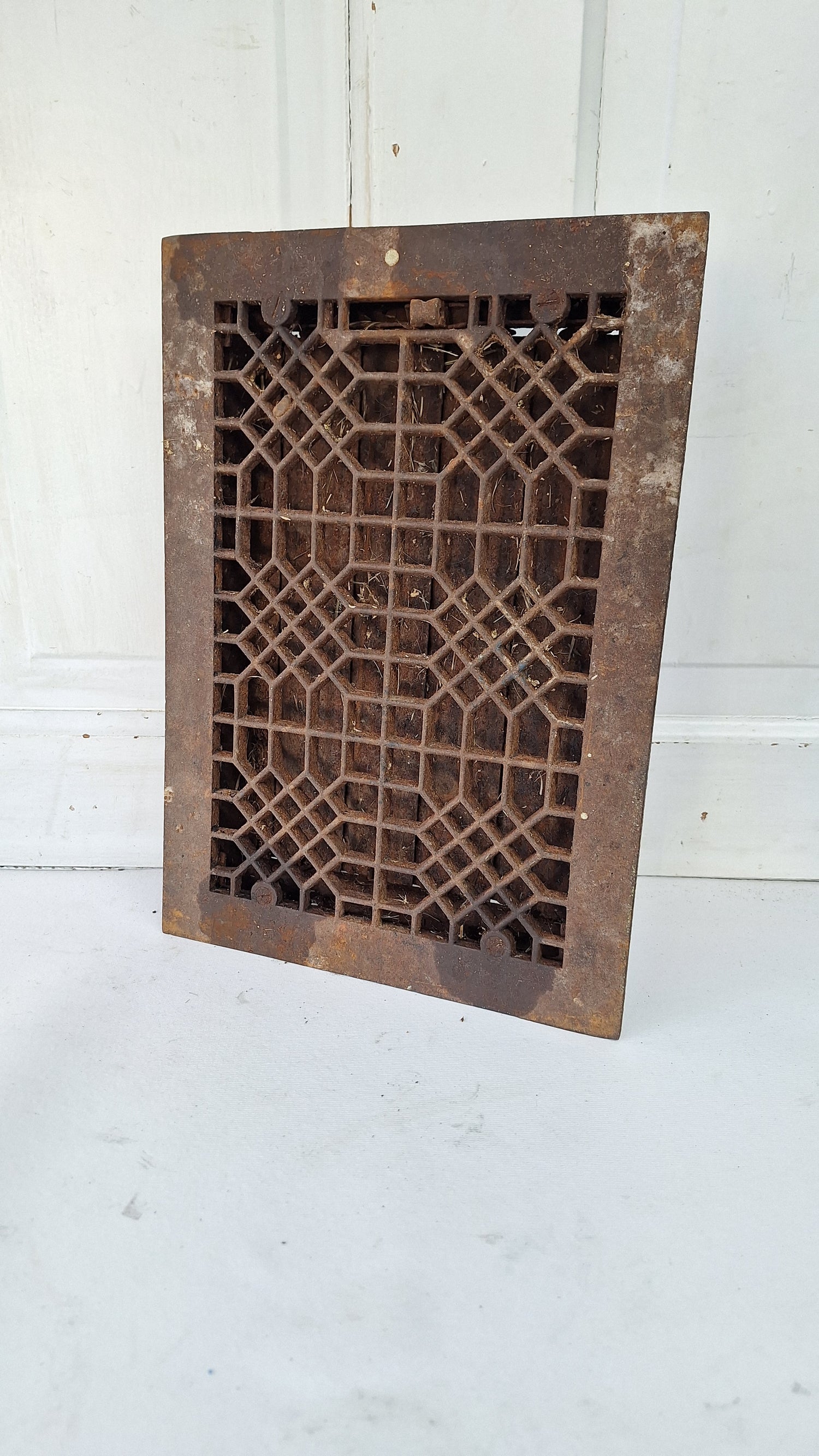 A beautifully patterned 'lattice' antique grate with working louvers on the back side. These are typically used to cover a vent opening in a floor or wall. These can be used with the louvers intact or the decorative top grate can be removed and used on its own. This piece is in 'as found' condition and has not been cleaned. Please see all of our pictures for details.