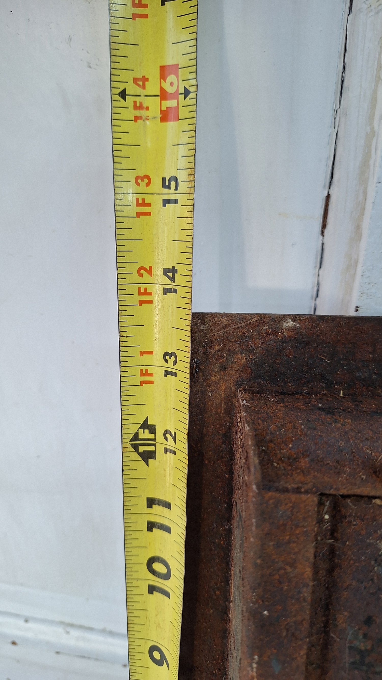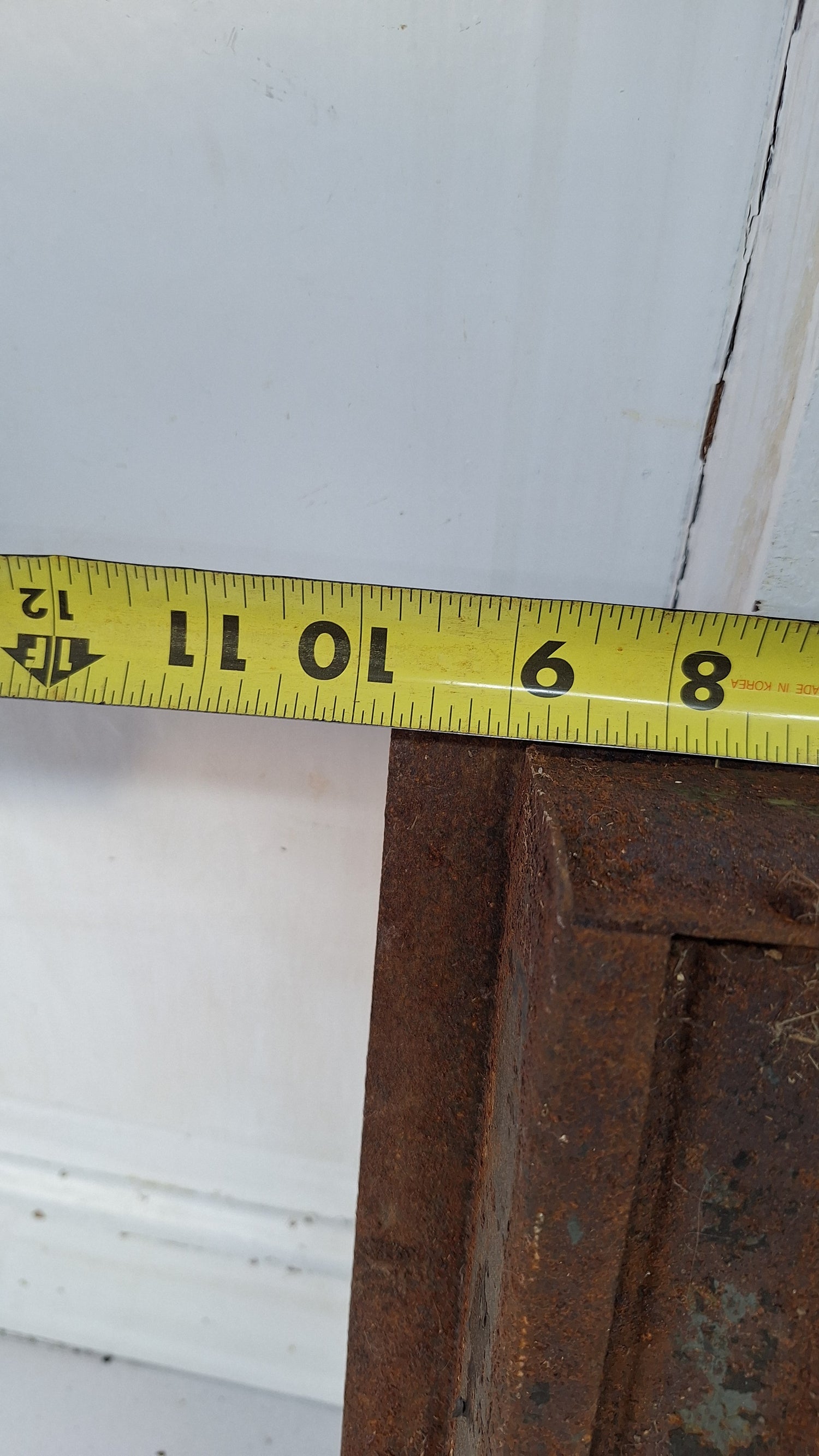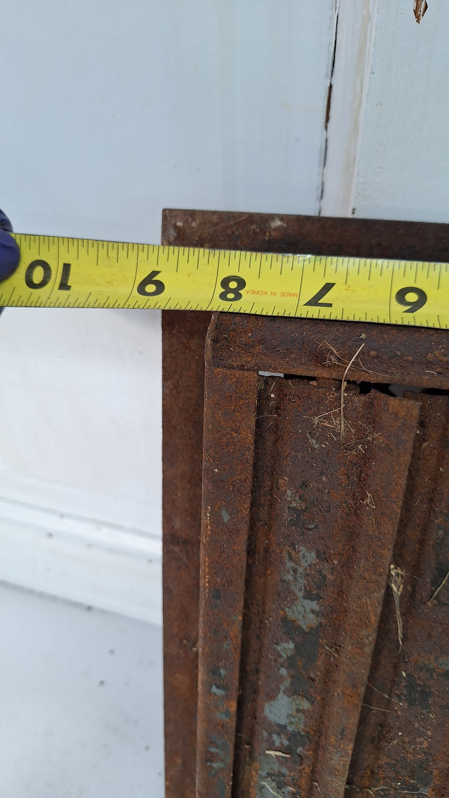 This antique vent cover measures 9 3/4" by 13 3/4". The raised section on the back measures 8" by 12". This item ships free within the US. No PO boxes please.