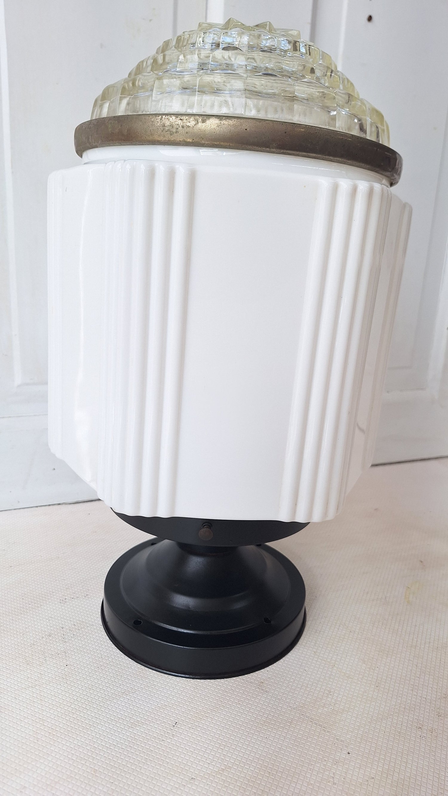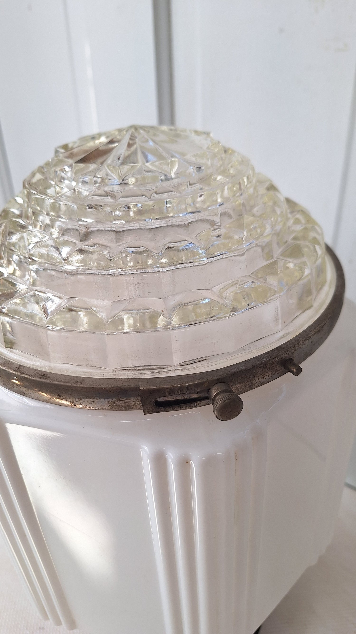 Two Piece Vintage Faceted Clear and White Glass Flush Mount, Schoolhouse or Skyscraper Light, Salvaged Antique Art Deco Light Salvage 072705