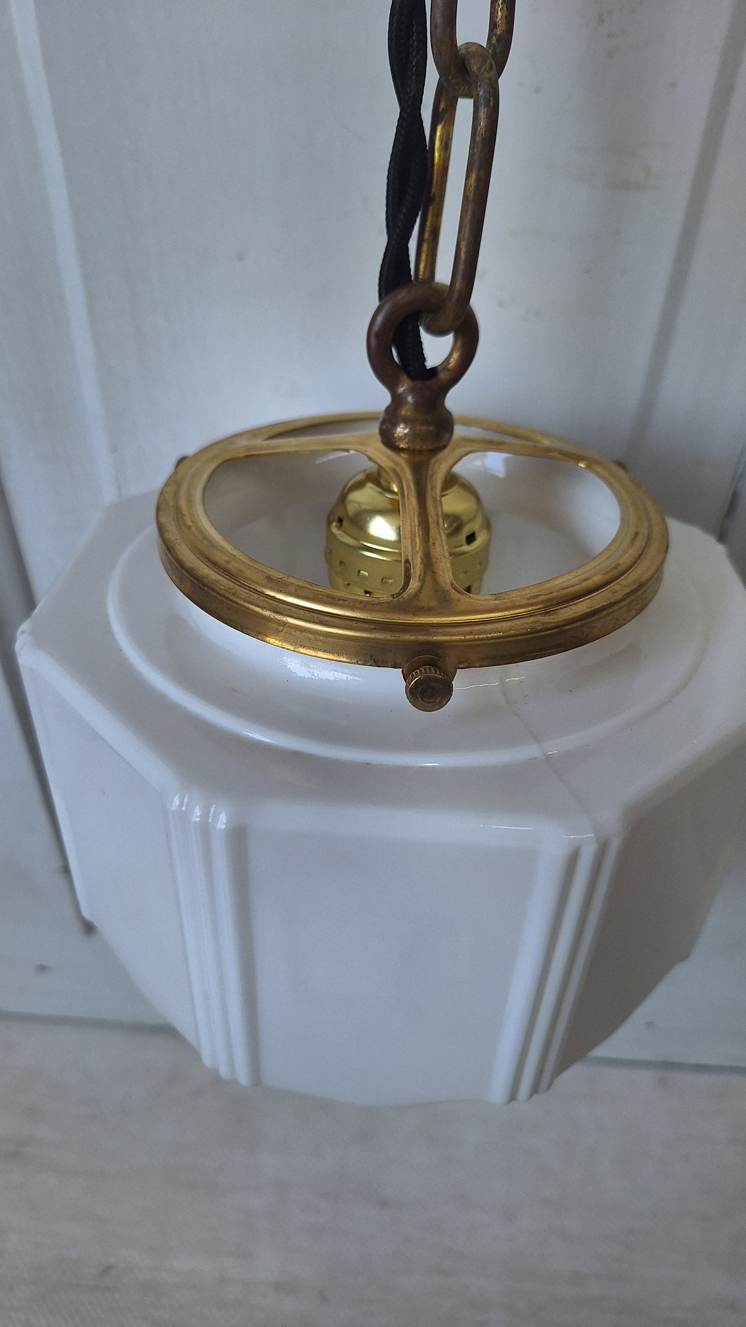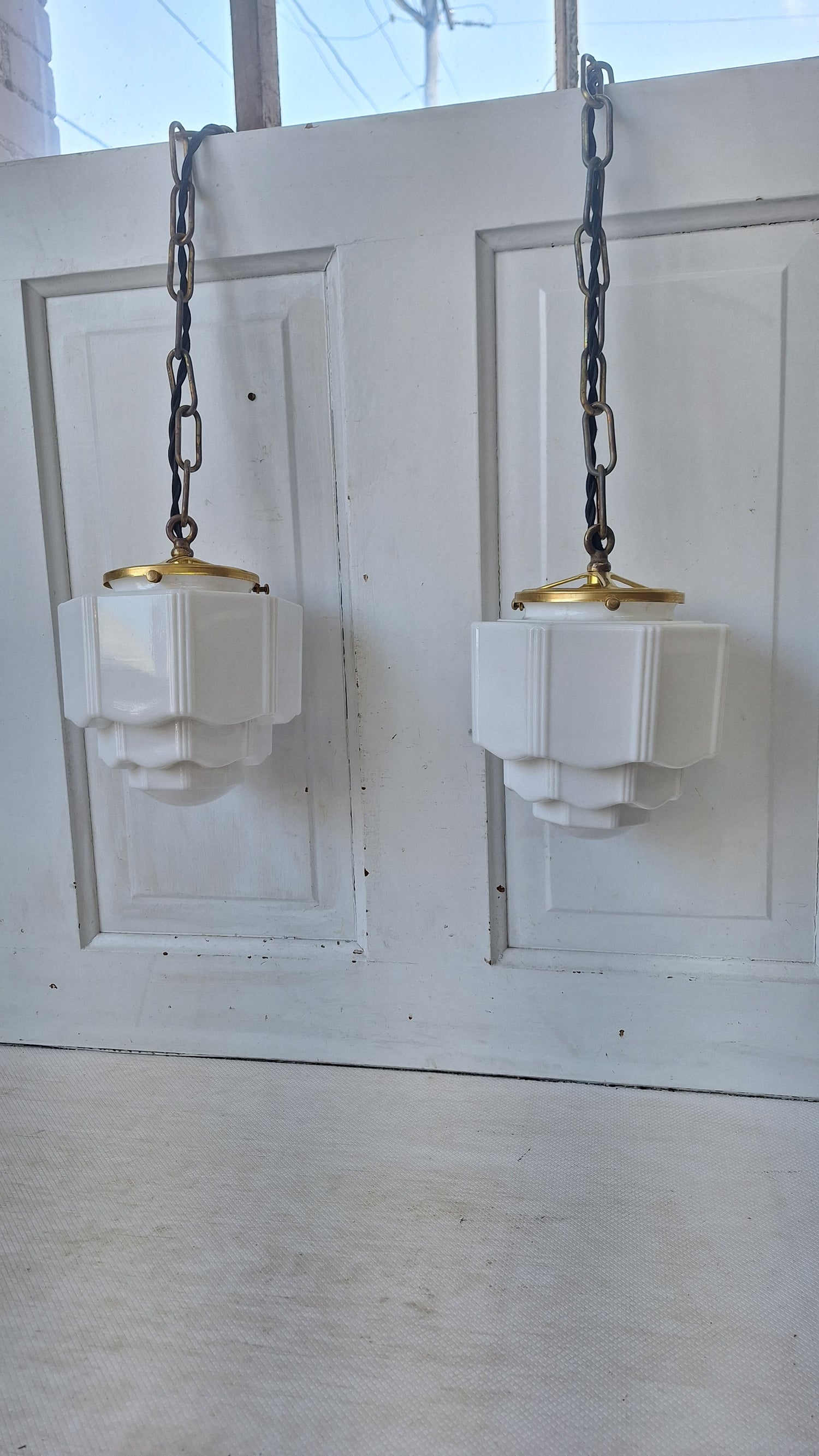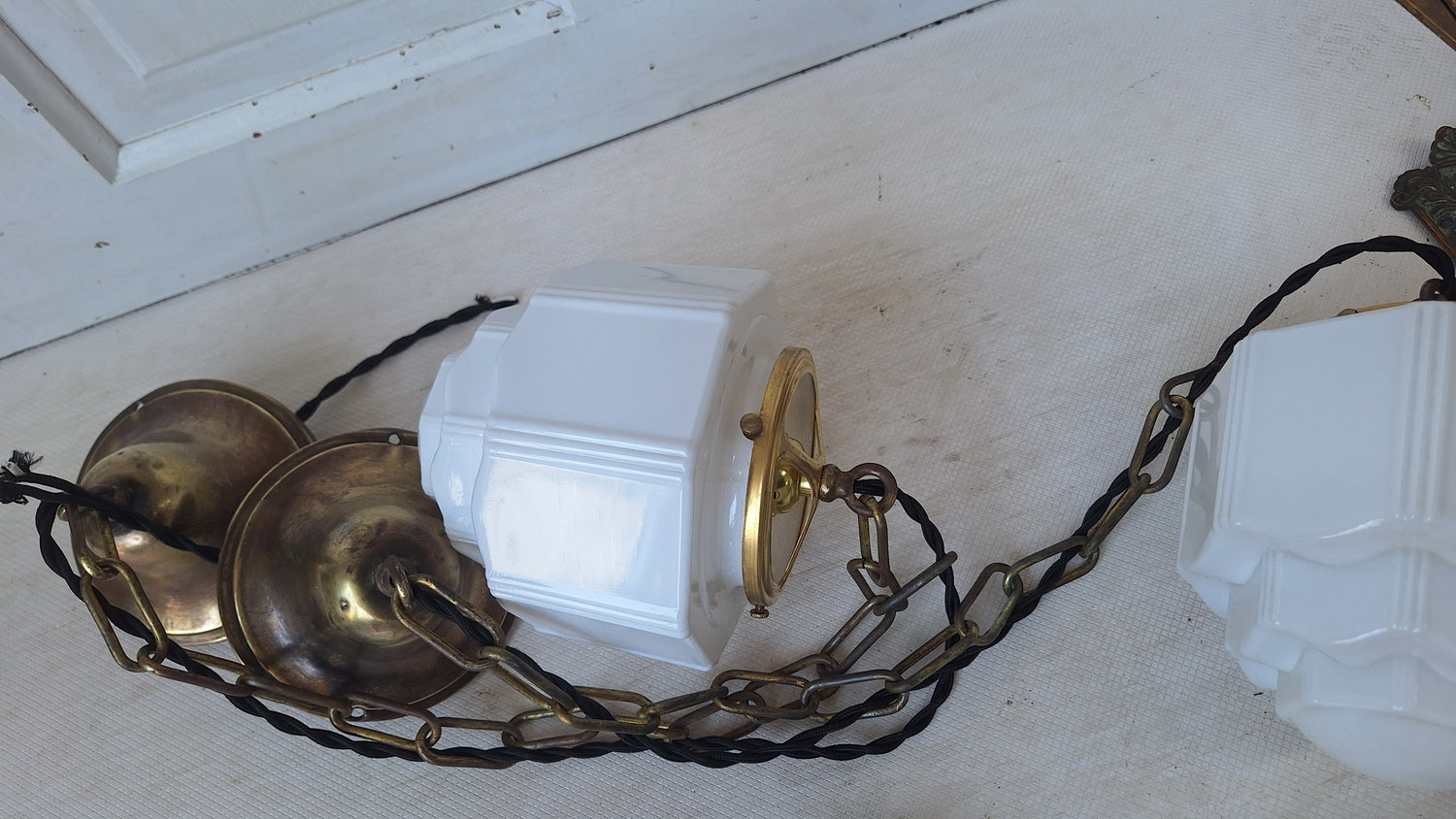 Pair Vintage Pendant Art Deco Lights, White Glass and Brass Lights, Kitchen Island Lighting, Architecture Salvage 053001
