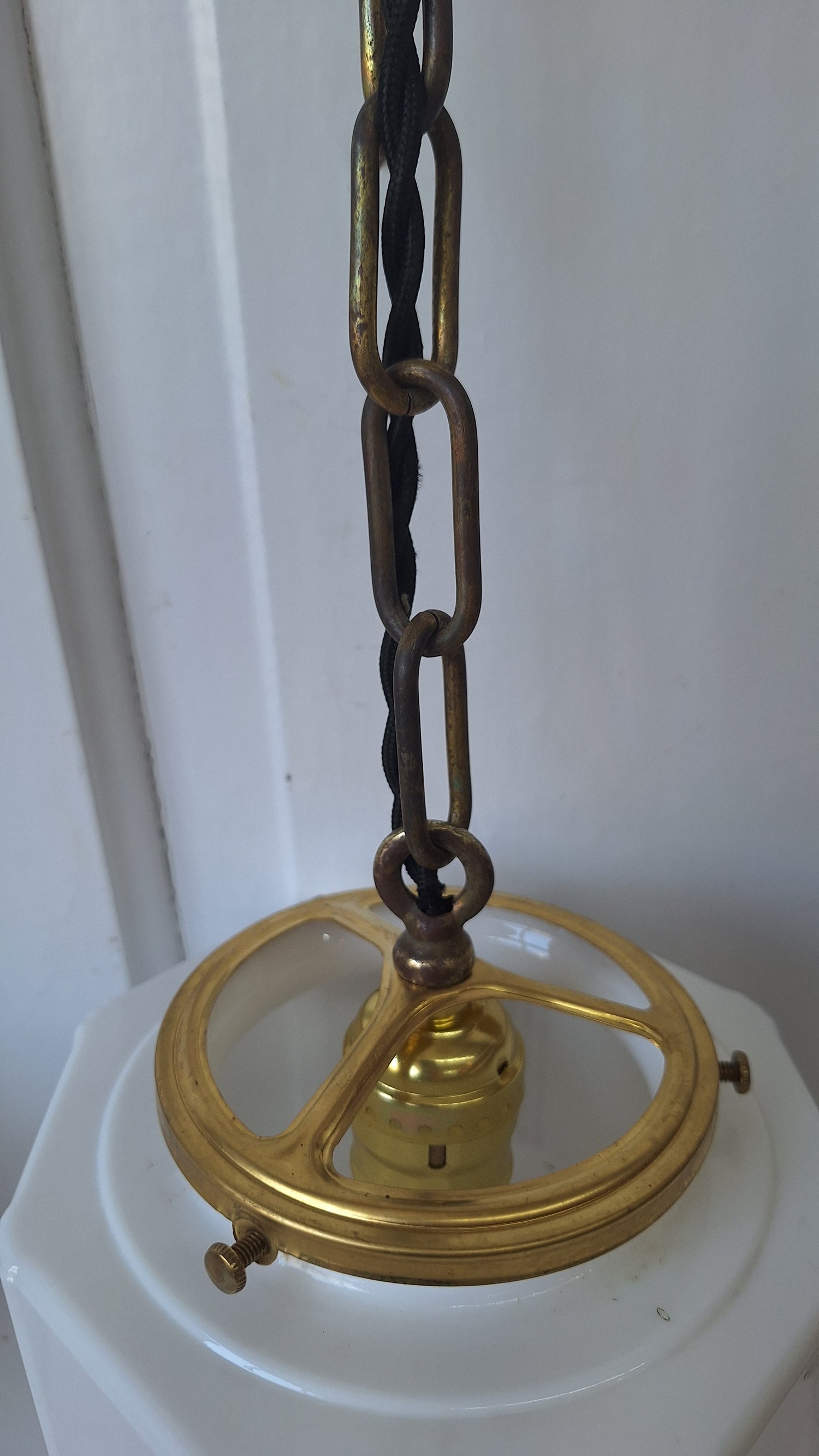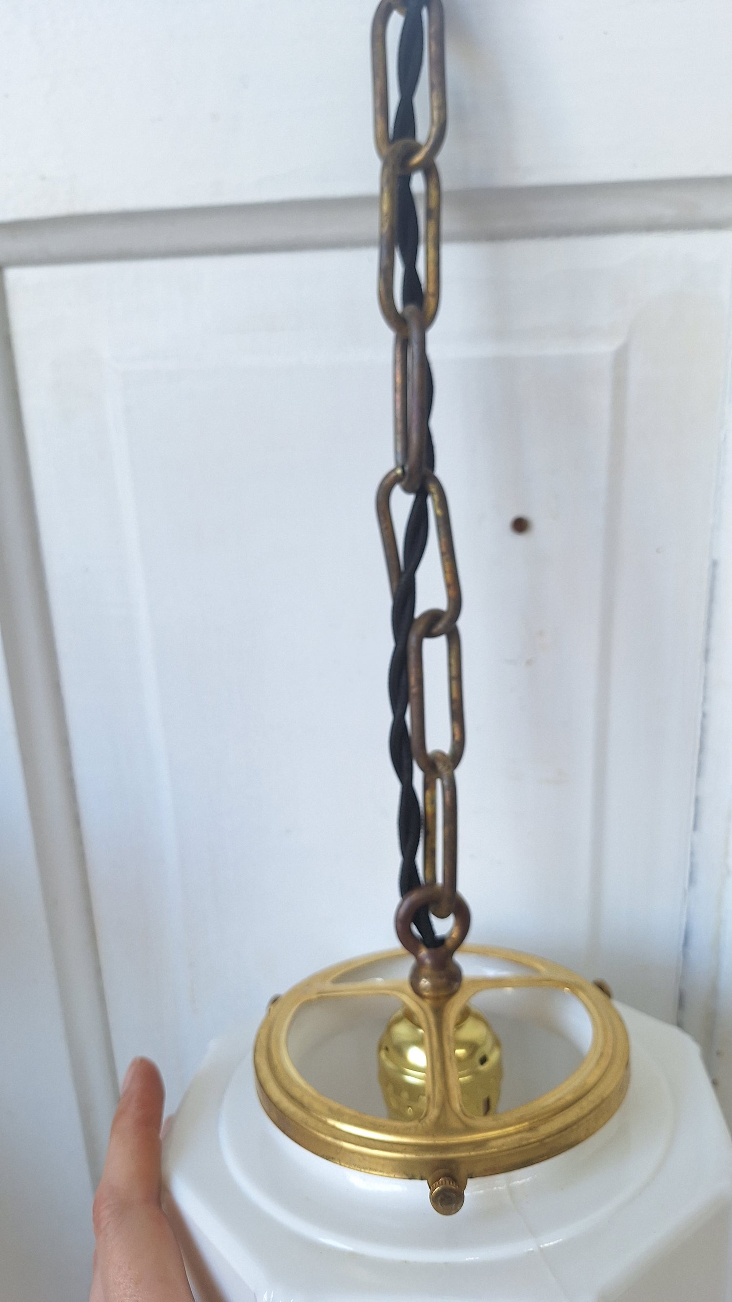 A delicate pair of vintage pendant lights with a white glass globe and brass fixtures. The lengths are easy to shorten if needed. Chains measure 19". Please see our pictures for details. This set is in excellent condition and ready to install. All wiring and sockets are new.