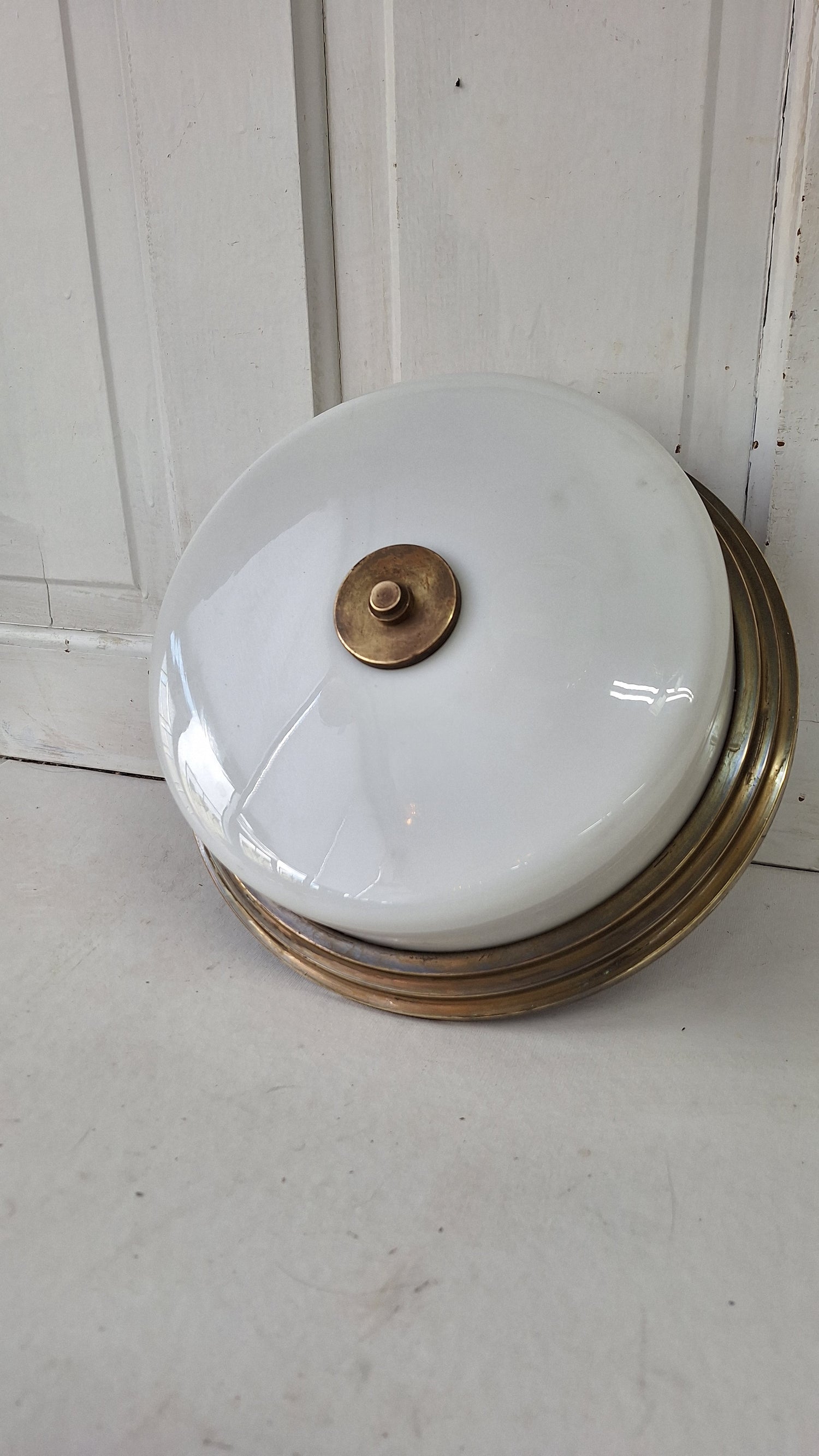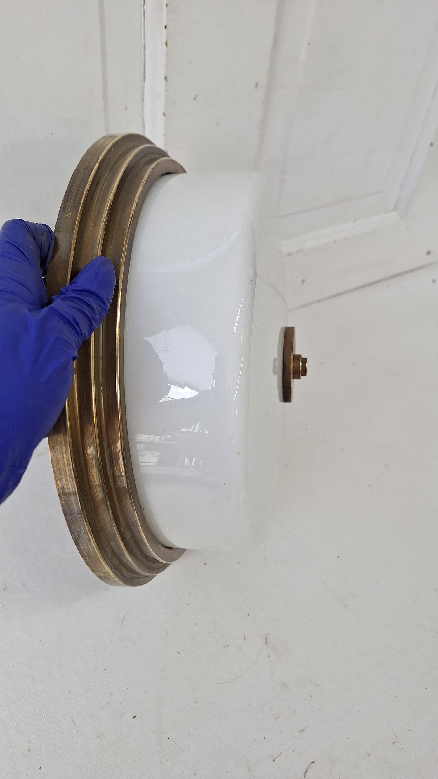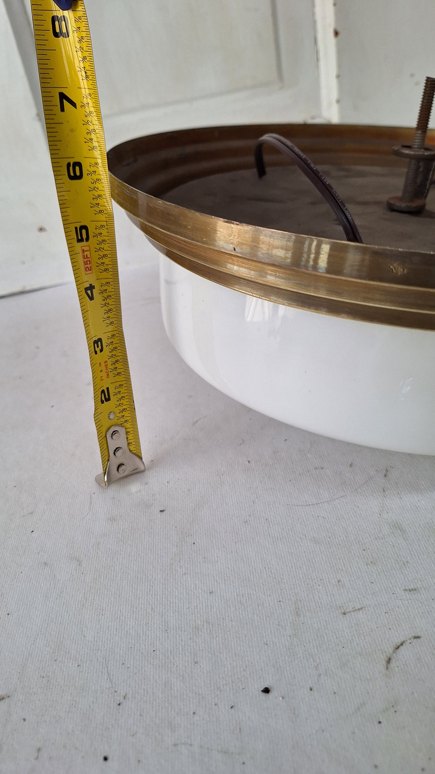An antique ceiling light made by Beardslee Lighting. This piece features a beautiful white glass shade and brass fittings. It has been rewired and is ready to install. The glass and metal are in excellent condition. We have three of these lights available. Each fixture has two sockets for bulbs. Please see all of our pictures for details and dimensions. This item ships free within the continental US. No PO boxes please. www.peoriasalvage.com