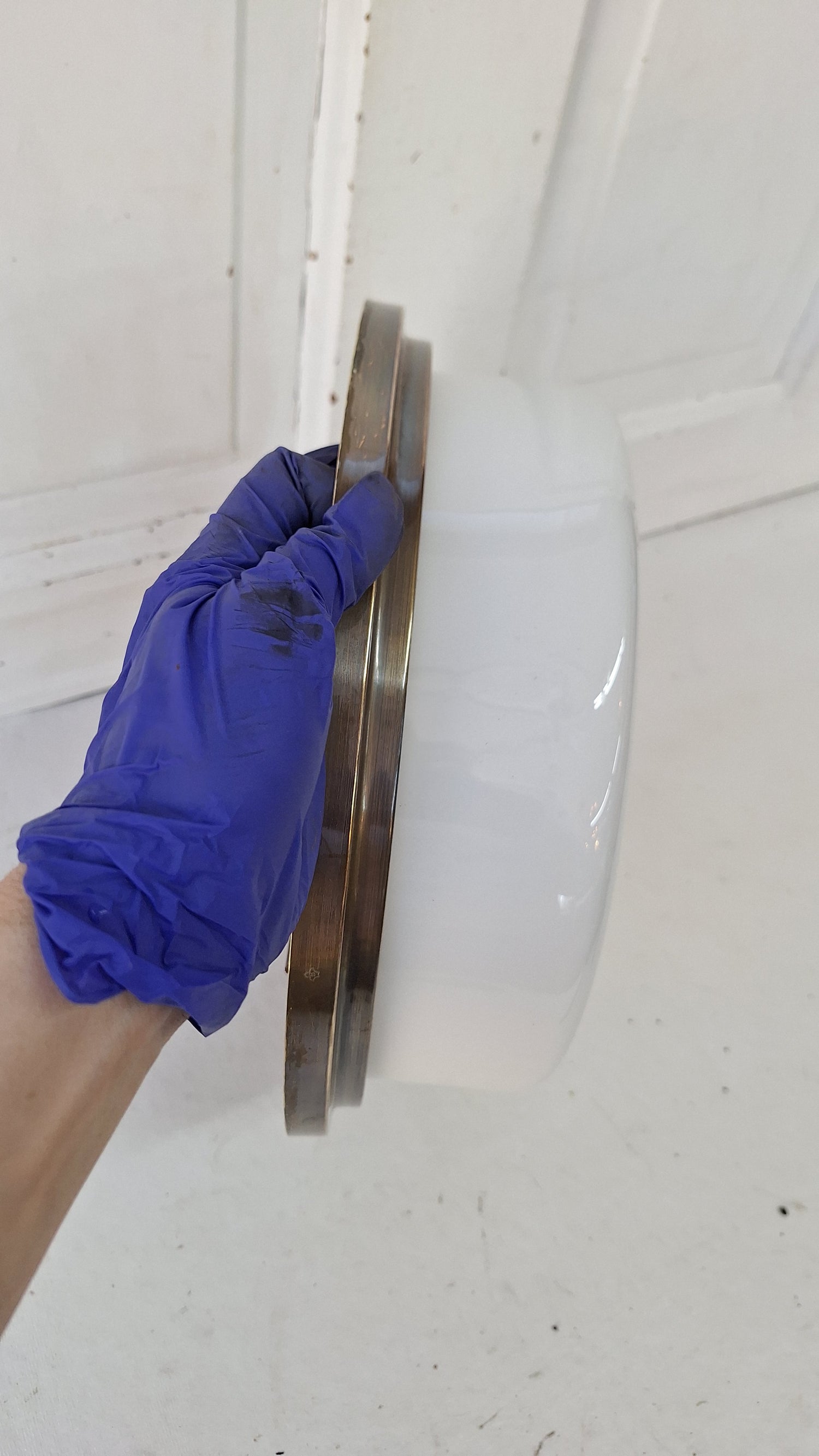 An antique ceiling light made by Beardslee Lighting. This piece features a beautiful white glass shade and brass fittings. It has been rewired and is ready to install. The glass and metal are in excellent condition. We have three of these lights available. Each fixture has two sockets for bulbs. Please see all of our pictures for details and dimensions. This item ships free within the continental US. No PO boxes please. www.peoriasalvage.com