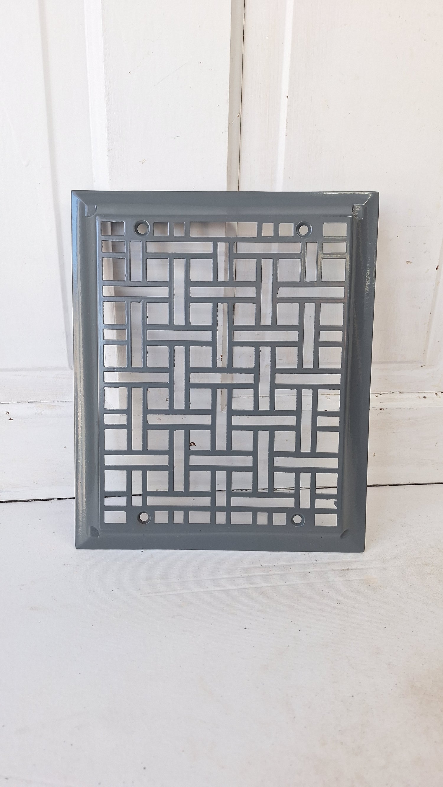A beautiful antique wall vent cover with a decorative grid pattern and a crisp gray finish. This vent cover has a raised cover which is meant only for wall (or ceiling) use. The finish is in very good condition as shown.