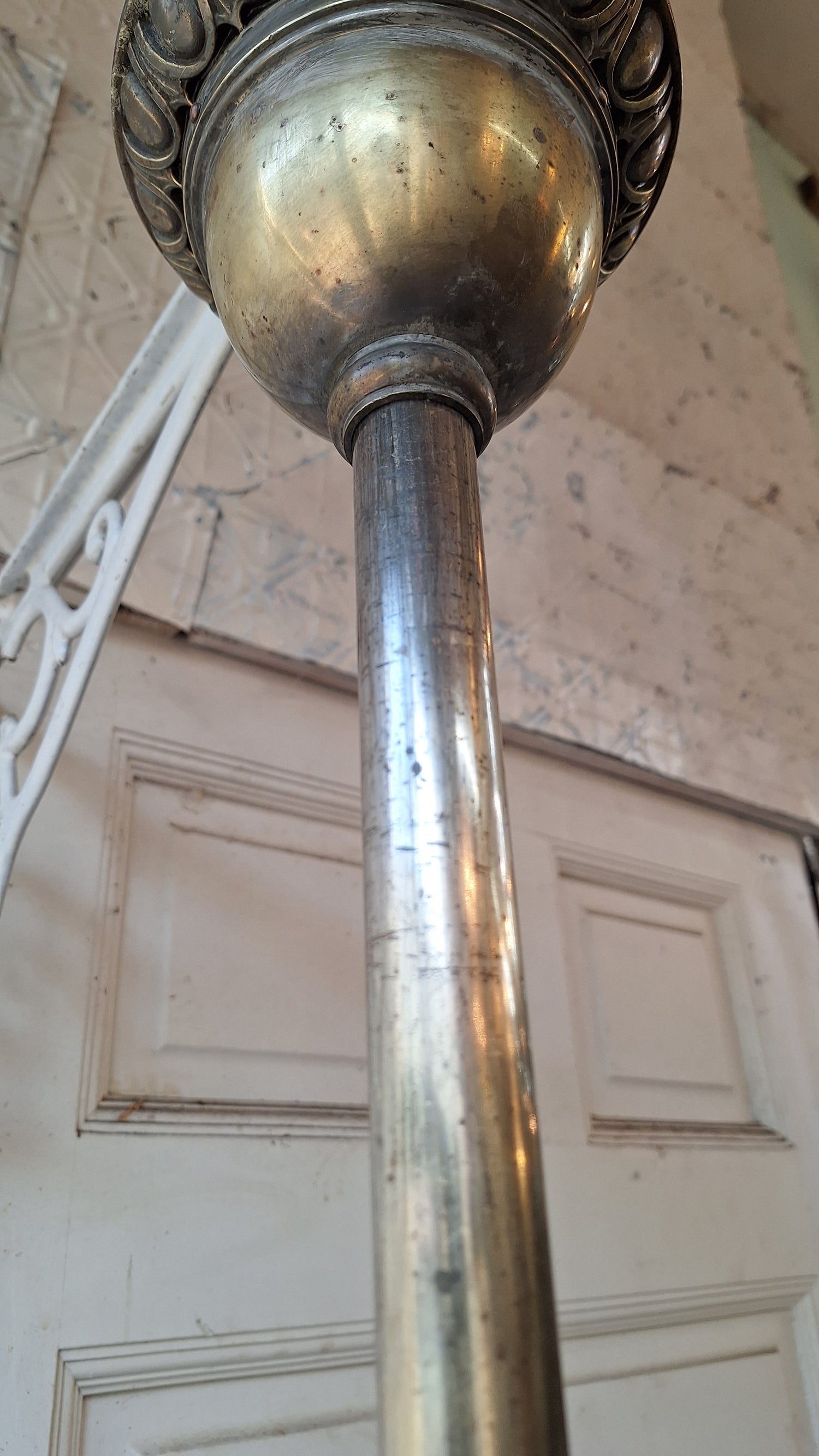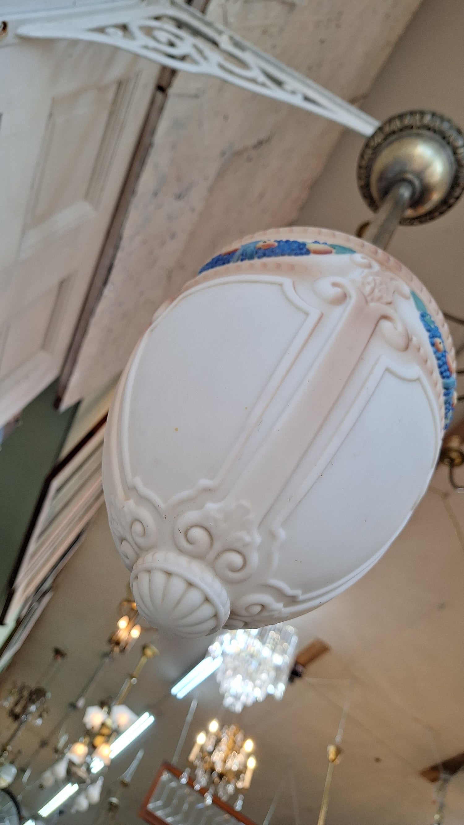 An elegant, painted acorn style shade paired with a beautiful bronze fixture with woven ribbon and egg and dart details. This piece has been rewired with a damp-rated socket and can be used on a porch or other covered, outdoor area. The glass does have some small scuff marks as pictured and the top edge has a chip which is covered by the bronze fitter. Please see all of our pictures for details.