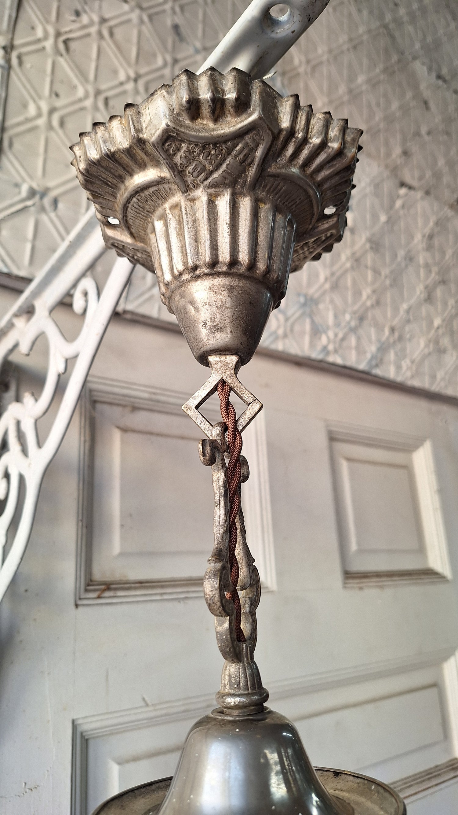 A stunning opalescent swirled glass shade paired with a silver-plated vintage metal base with Deco detailing. This piece has been rewired and is ready to install. It can be paired with different bulbs for a brighter or more subtle glow. The glass is luminous and appears green in some light and more blue in others. There are some small chips/minor cracks in the glass as shown in photo #5 and some discoloration in the metal from age as well as a hole in the canopy for an original pull chain switch. Please see all of our pictures for details.