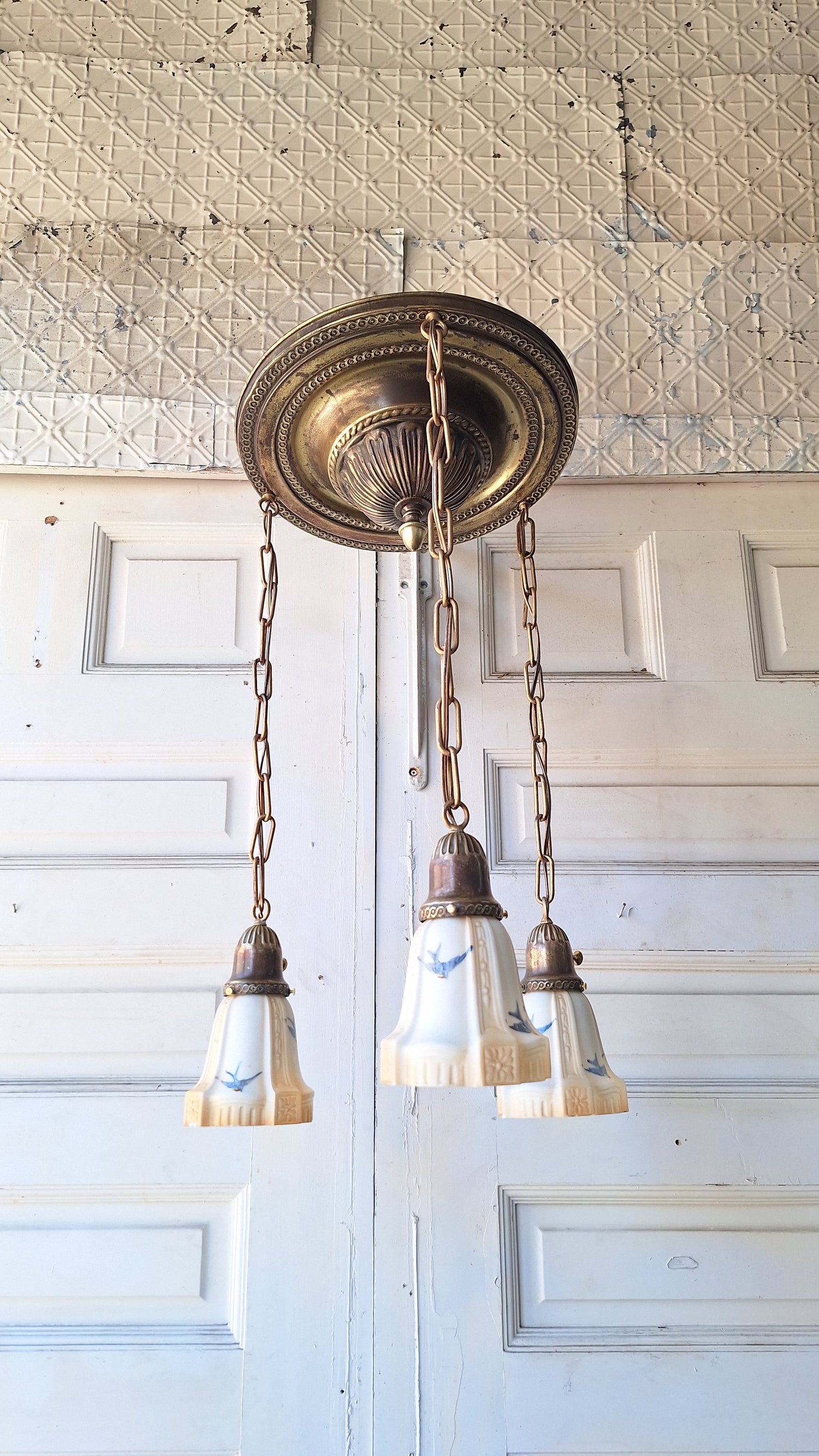 A beautiful Sheffield style brass pan light with three beautiful hanging shades handpainted with tiny blue birds. The glass shades are in good condition with minimal signs of wear beyond a few chips in the edge of one shade as shown. The brass body has been lightly polished to show off the stamped details although there are some darker areas from age.