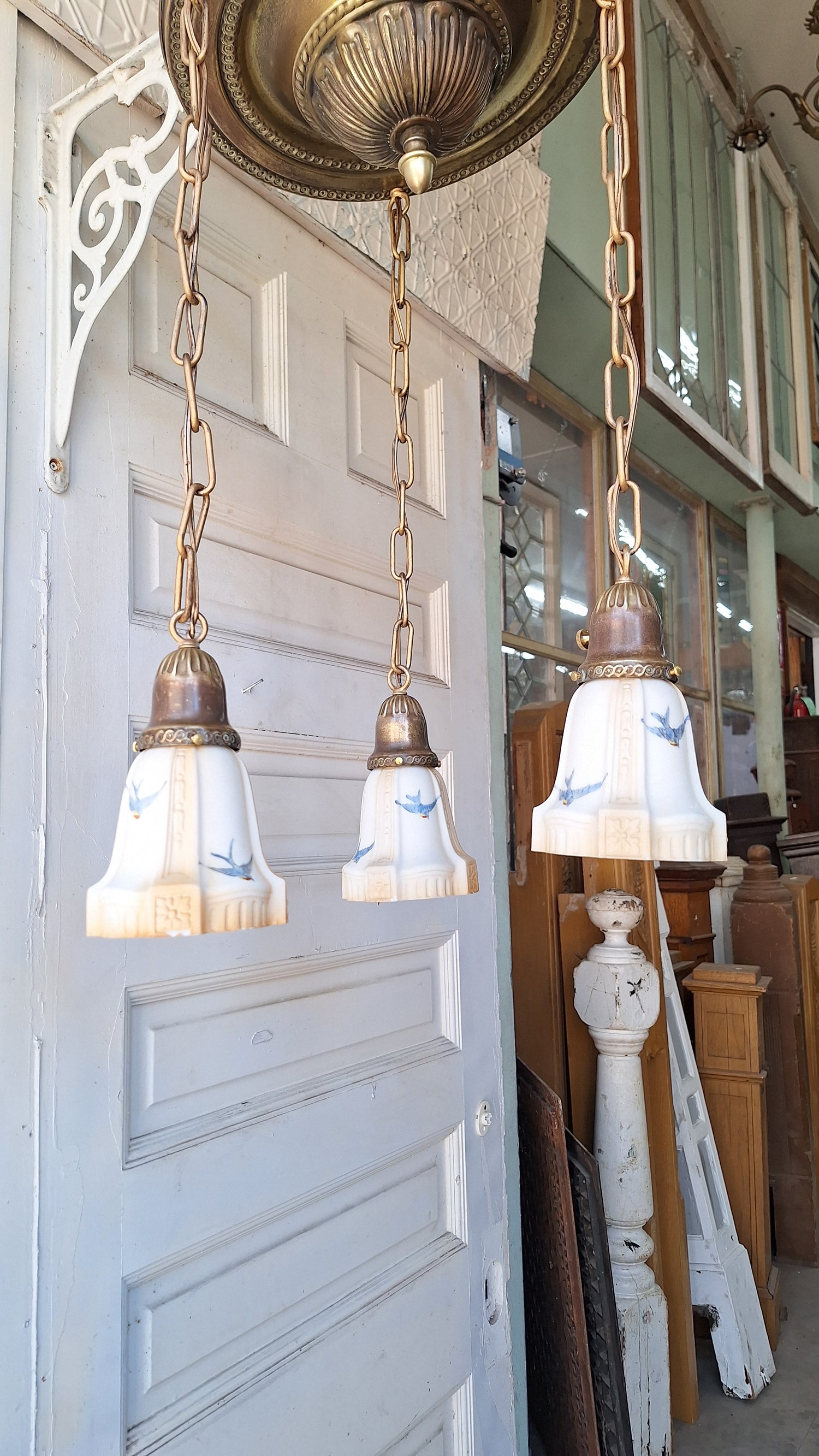 Bluebird Shades Antique Pan Light, Antique Brass Chandelier with Hand Painted Blue Bird Glass Shades