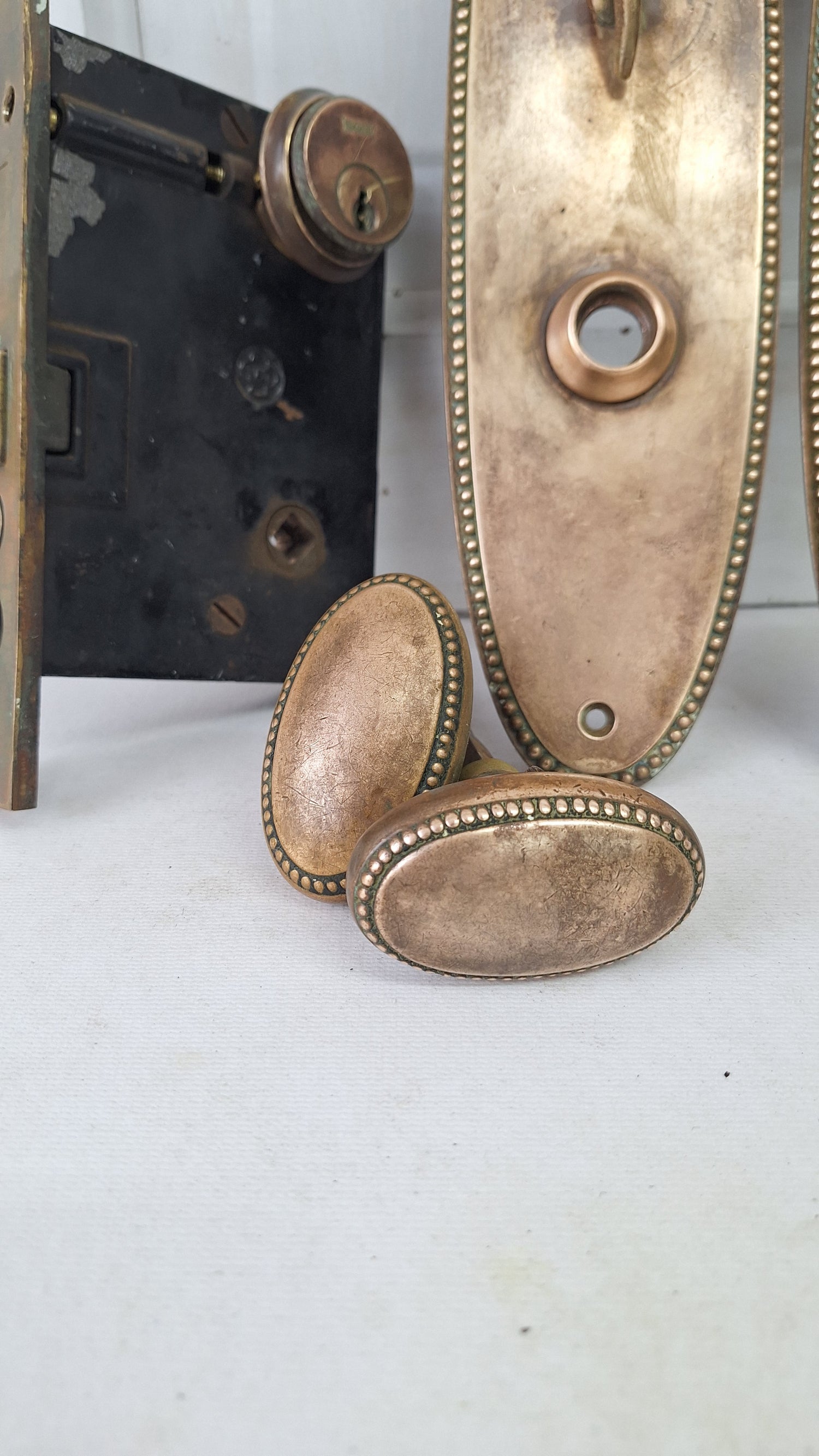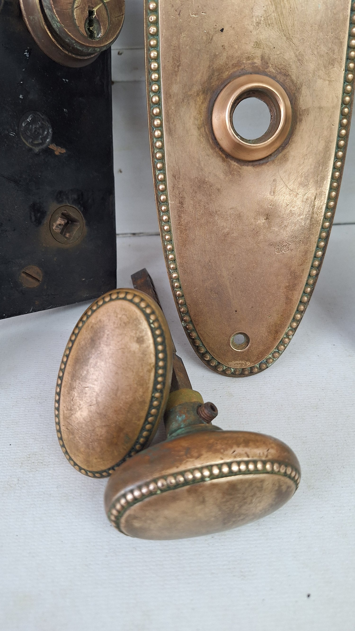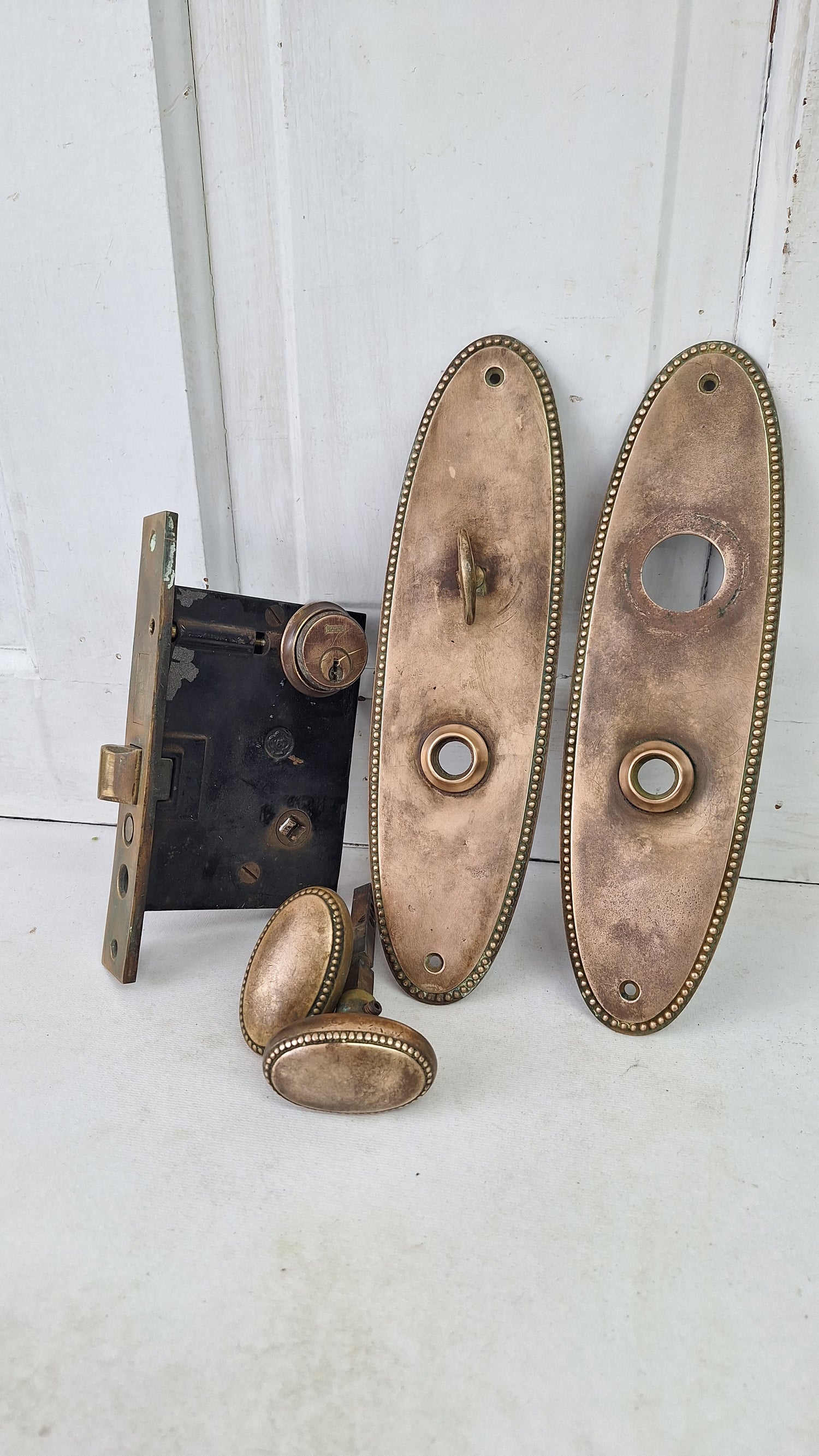 A gorgeous bronze front door entry set complete with thumbturn privacy latch. This set has been cleaned and reassembled to ensure it is in working condition. The set consists of an two plates, two oval knobs, spindle, mortise latch, and cylinder lock. A new key will need to be cut for the cylinder lock.