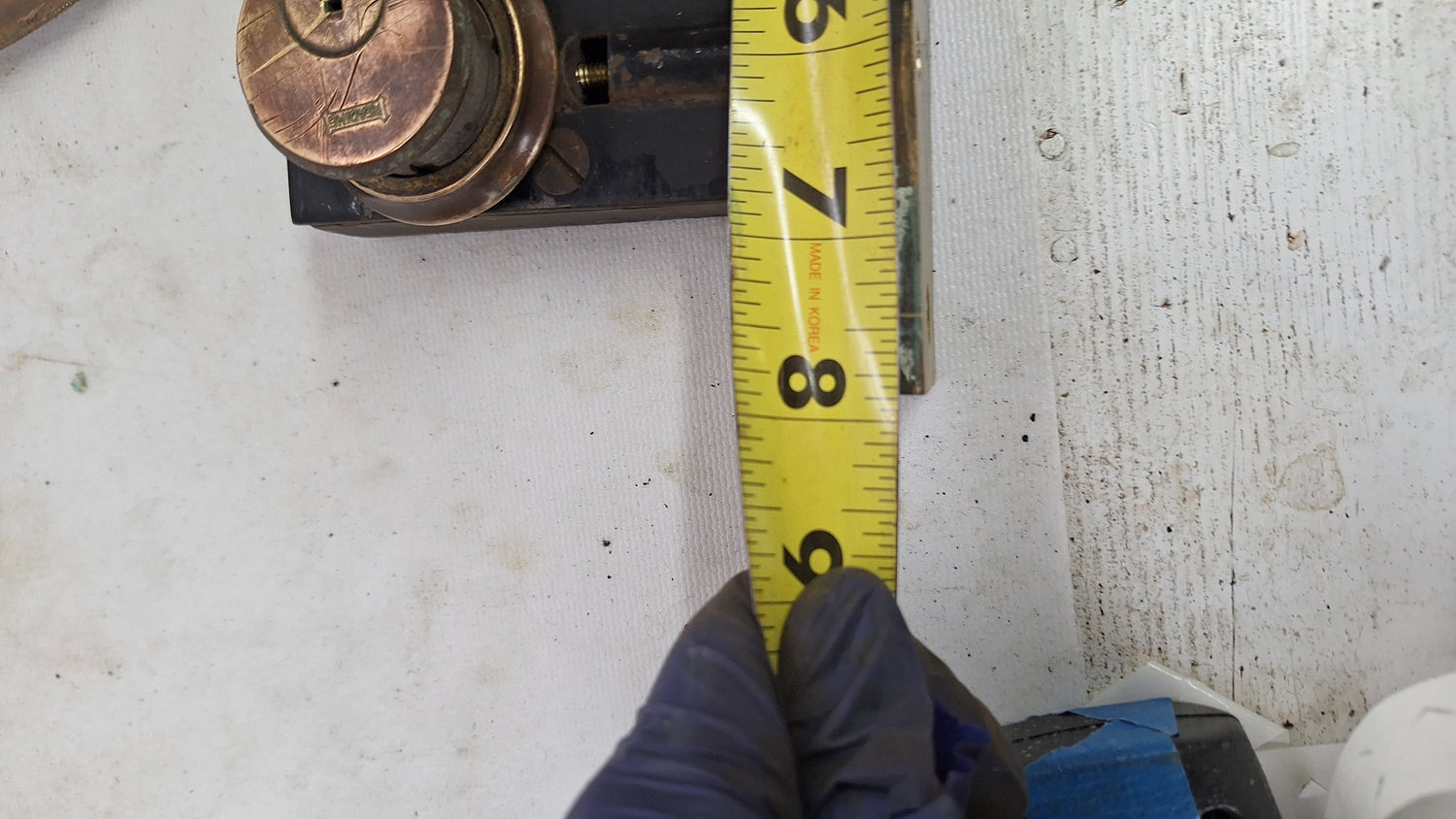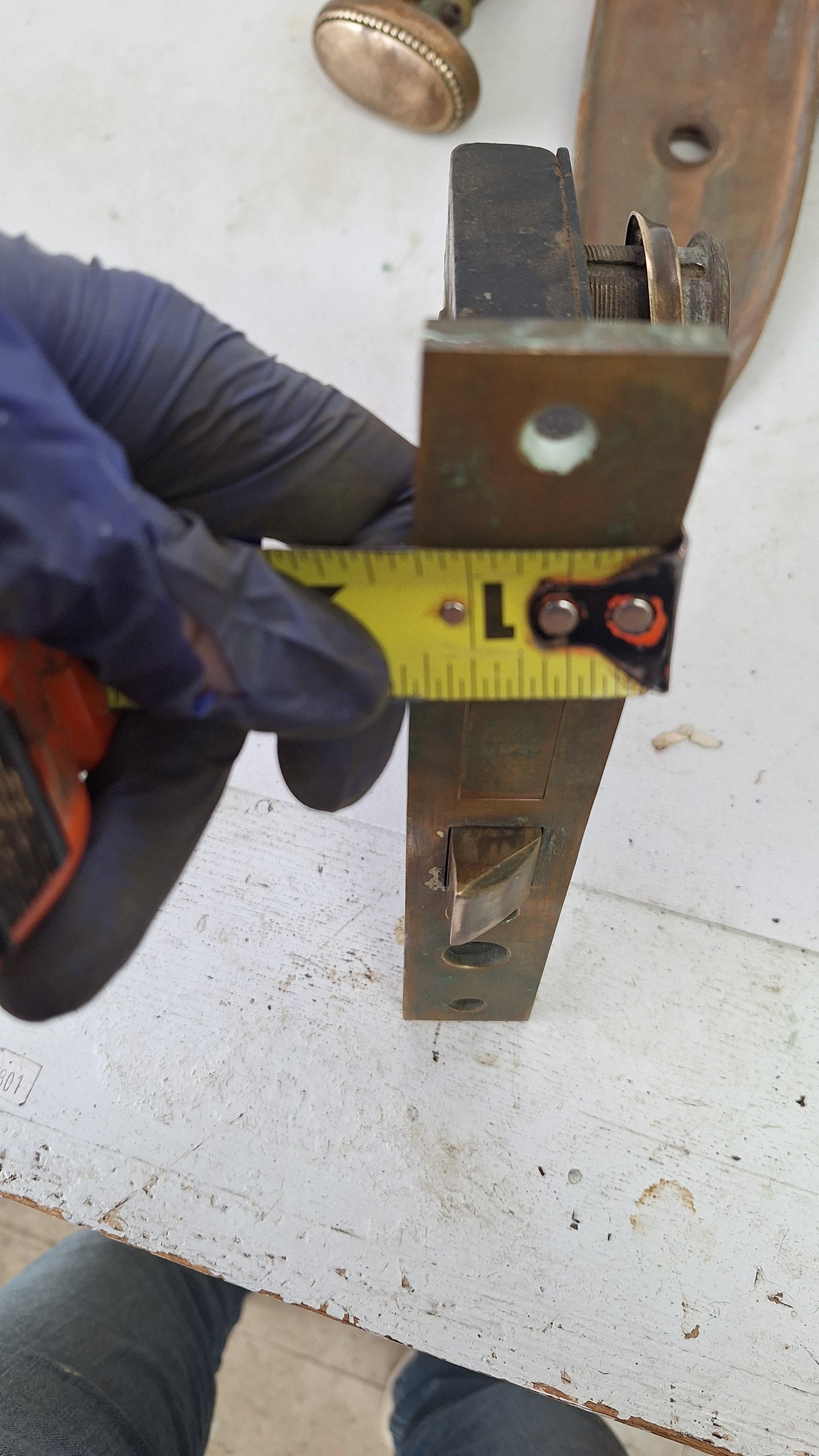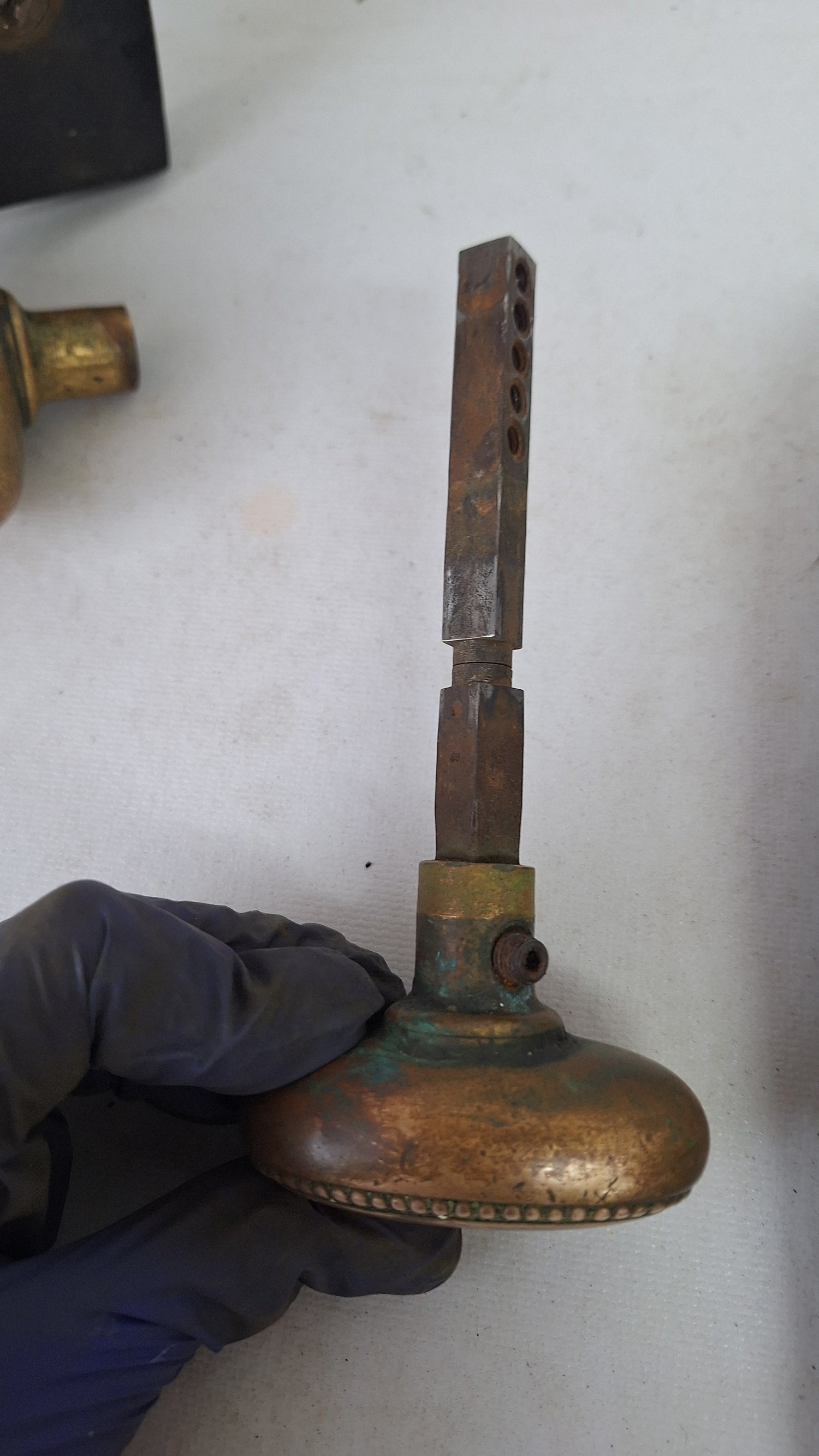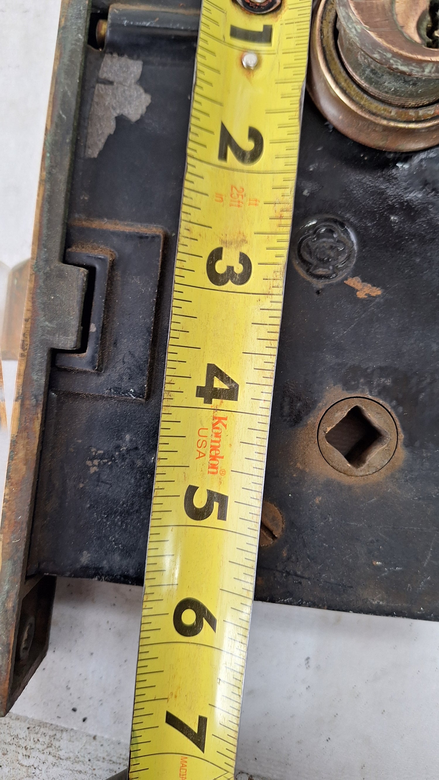 A gorgeous bronze front door entry set complete with thumbturn privacy latch. This set has been cleaned and reassembled to ensure it is in working condition. The set consists of an two plates, two oval knobs, spindle, mortise latch, and cylinder lock. A new key will need to be cut for the cylinder lock.