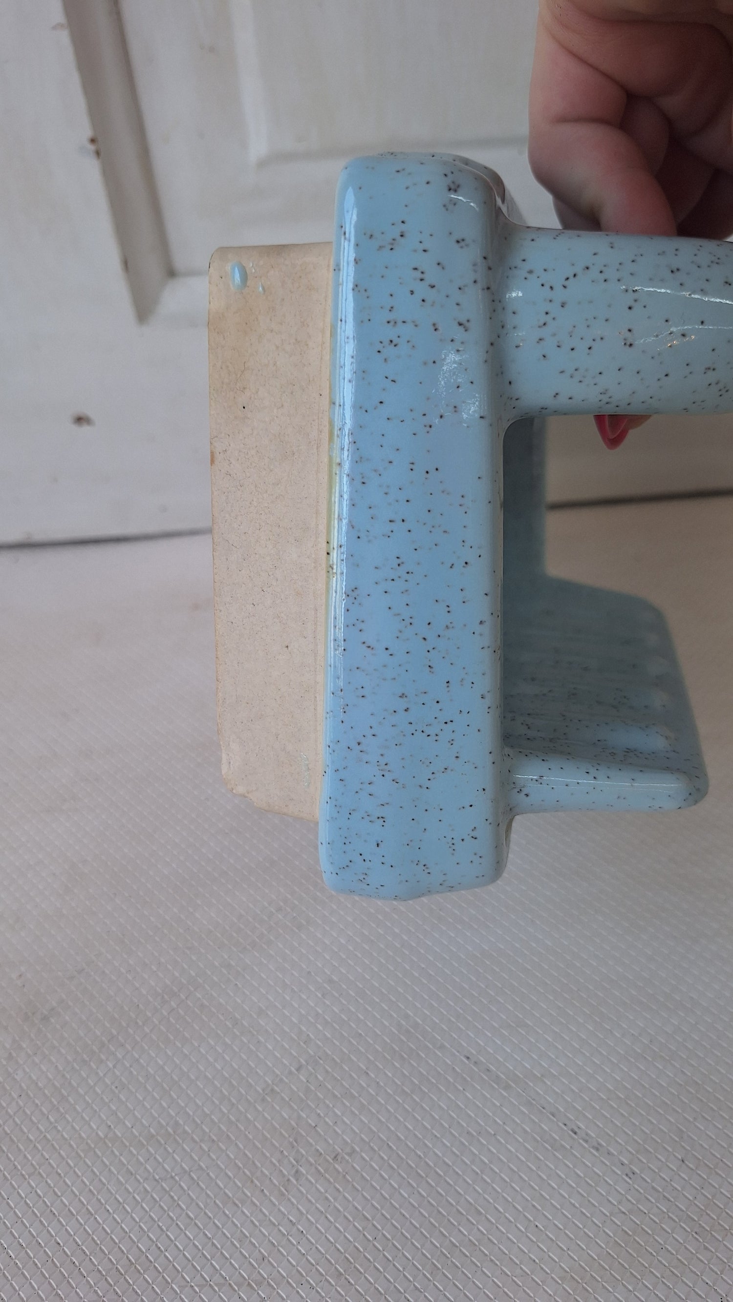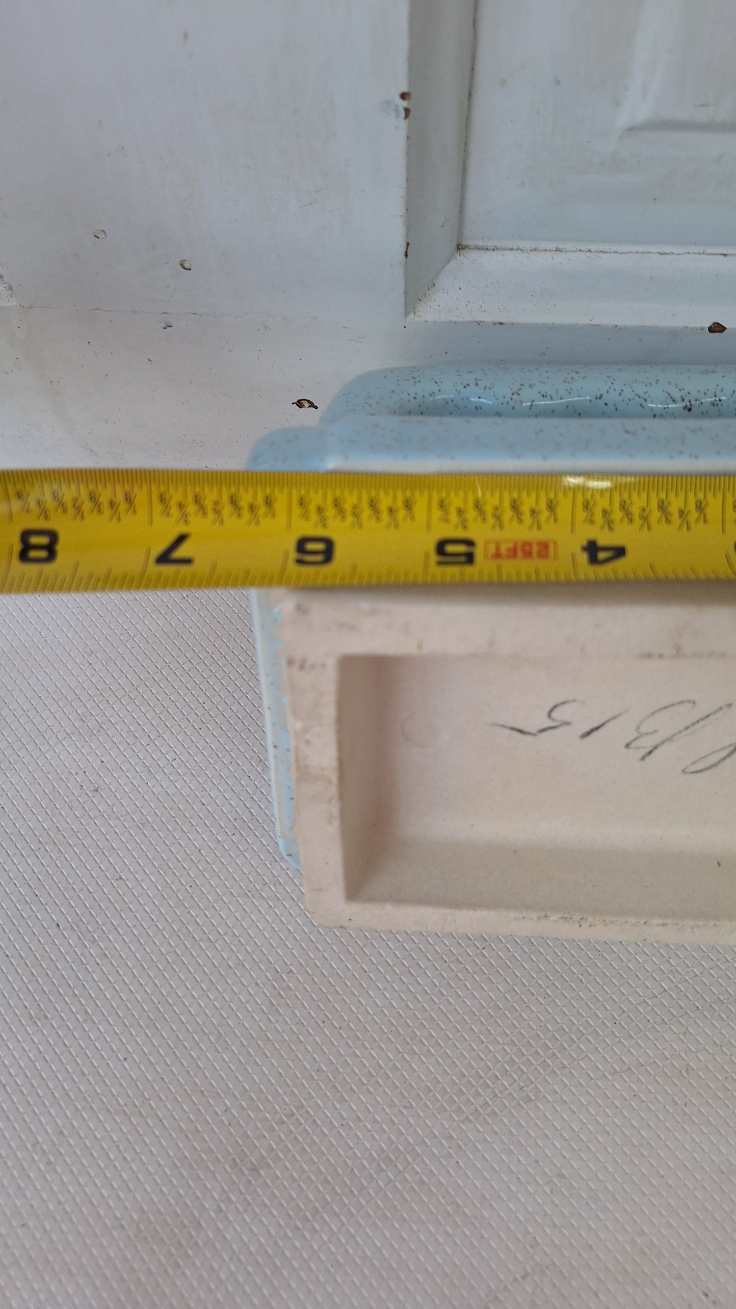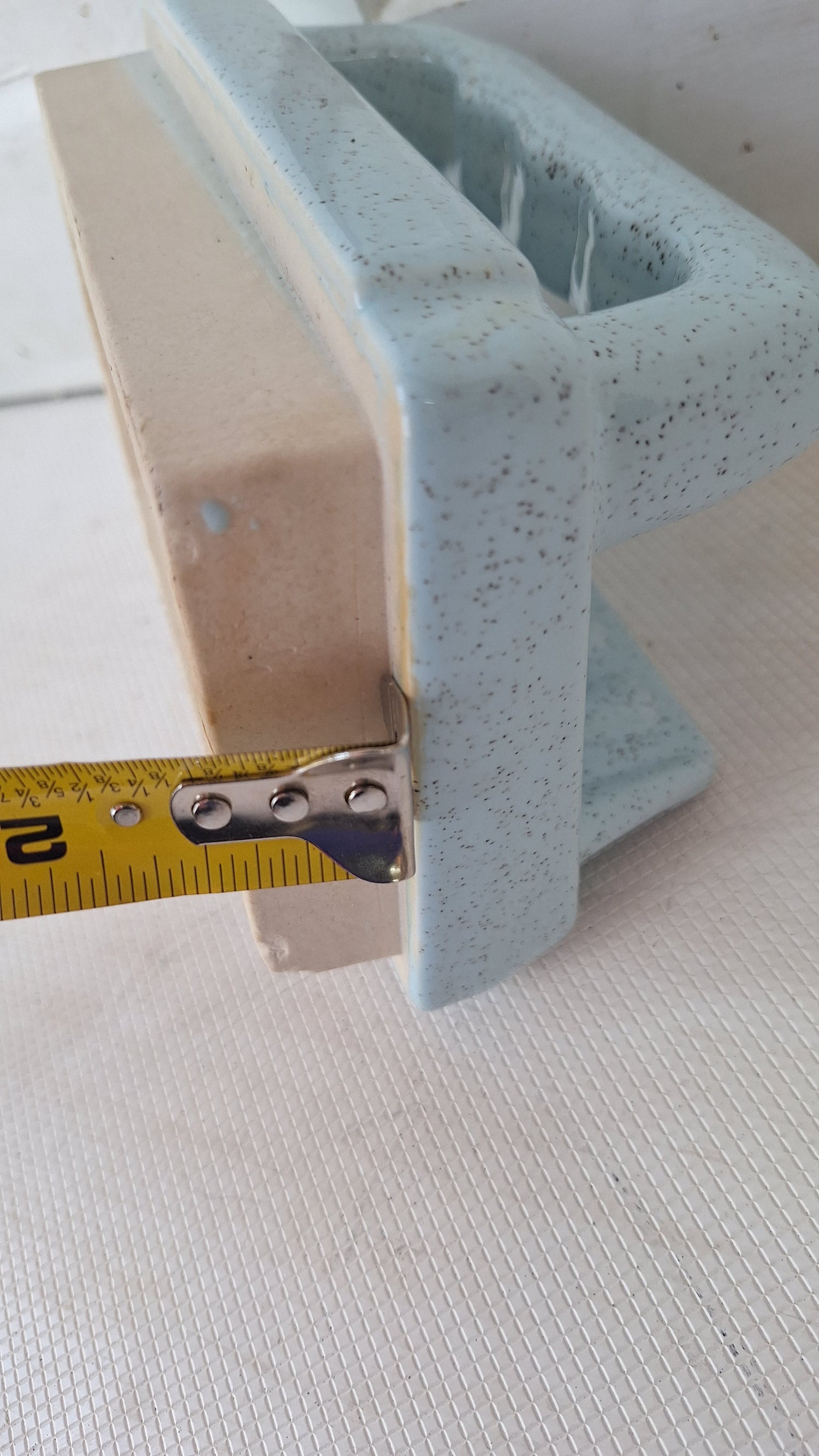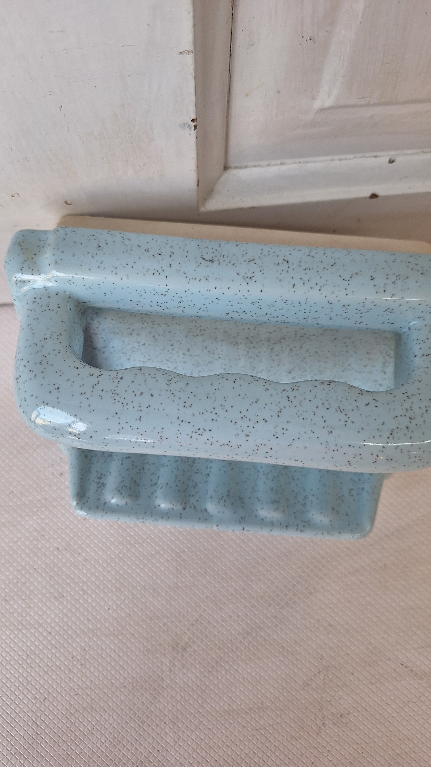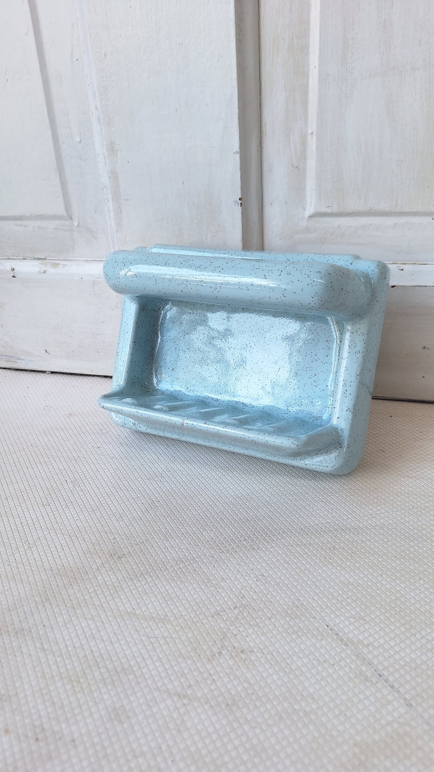 A vintage ceramic built-in soap dish for a shower or bathroom; light blue with brown flecks. This piece is in very good condition. It is very clean on the back and will be easy to prep for reinstallation. These are great space savers and a good way to add vintage charm to a new bathroom (or complete an older one). There is one imperfection in the glaze as shown in the close up photos. Otherwise, this piece is in excellent condition.