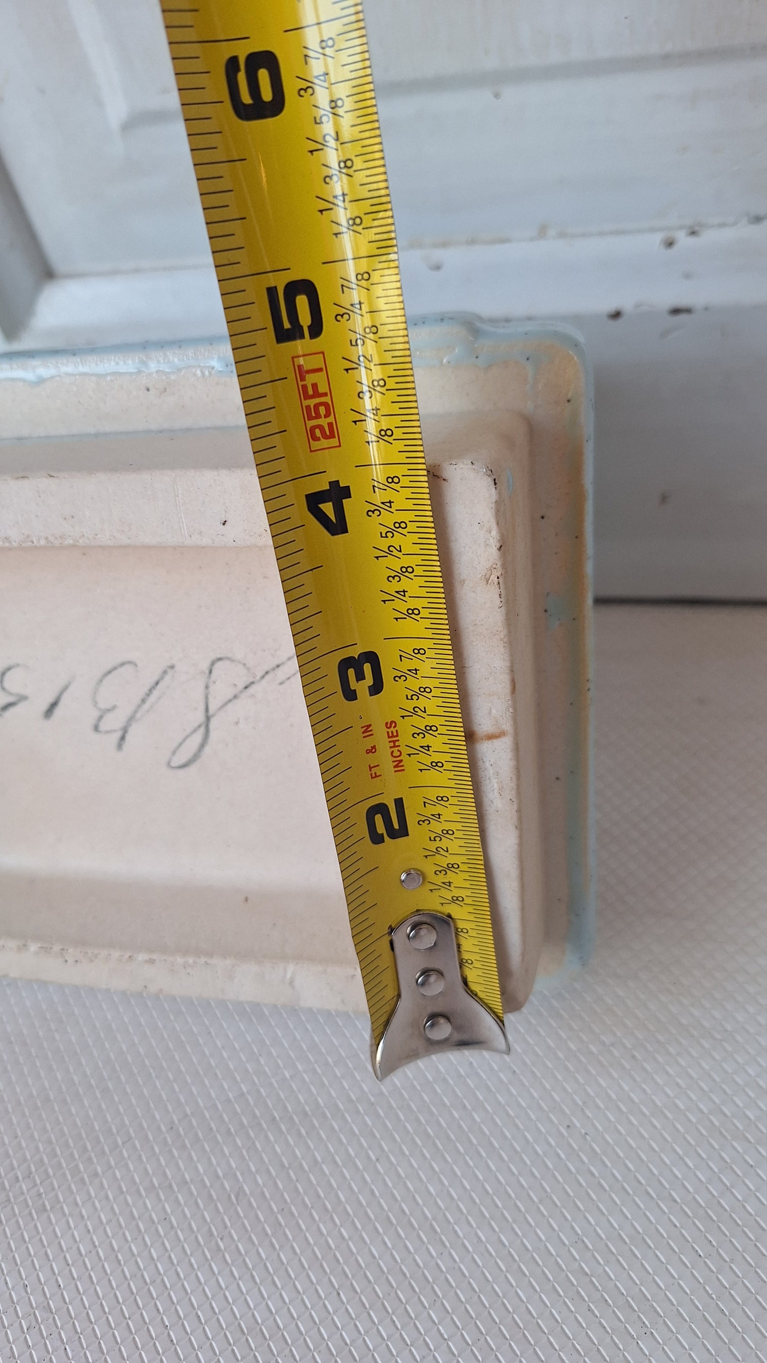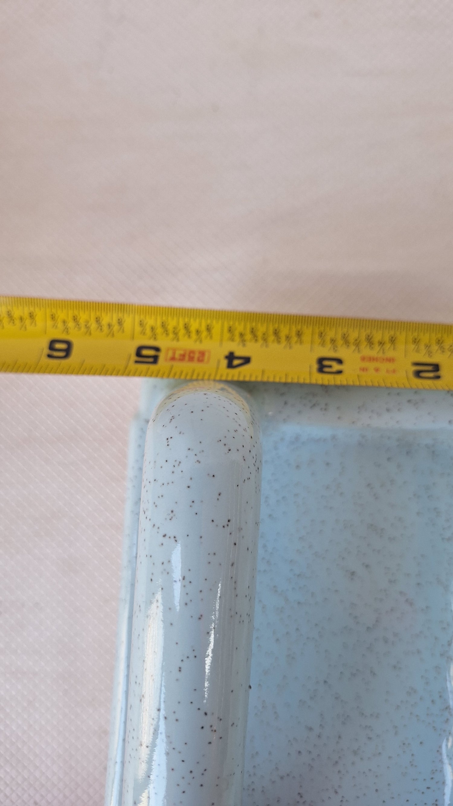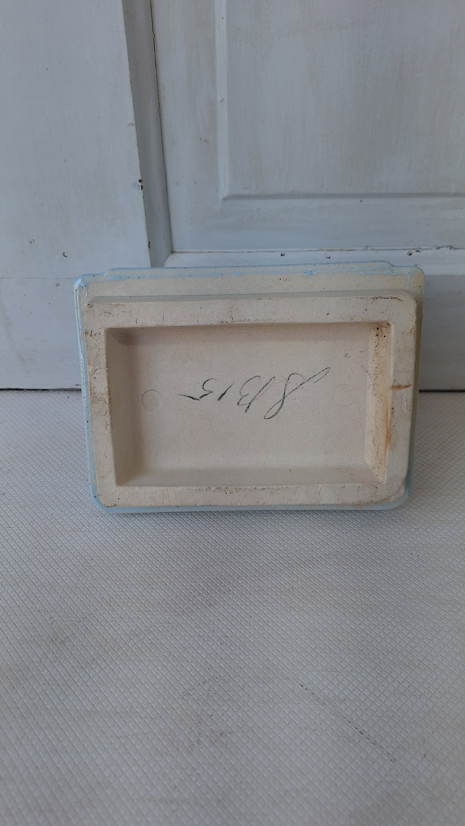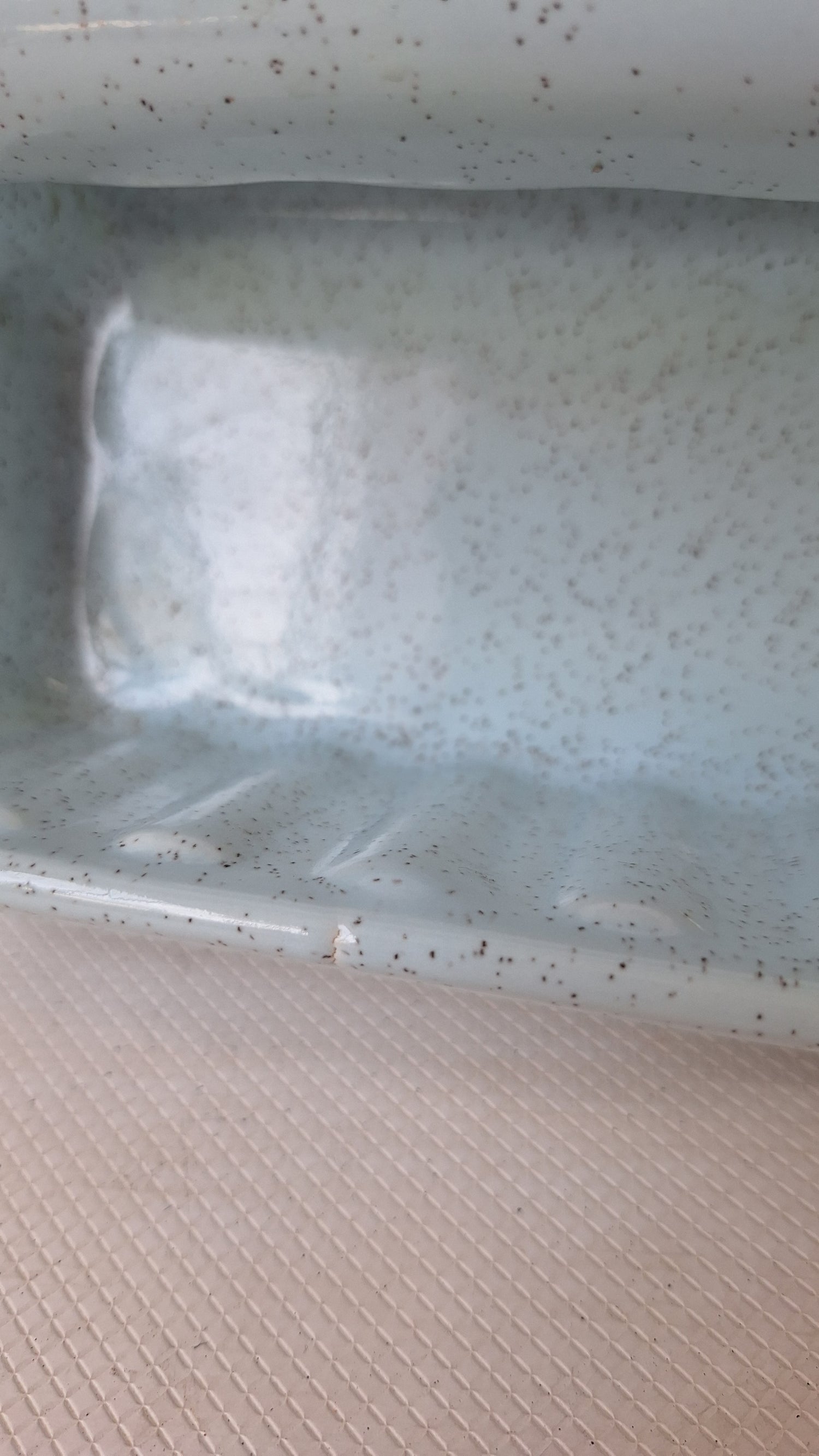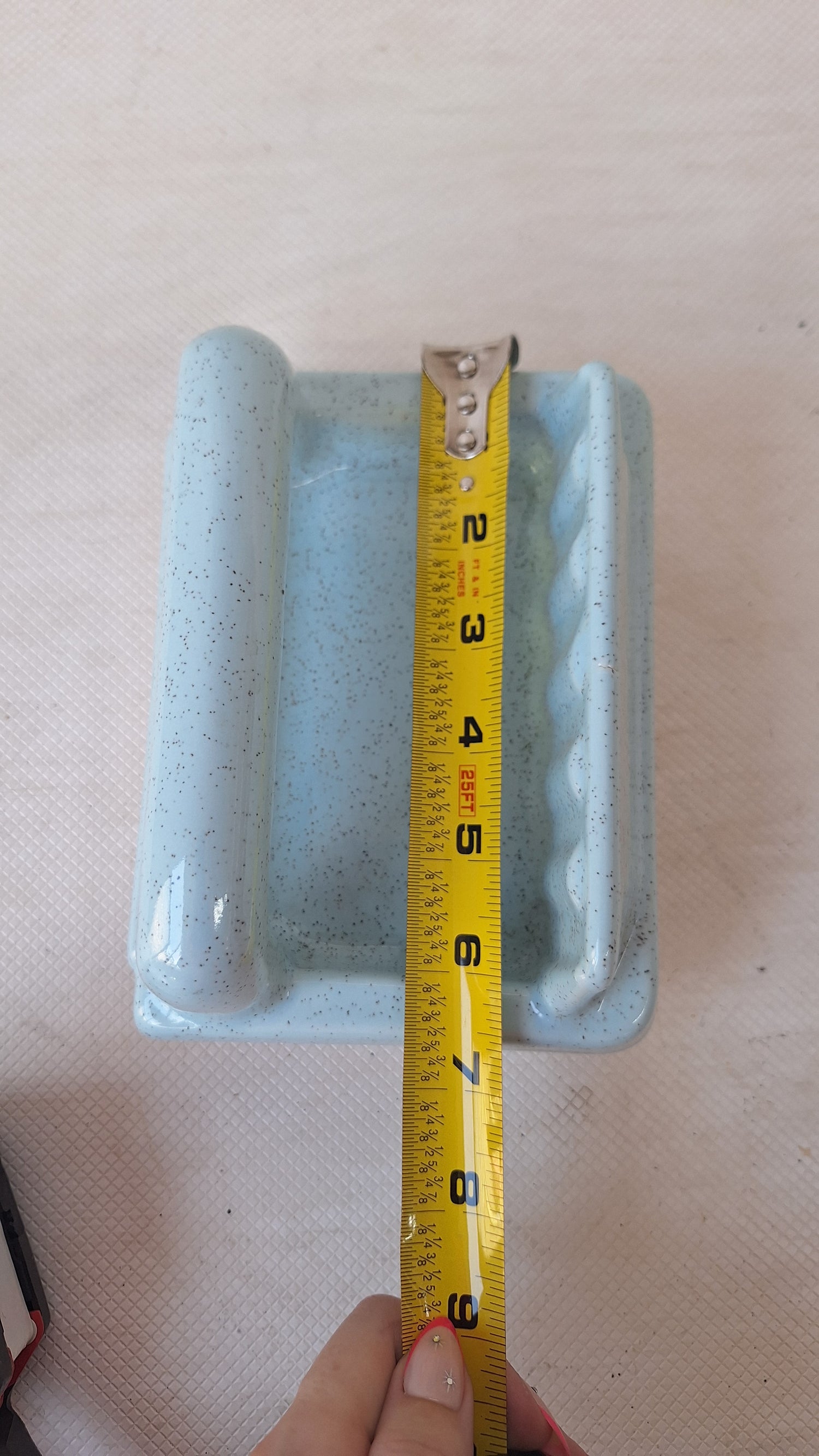A vintage ceramic built-in soap dish for a shower or bathroom; light blue with brown flecks. This piece is in very good condition. It is very clean on the back and will be easy to prep for reinstallation. These are great space savers and a good way to add vintage charm to a new bathroom (or complete an older one). There is one imperfection in the glaze as shown in the close up photos. Otherwise, this piece is in excellent condition.