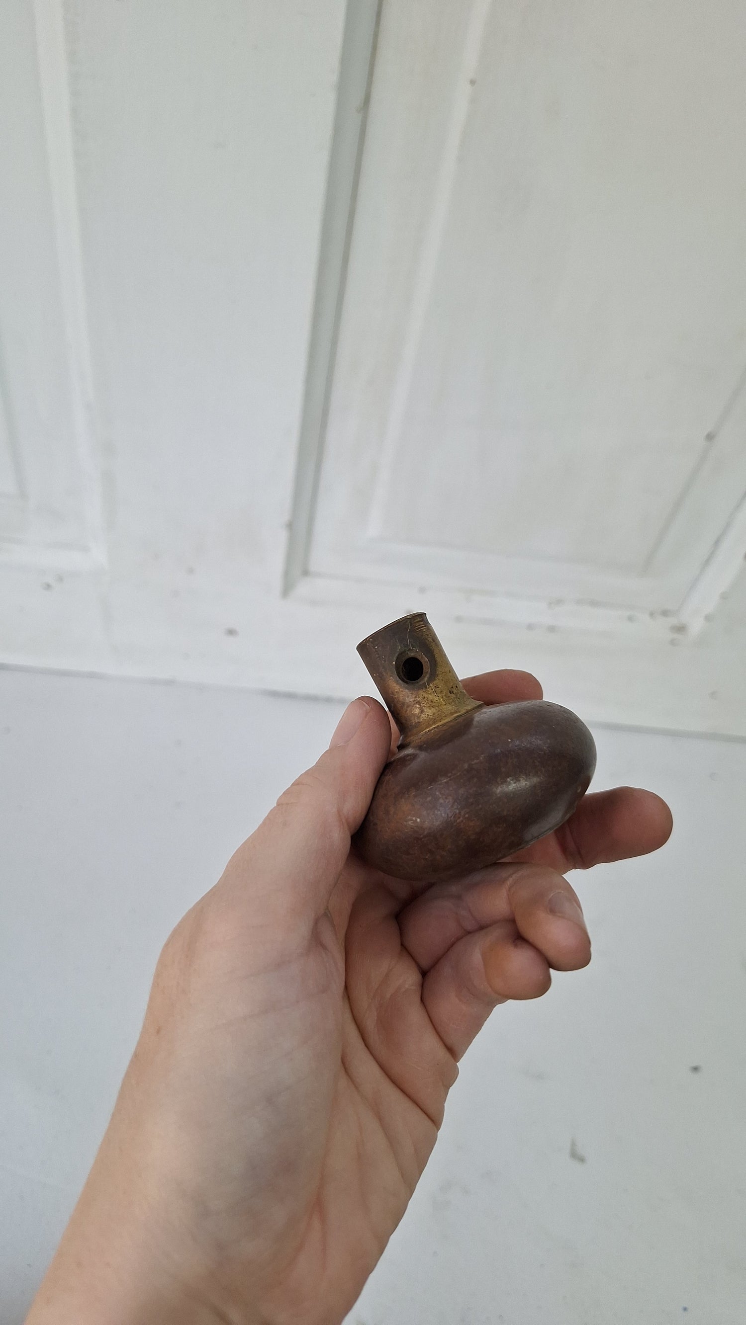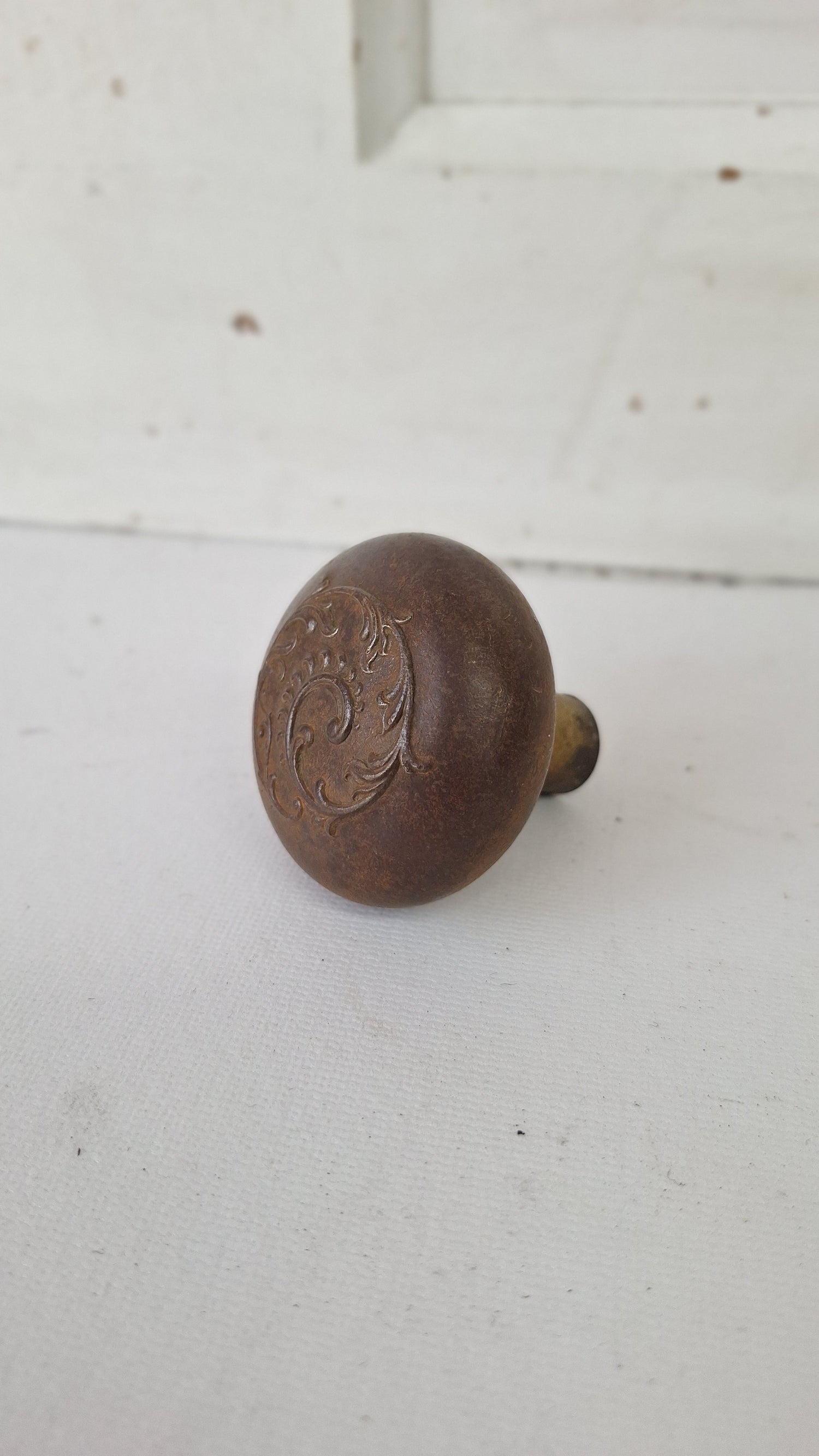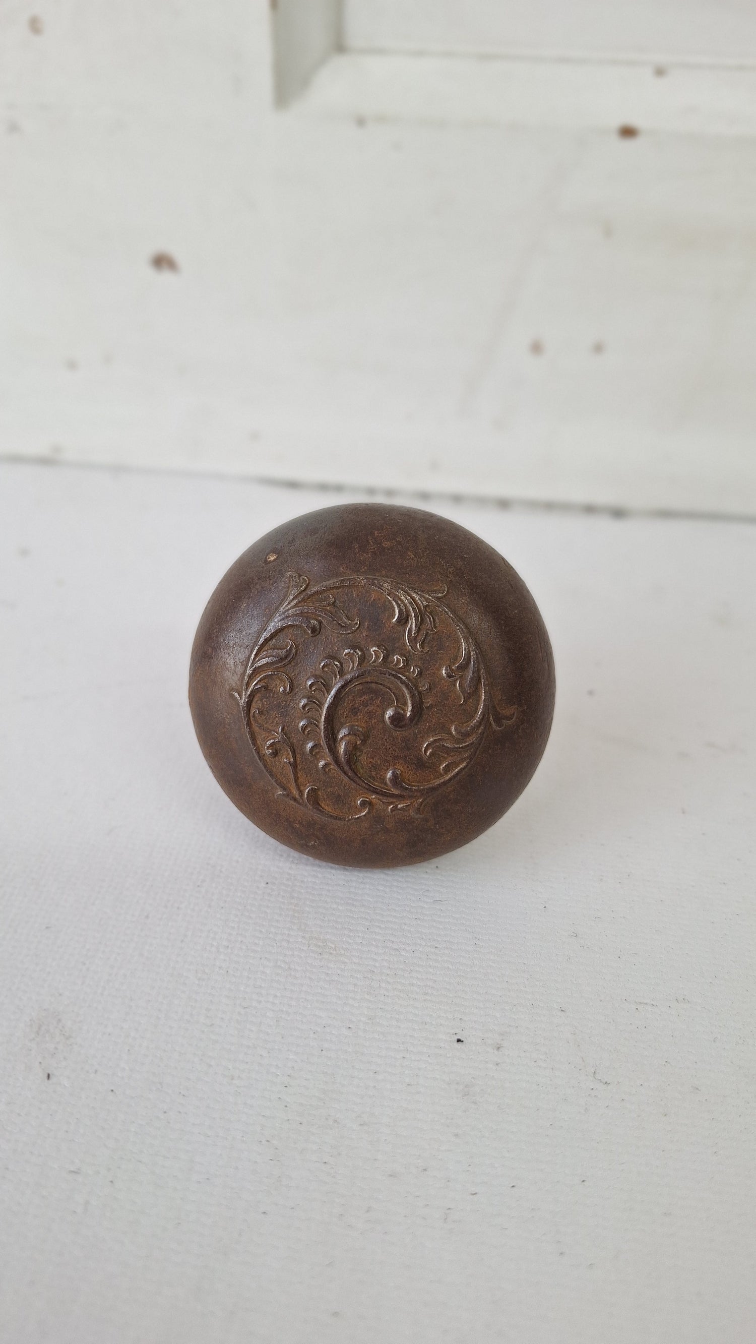 A detailed, heavy iron doorknob with a scroll design and brass shank. We have lightly polished this knob to bring out the detail and shine. This knob uses a standard 1/4" spindle. This item ships free within the US. www.peoriasalvage.com
