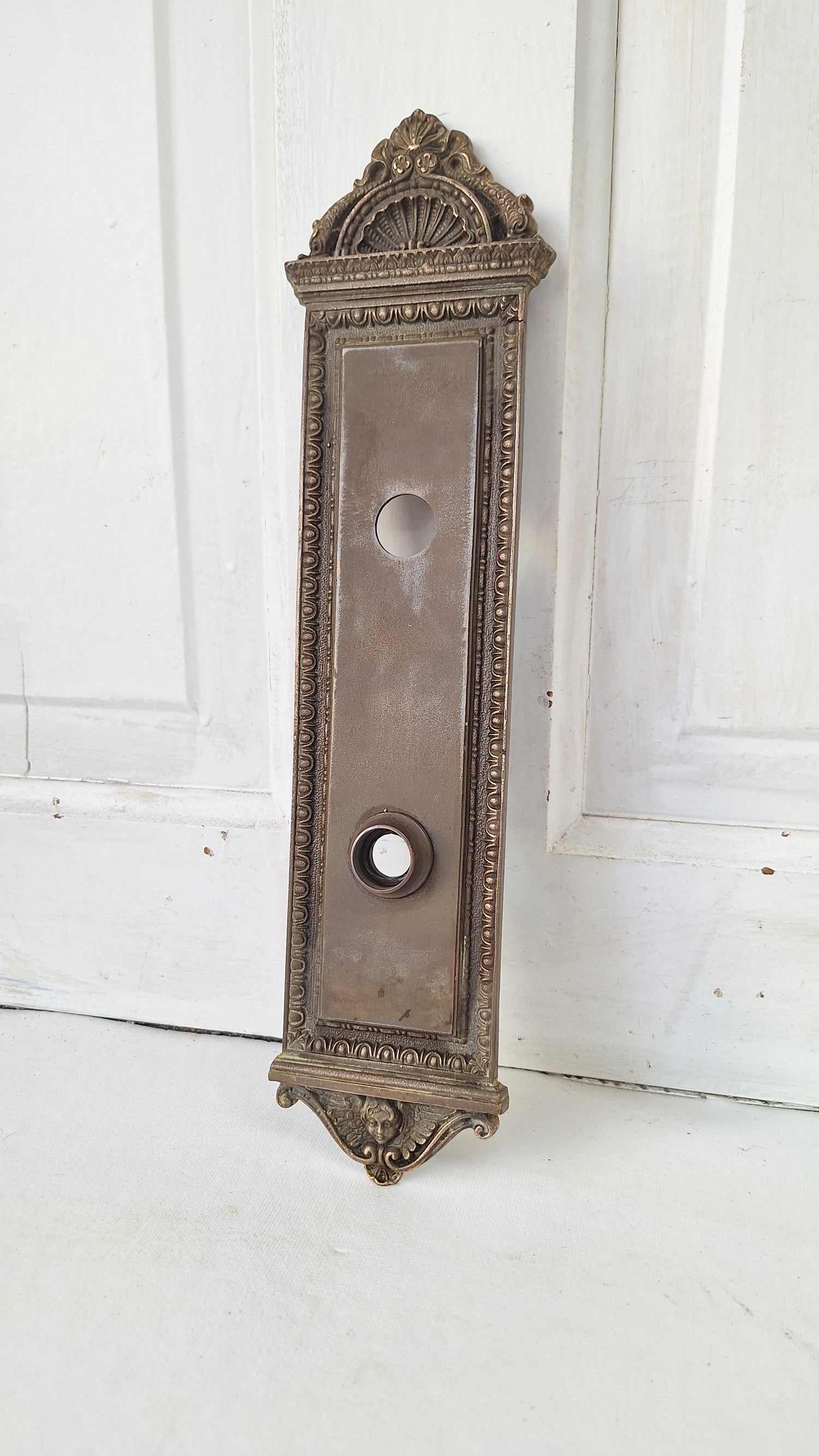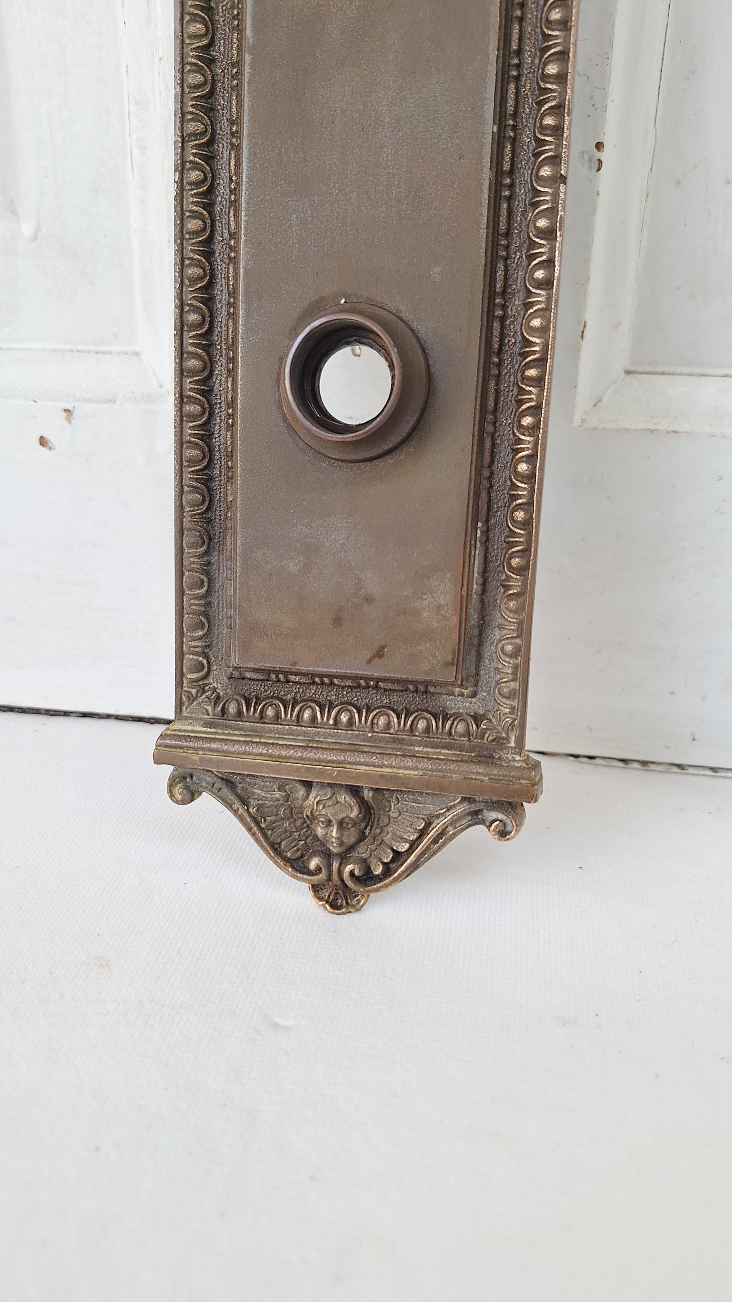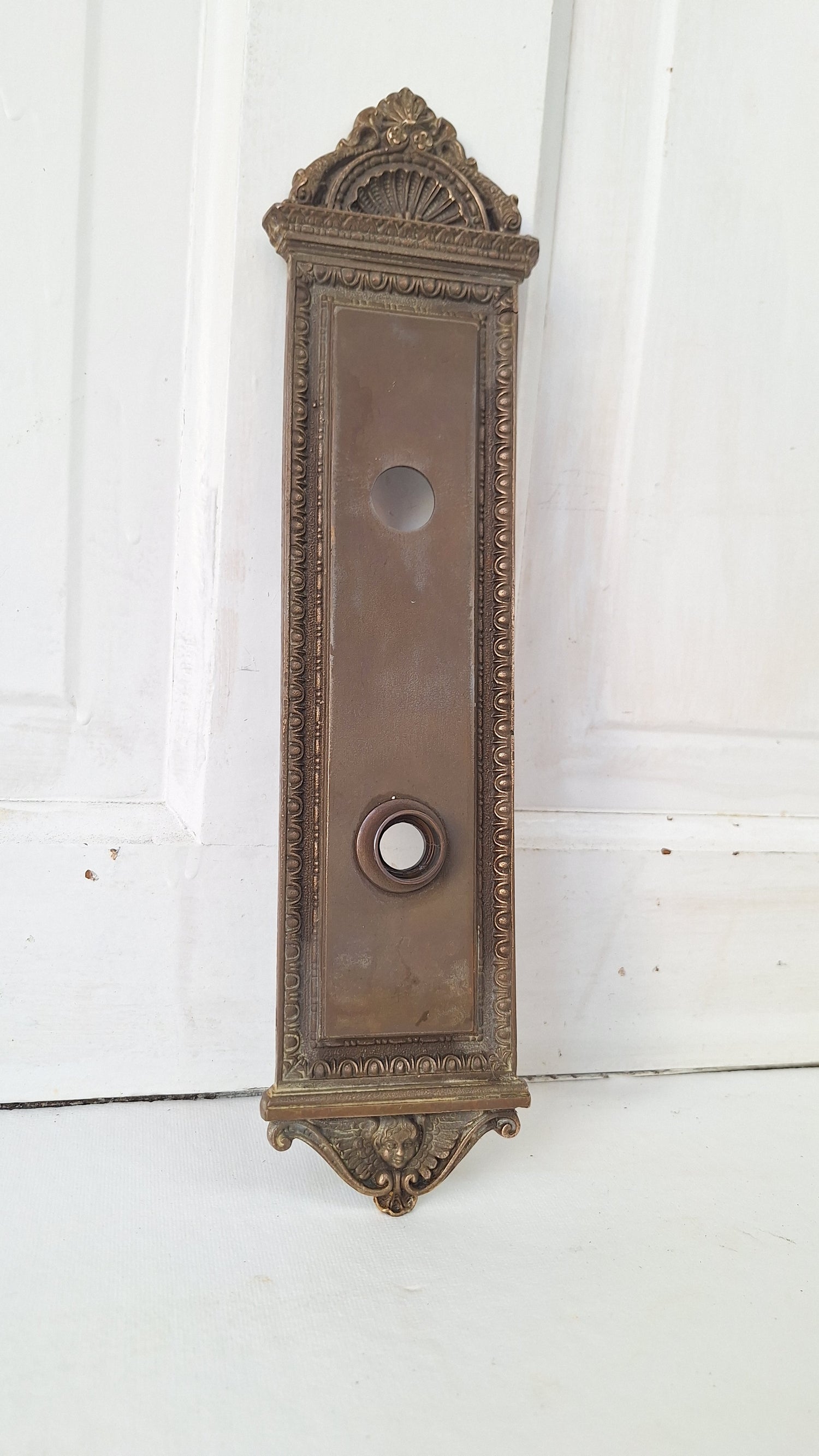 A large and highly ornate solid bronze doorknob backplates with large fish or dolphins along either side of the top and a tiny cherub's face at the bottom. The plate is meant to mount from the backside of a door with bolts and can be used on an interior or exterior door. The details of the design are in excellent condition with just a tiny bit of wear to the angel's face as shown.