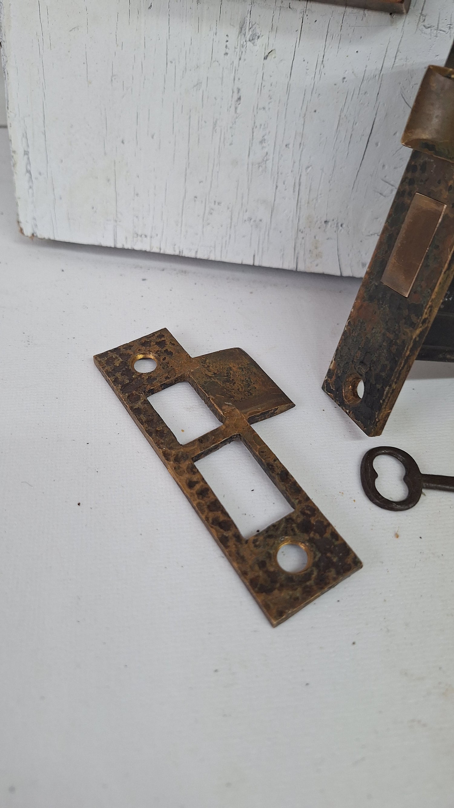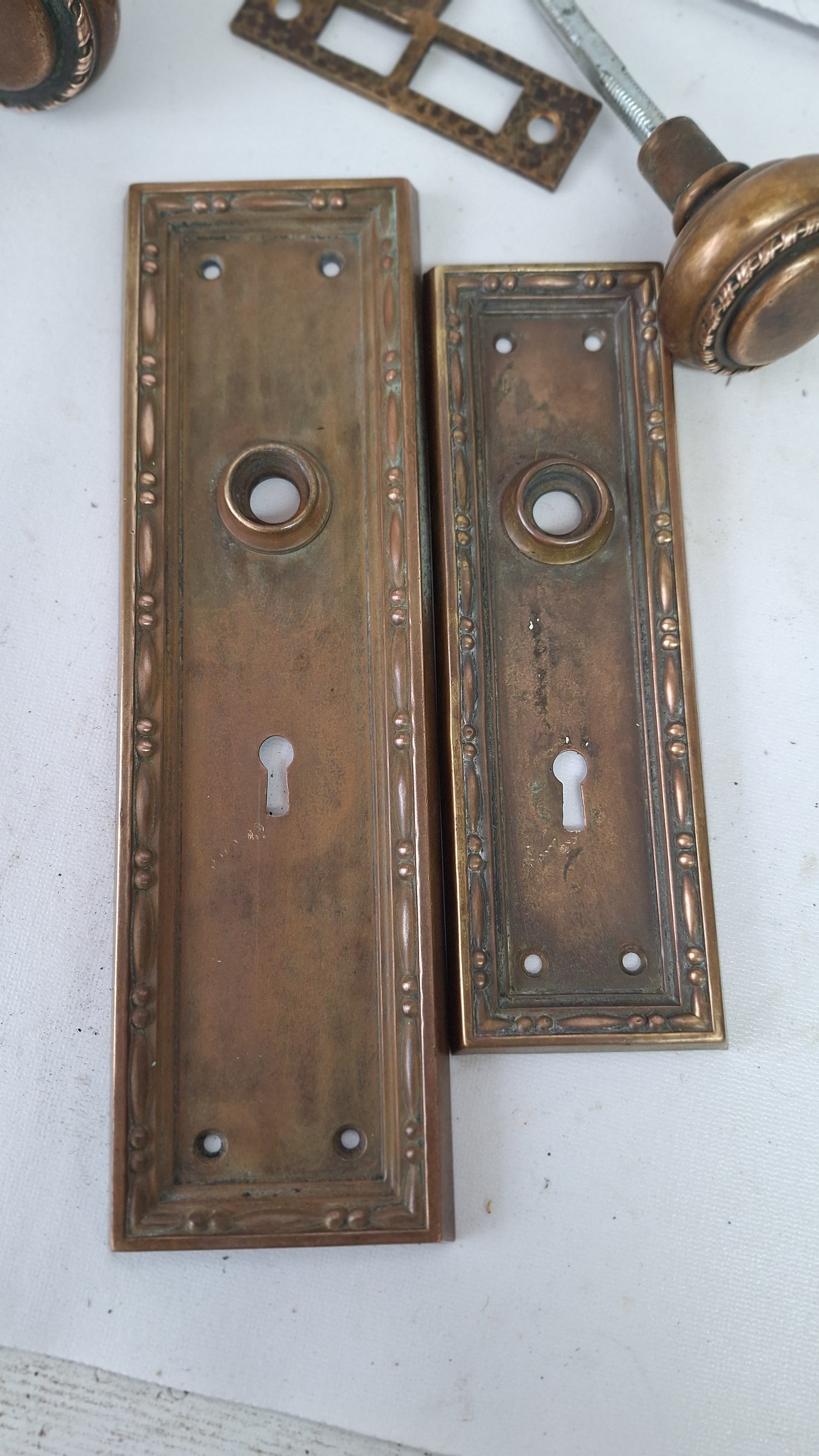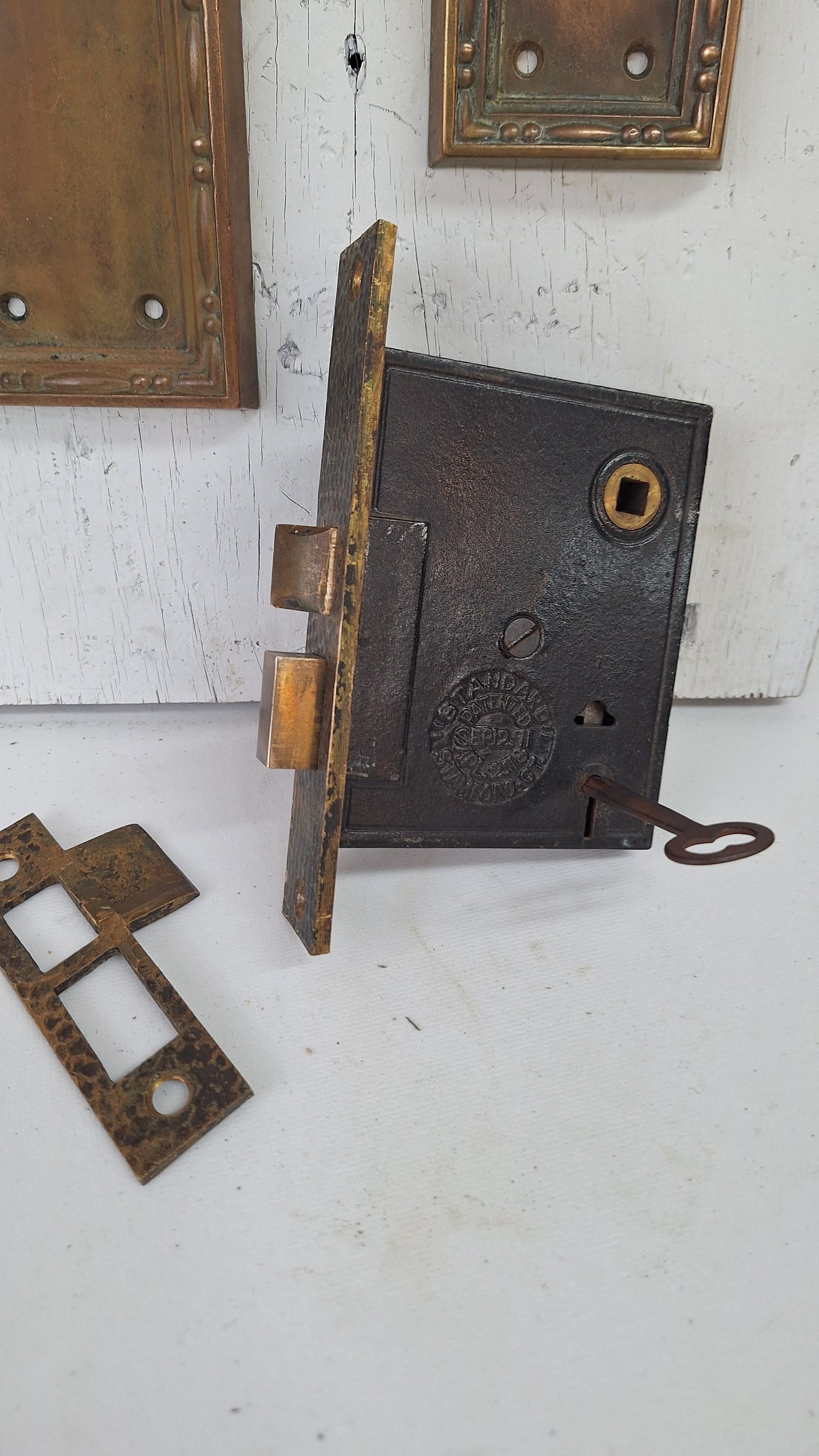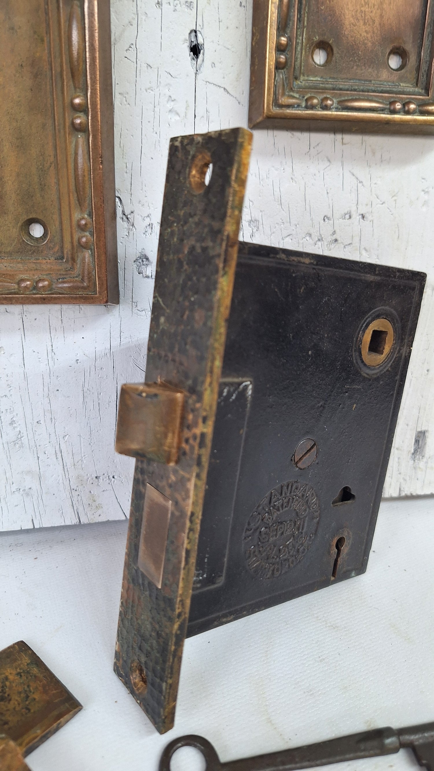 A gorgeous bronze front door entry set complete with working skeleton key. This set has been cleaned and reassembled to ensure it is in working condition. The set consists of an two plates, entry size and regular size knob, spindle, mortise latch, skeleton key, and strike plate.