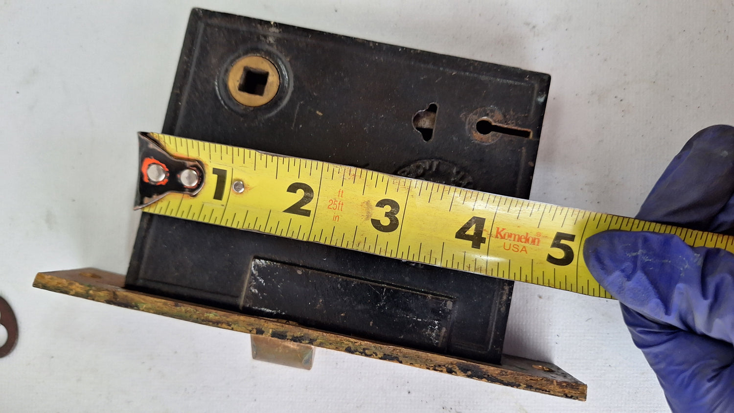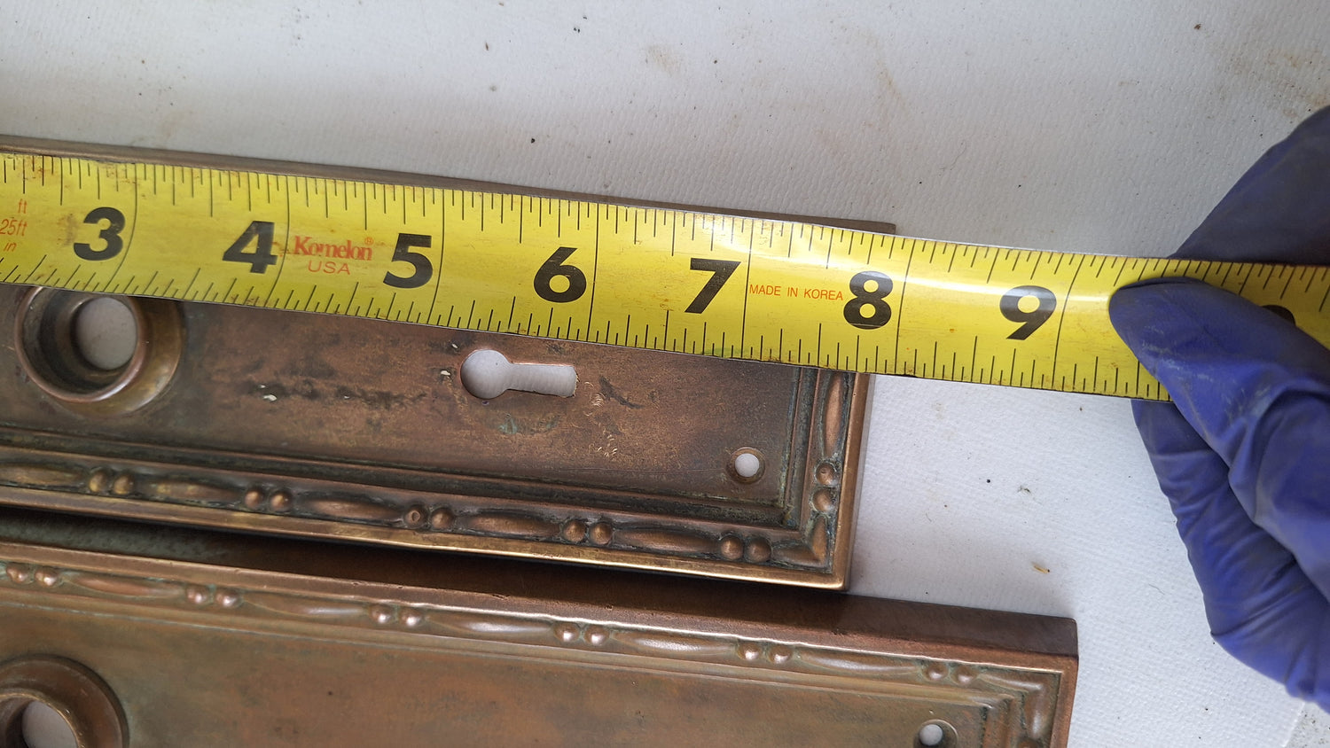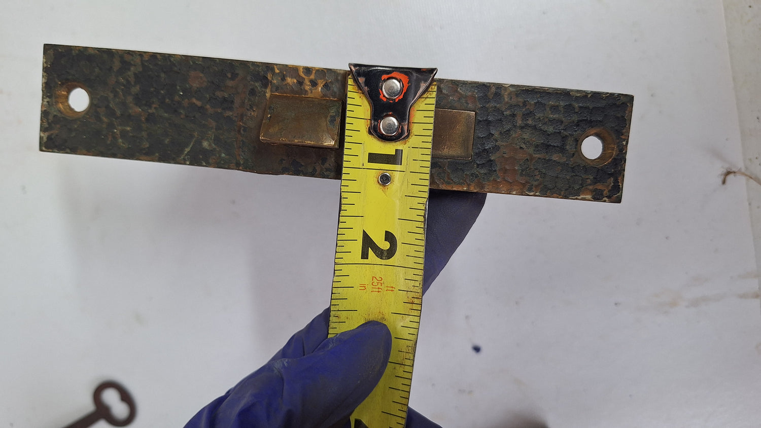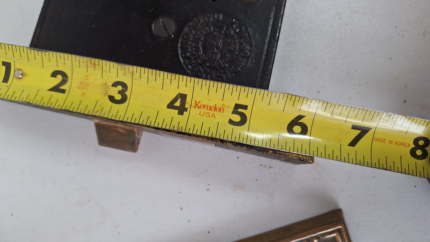 A gorgeous bronze front door entry set complete with working skeleton key. This set has been cleaned and reassembled to ensure it is in working condition. The set consists of an two plates, entry size and regular size knob, spindle, mortise latch, skeleton key, and strike plate.