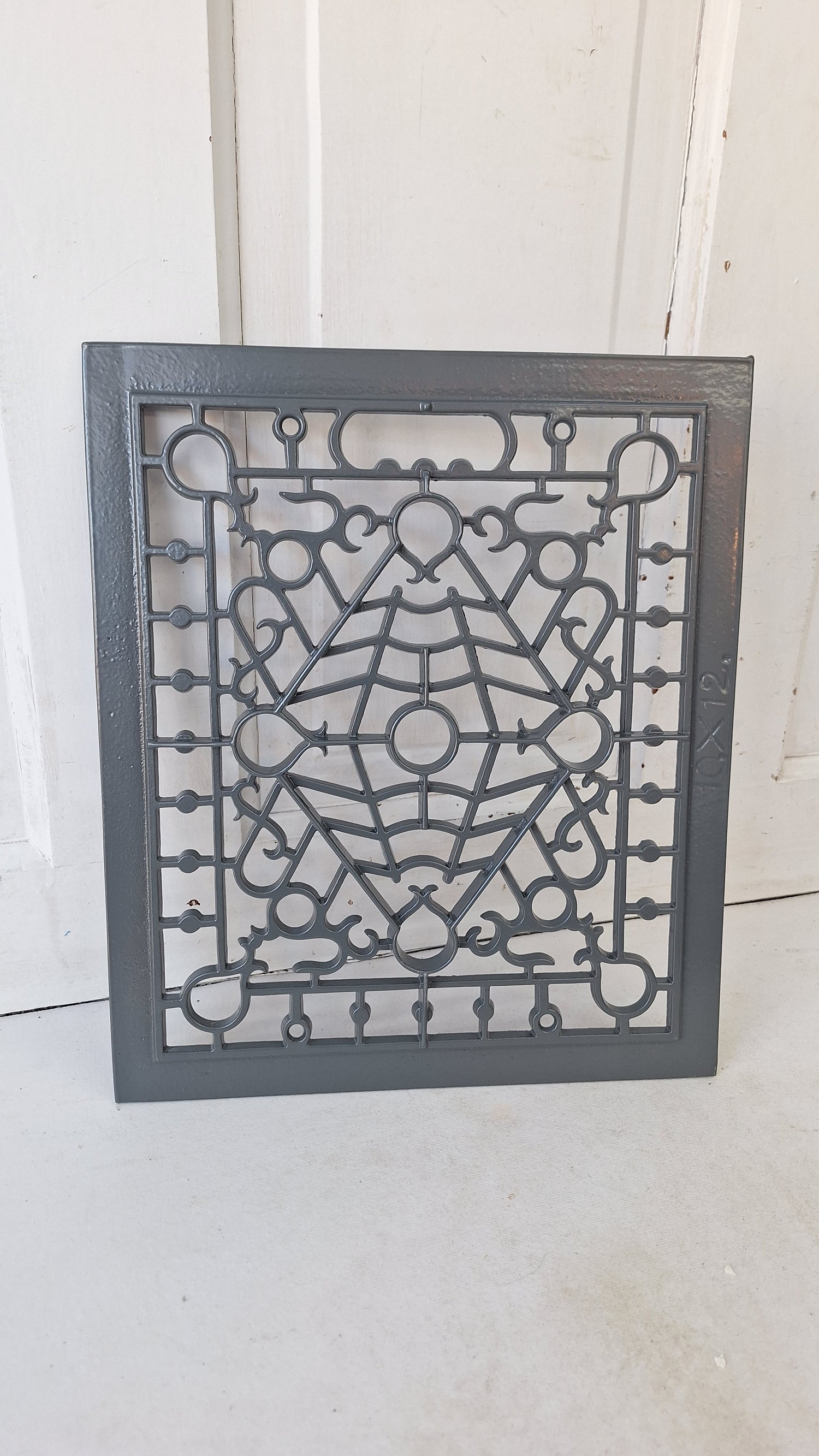 An ornately designed cast iron vent cover from the turn of the century. This iron cover features a more unusual design making it perfect for a highly visible spot in your home. The iron is in excellent physical condition. This piece has been cleaned and refinished in a semi gloss gray.