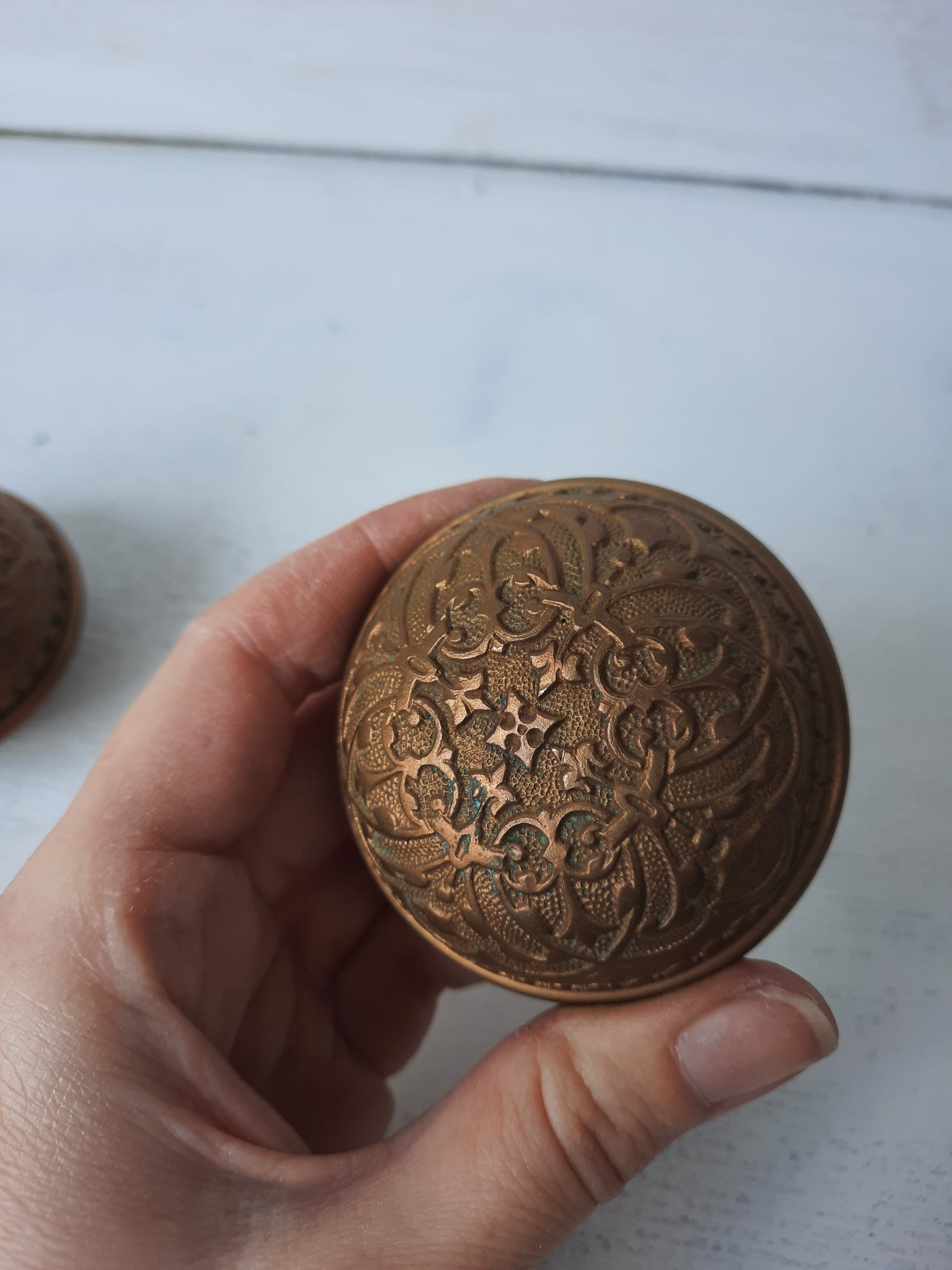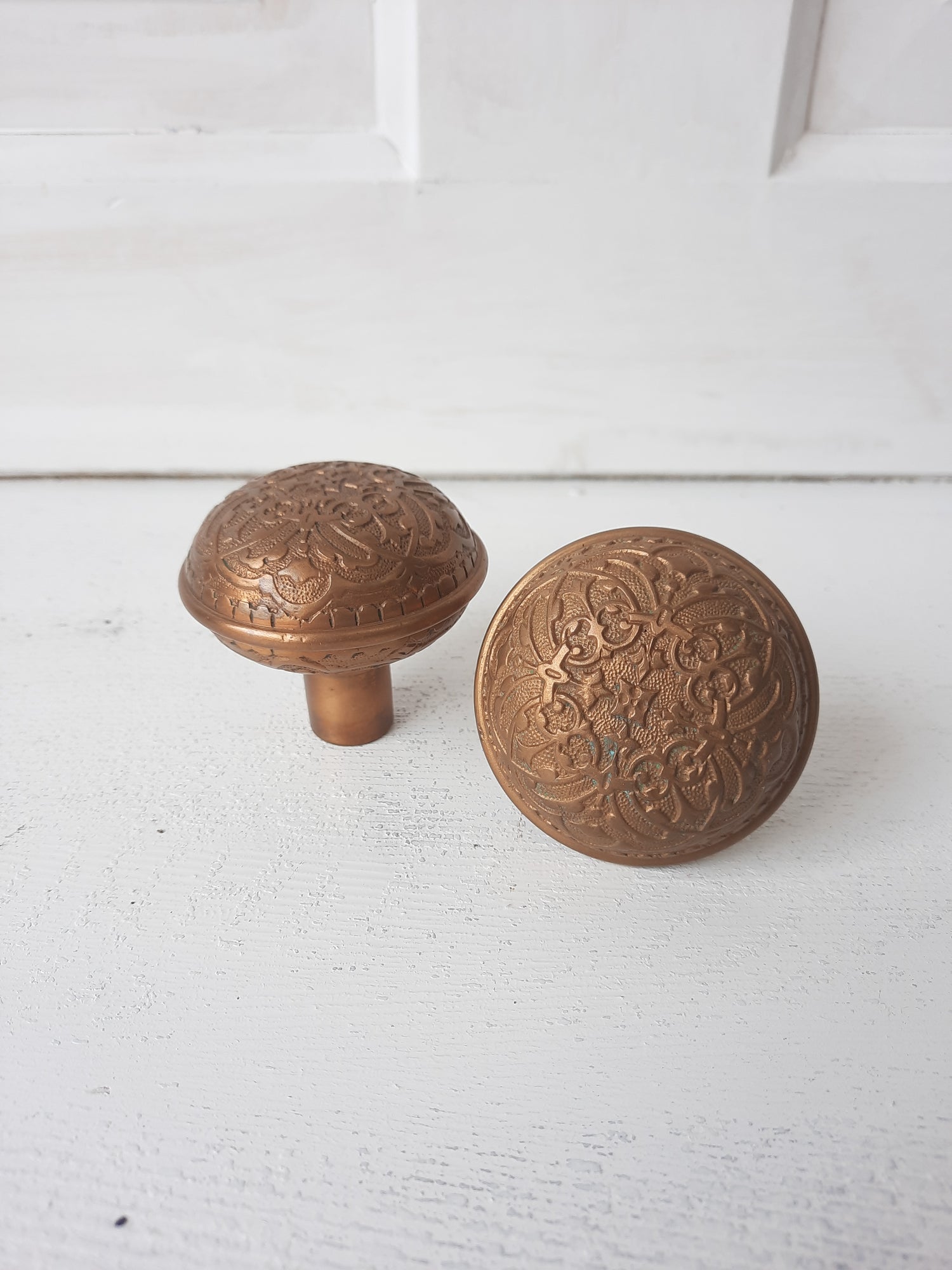 A pair of intricately designed solid bronze doorknobs from the Victorian era. The ornate pattern is finely wrought with a four-fold pattern on the front with a detailed pattern on the back (present on higher end knobs instead of a front-only design). This pair can be used indoors or out for an authentic antique look for your door. We have several pairs available and patinas vary as shown. The knobs use a standard 1/4" spindle Please see all of our pictures for details. This pair ships free within the US.