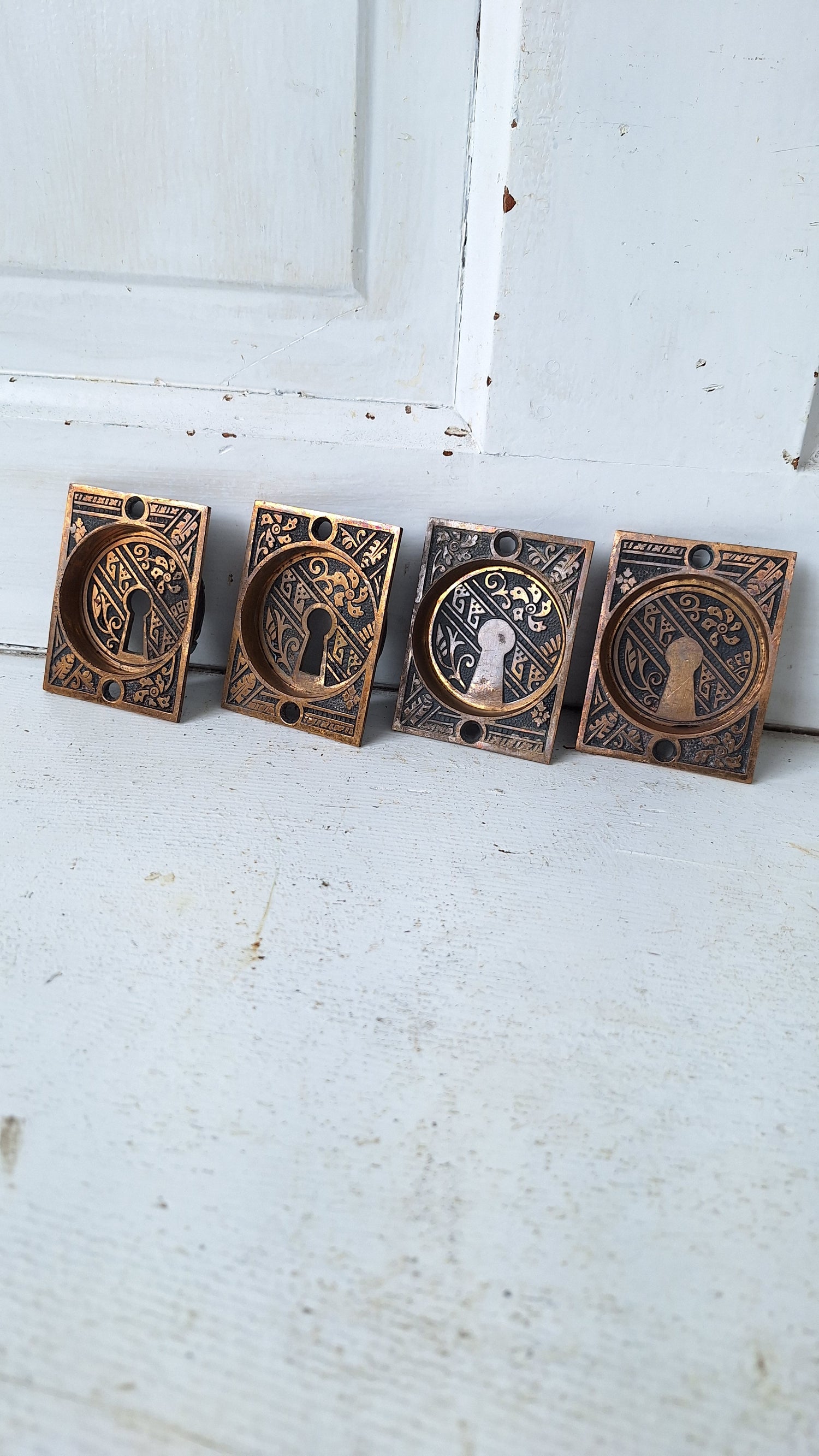 A complete double pocket door set of cast bronze, recessed pulls with a coppery finish and intricate Eastlake style detailing. They have been lightly polished to bring out the detail and color of the bronze and details in the design. Please see all of our pictures for details and dimensions. This set of four ships free within the US. www.peoriasalvage.com