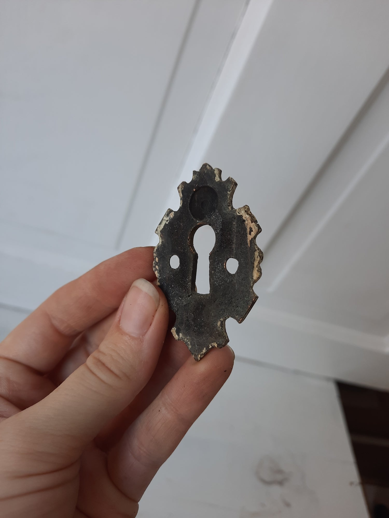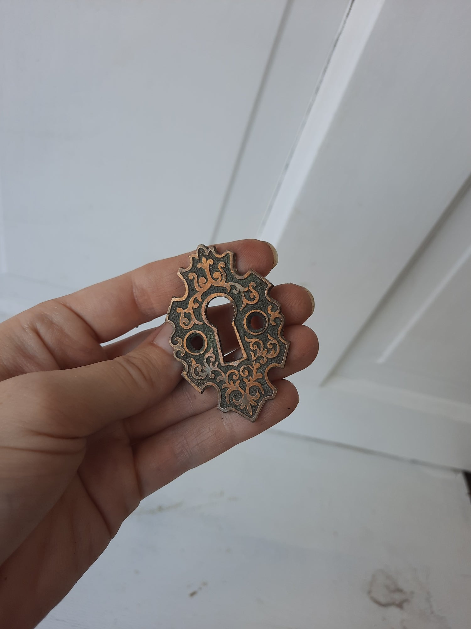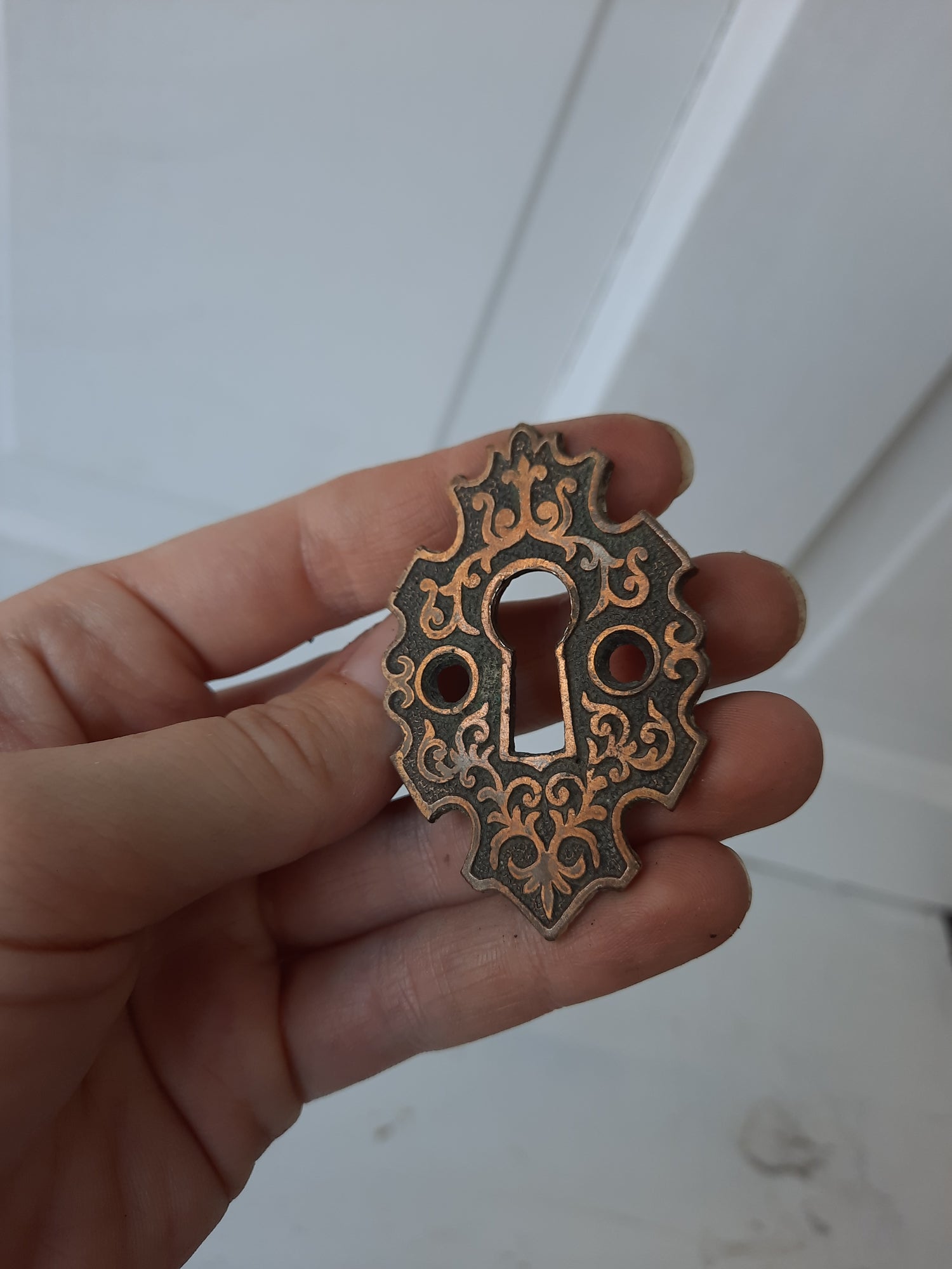 An ornately designed, delicate brass key hole cover with a gorgeous aesthetic design across the face. This is a perfect finishing touch for a door restoration, but would also make a beautiful jewelry piece.