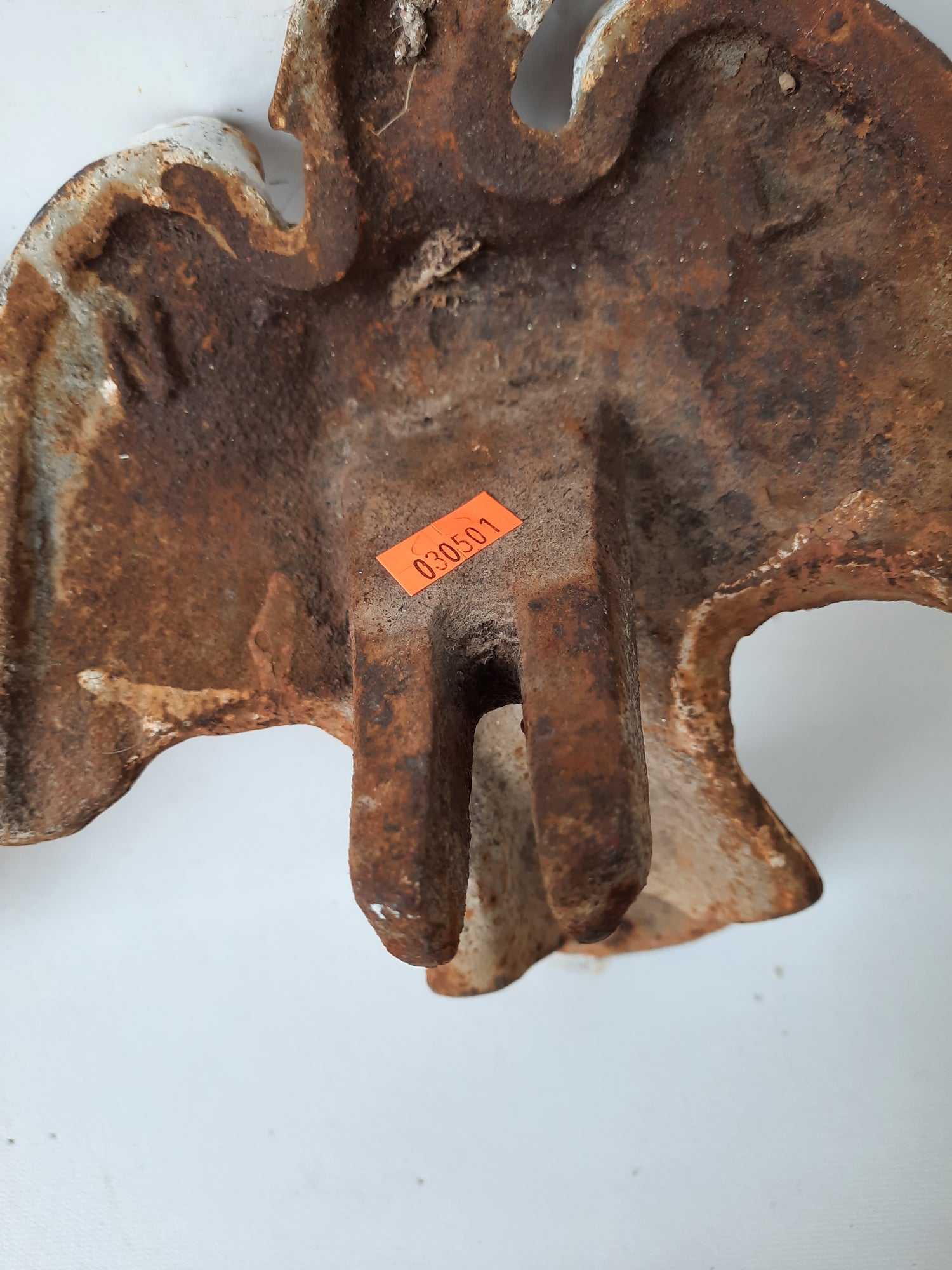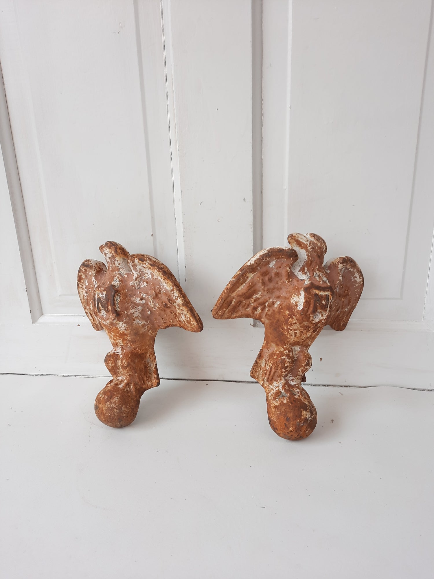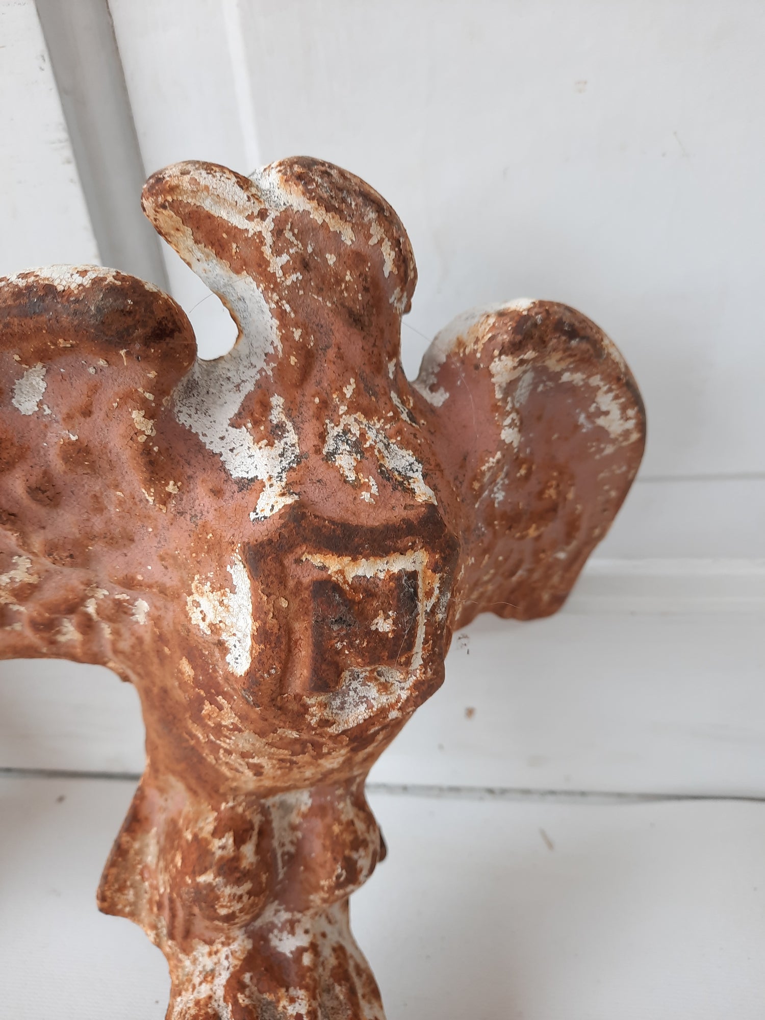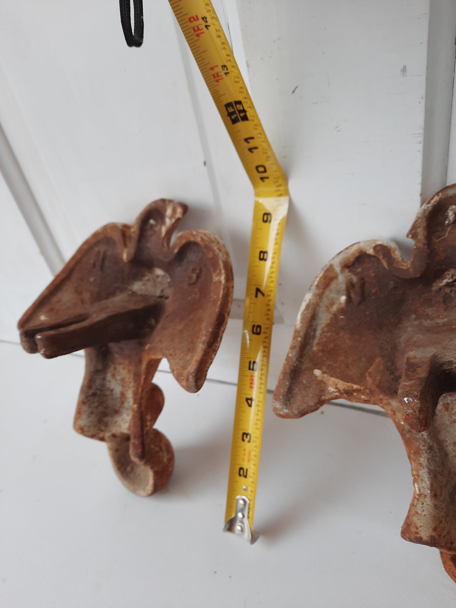 A set of cast iron tub feet in an unusual soaring eagle design with a shield on the front of each. Each eagle is perched a typical 'ball' end. These are in 'as found' condition and the paint is loose in several areas. Please see all of our pictures for sizing and details. This pair ships free within the US. No PO boxes please.