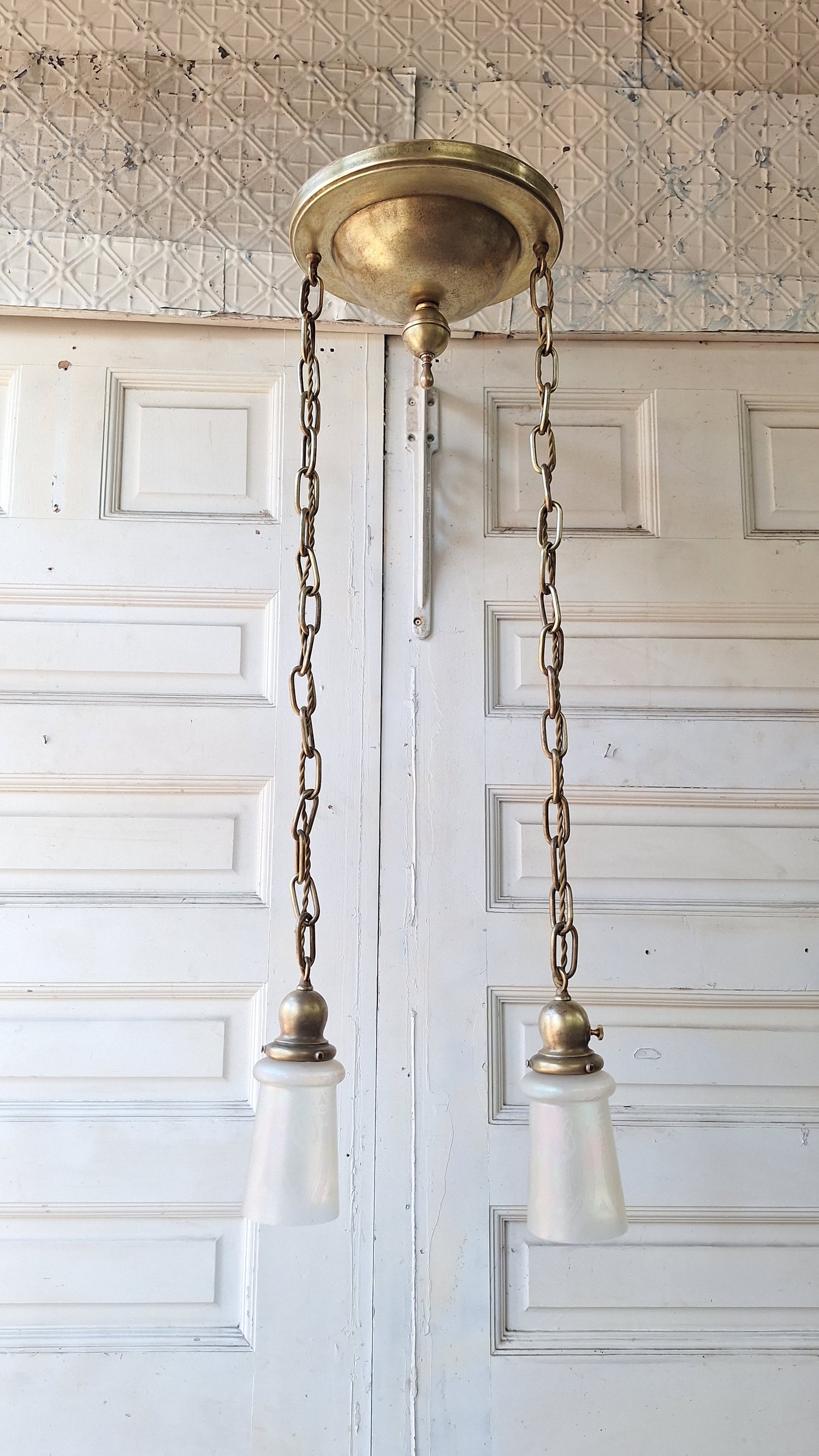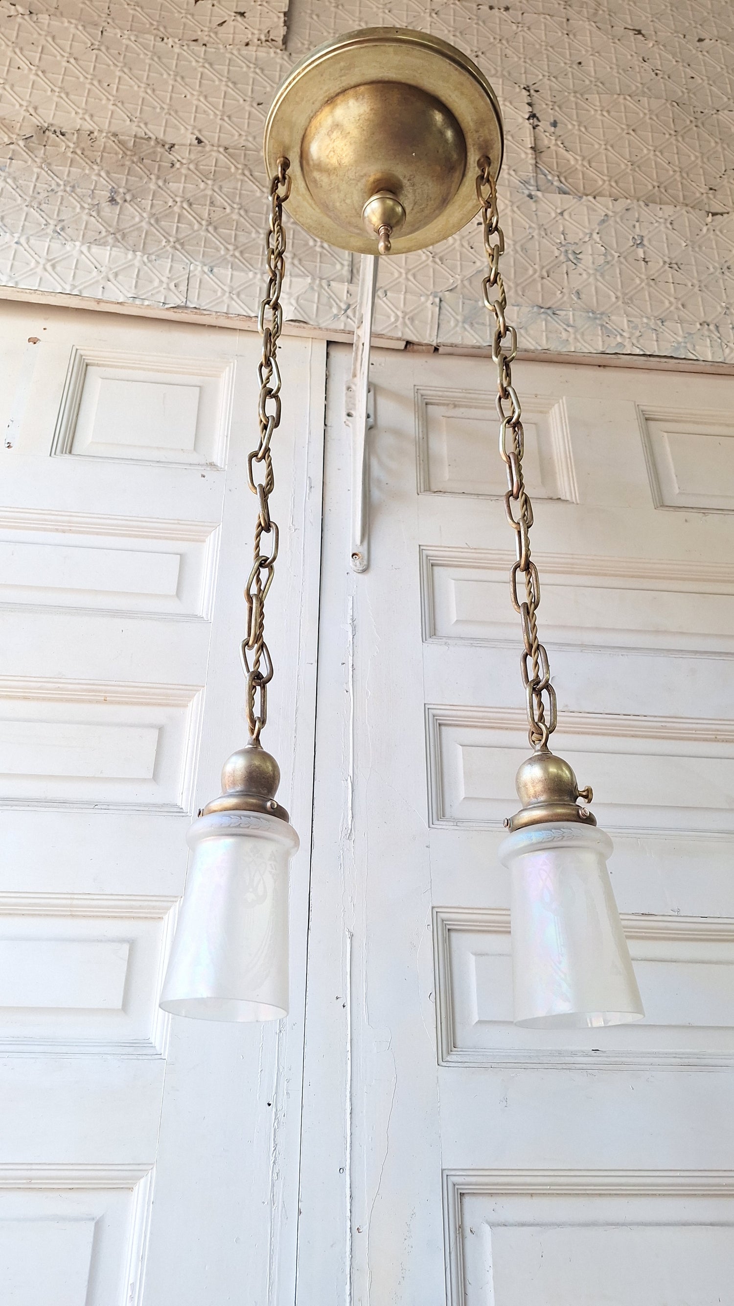 Antique Double Pendant Light, Chandelier with Irridescent Shades