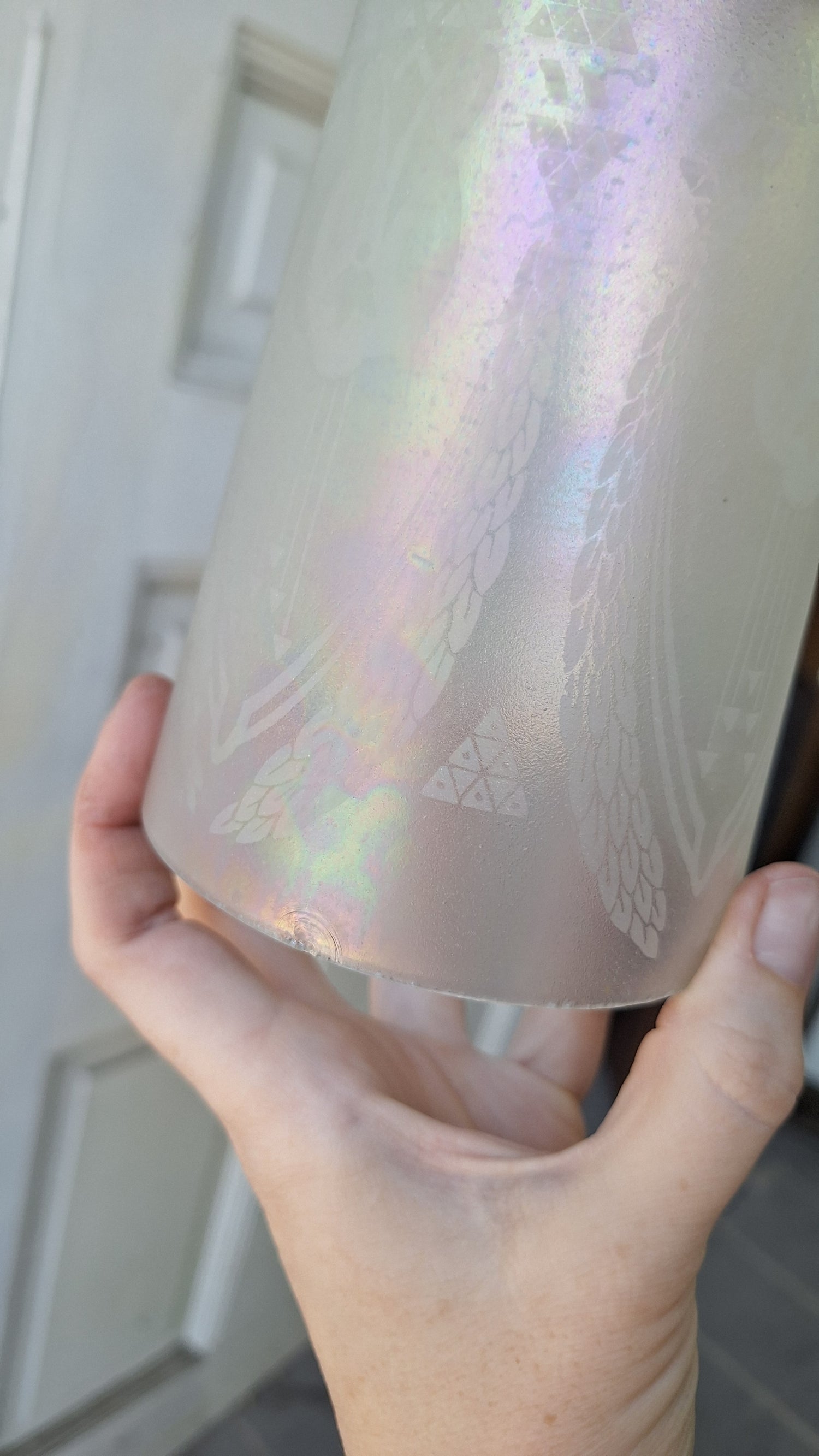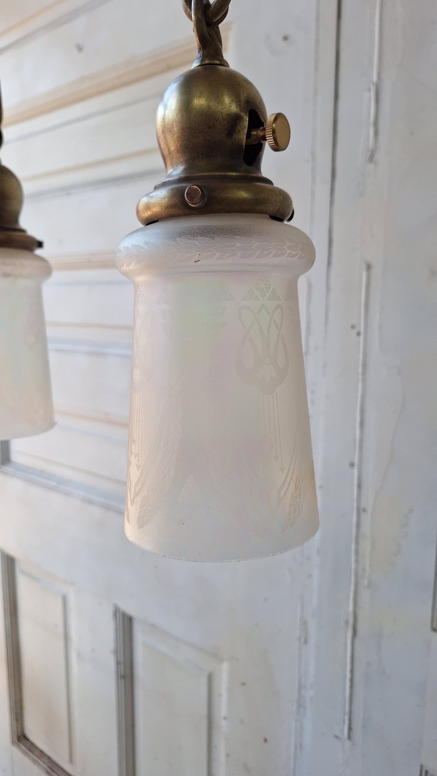 A charming double chain pendant light with stunning irridescent, etched glass shades. This piece has been cleaned, rewired, and is ready for installation. The brass body does show some darker marks from age and there is one chip in the bottom of a glass shade as shown. Please see all of our pictures for details.