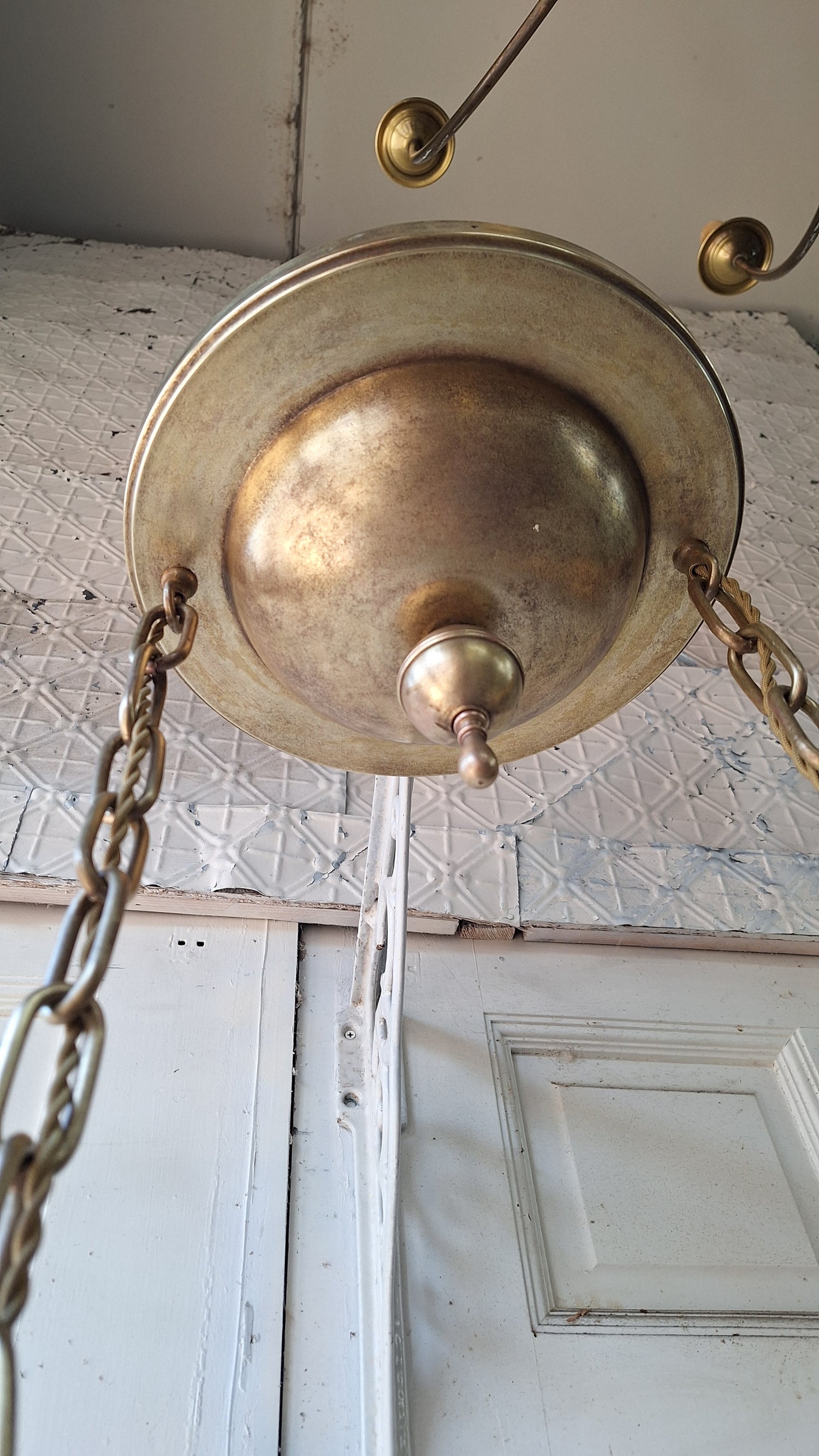 This antique flush mount chandelier measures 12" across the top and the entire light is 39" tall. The chains are approx. 27" and can be shortened prior to shipment. This item ships free within the continental US. No PO boxes please.