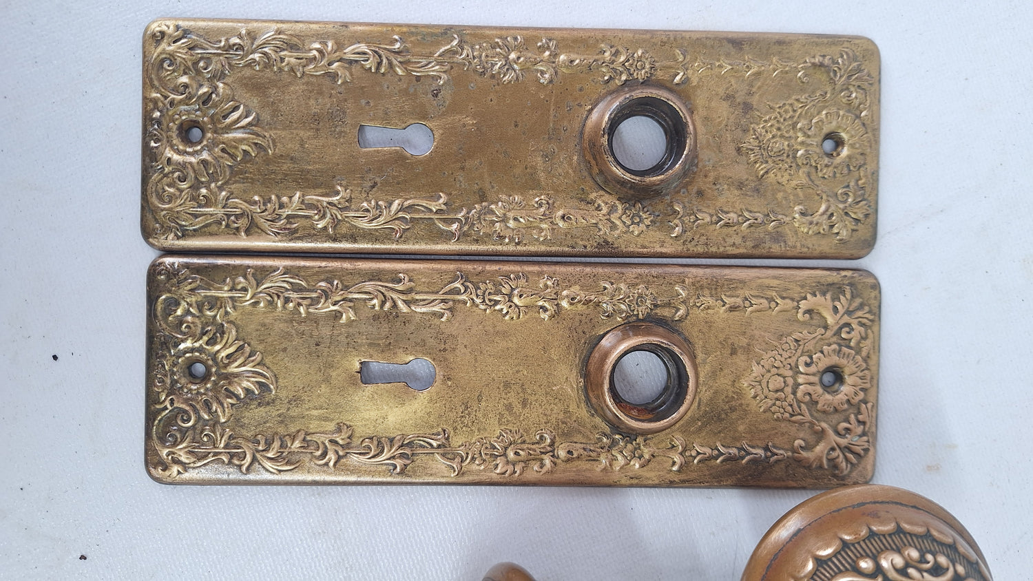 Ornate Brass Plated Door Hardware Set, Antique Doorknob and Backplates