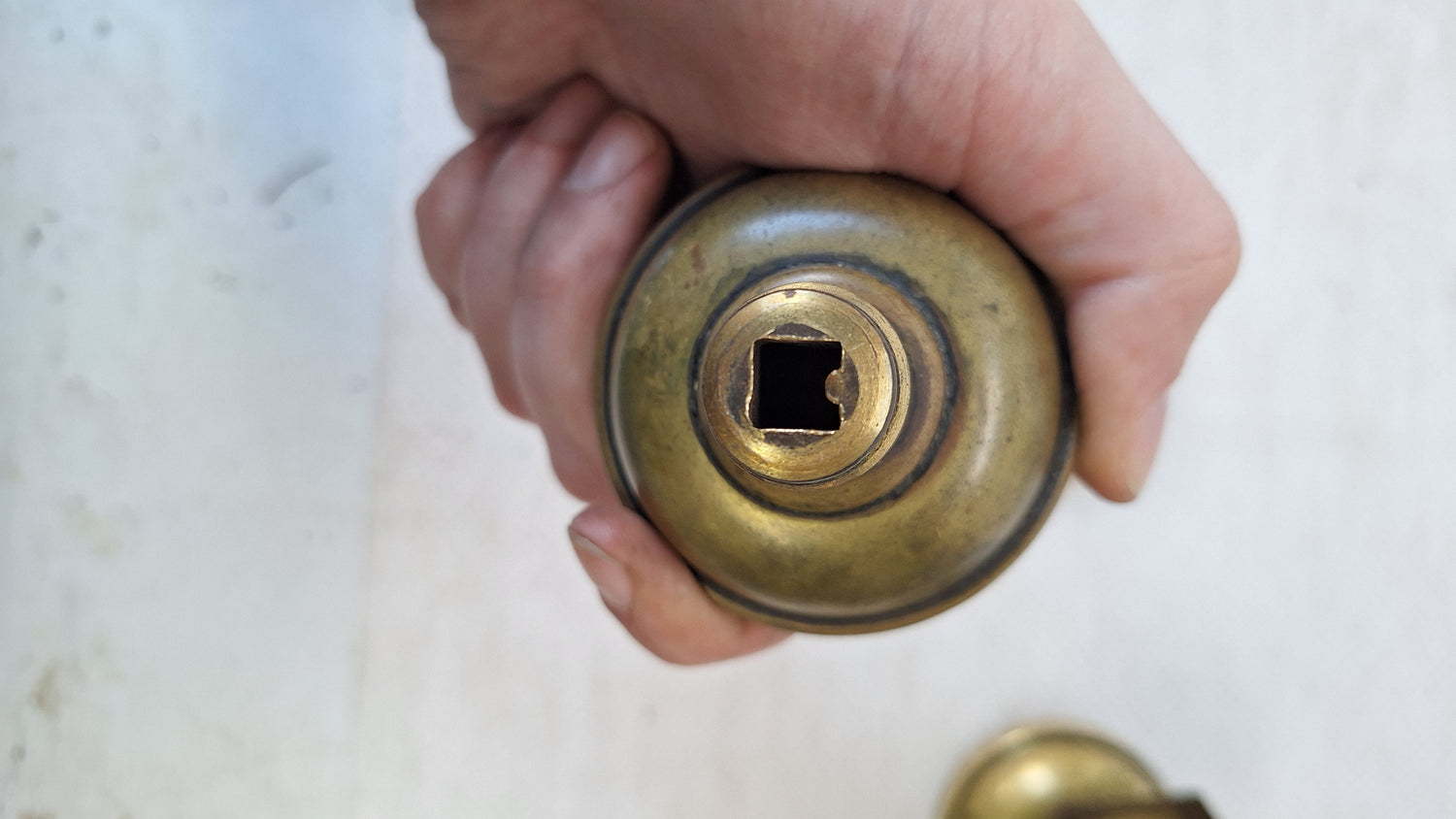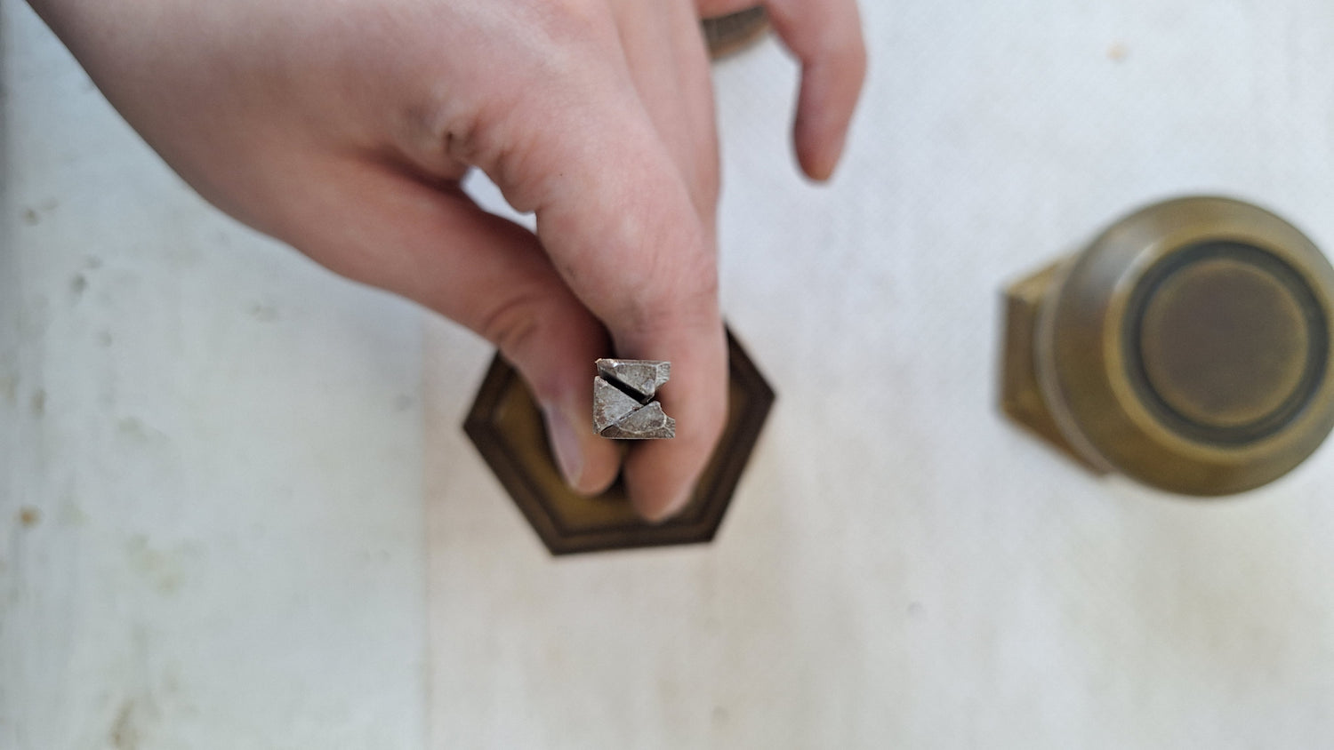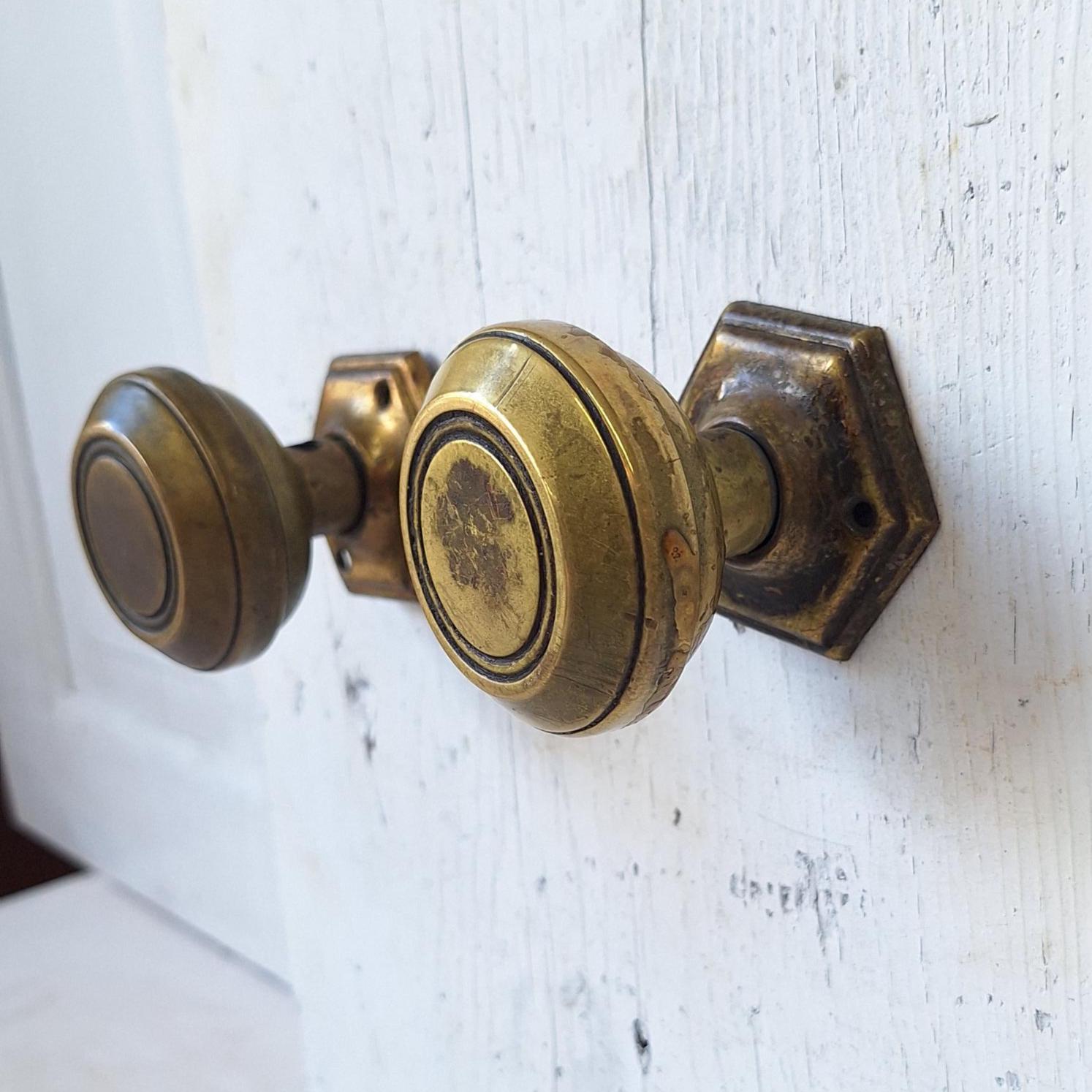 A streamlined pair of Craftsman style doorknobs with matching hexagonal rosettes. This set is made from stamped brass. There are a few dark areas in the metal as shown in the photos, but the set is in overall very good condition (can be brightened with brass cleaner). Please see all of our pictures for details and dimensions. This set ships free within the US. Set includes two knobs, two rosettes, a spindle and set screws.