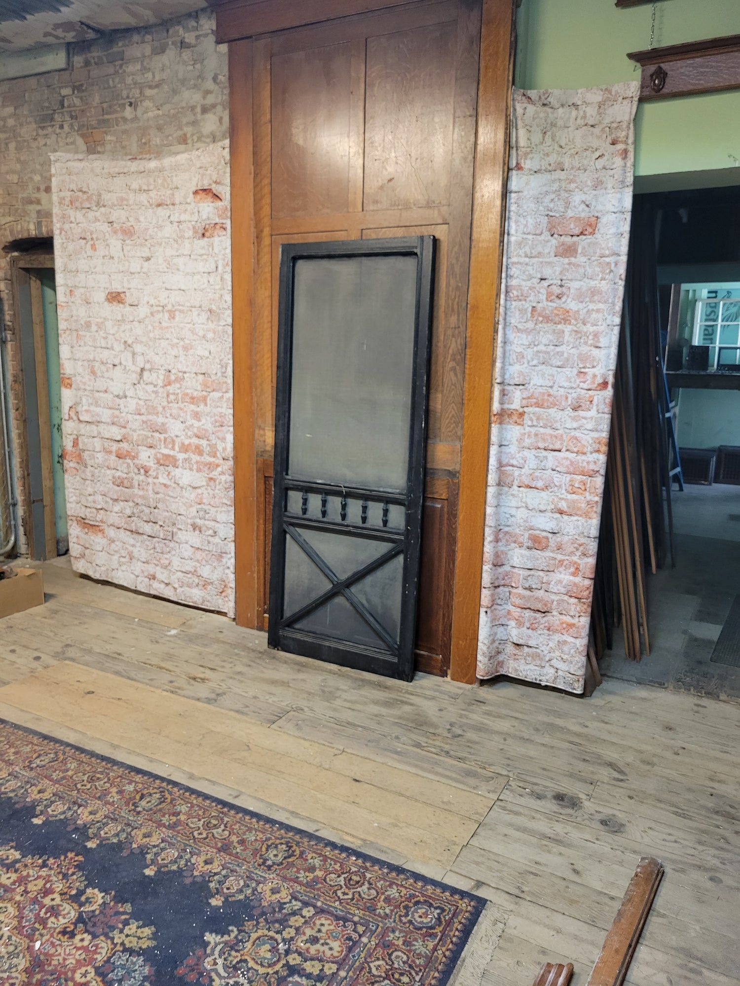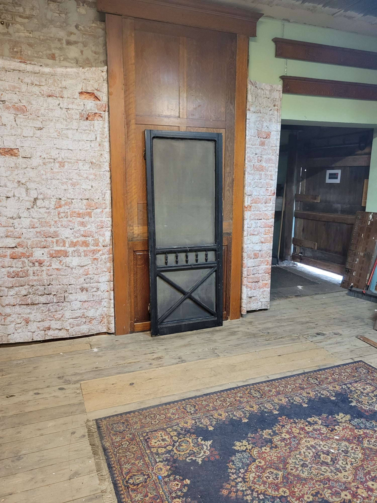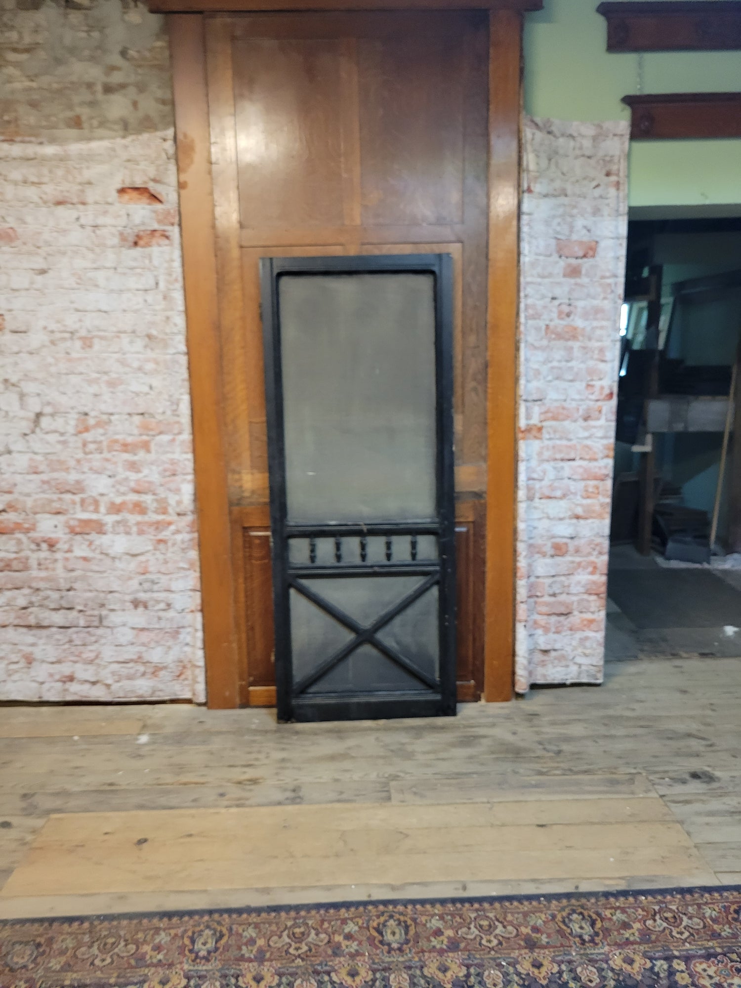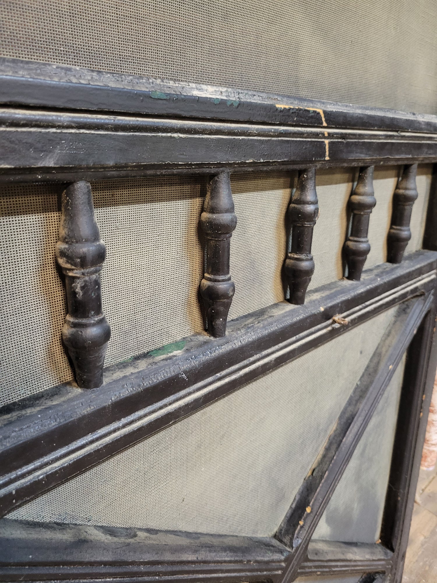 A beautiful Victorian era screen door with ornate wood accents. This historic door was salvaged from a late 1800s home in central Illinois prior to demolition. The paint is chipping and the wood will need conditioning (some minor splits in the wood due to age), however, this piece is in overall good condition. It is hard to find authentic, antique screen doors in such solid condition. Please see all of our pictures for details. There is a furring strip around the upper screen area as shown; presumably someone installed another screen over the back of the door at some point.