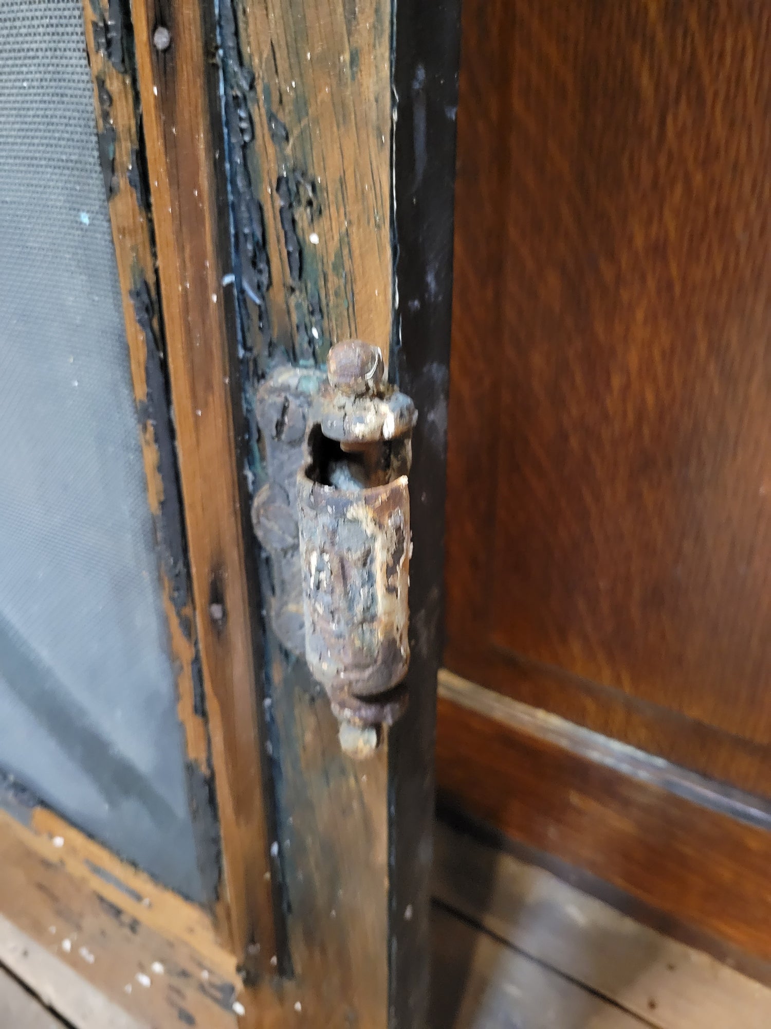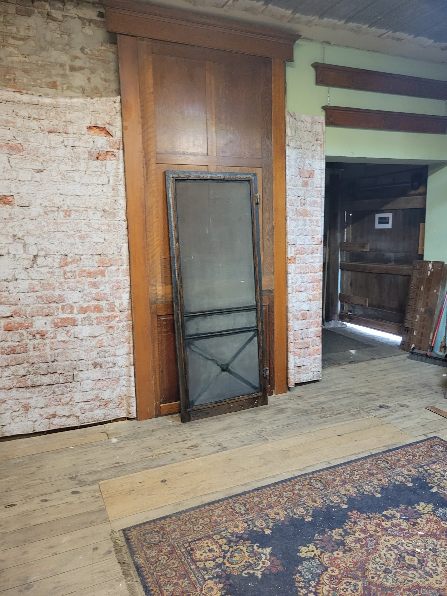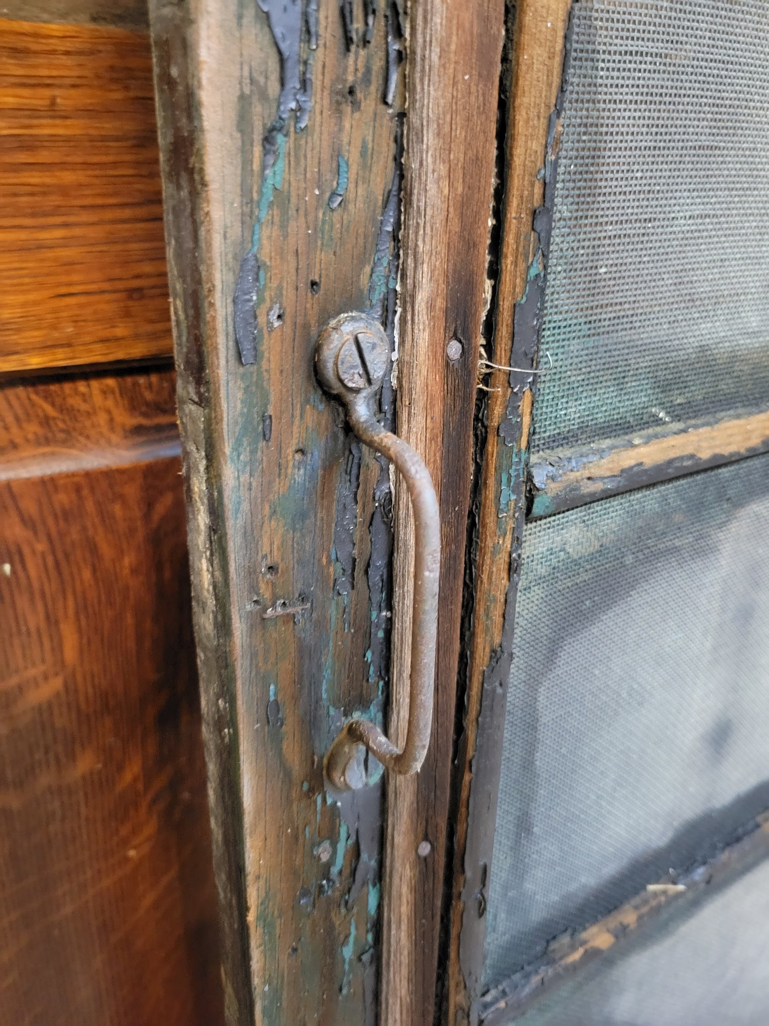 A beautiful Victorian era screen door with ornate wood accents. This historic door was salvaged from a late 1800s home in central Illinois prior to demolition. The paint is chipping and the wood will need conditioning (some minor splits in the wood due to age), however, this piece is in overall good condition. It is hard to find authentic, antique screen doors in such solid condition. Please see all of our pictures for details. There is a furring strip around the upper screen area as shown; presumably someone installed another screen over the back of the door at some point.