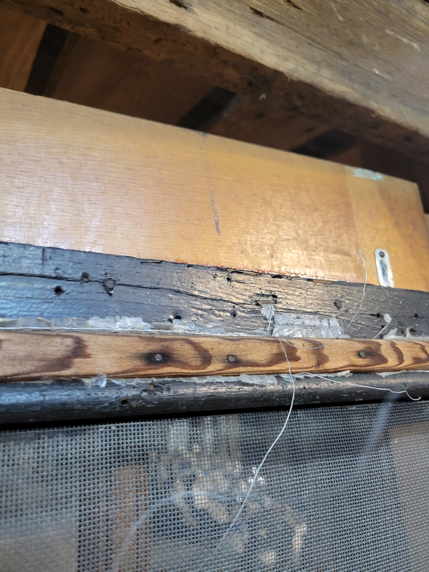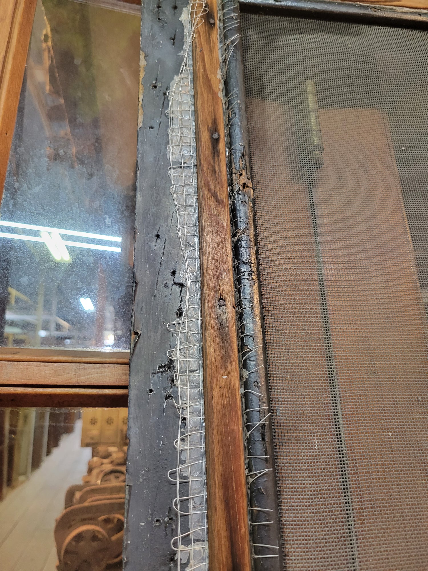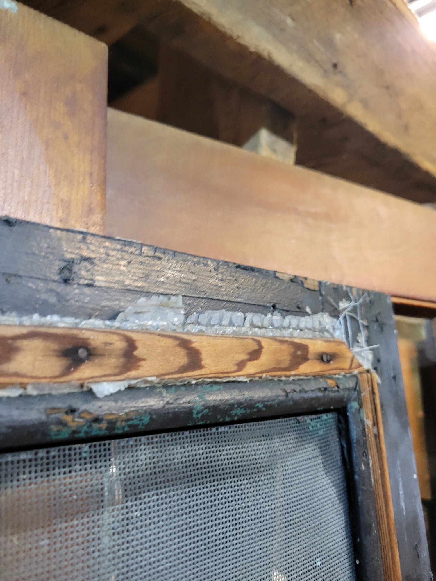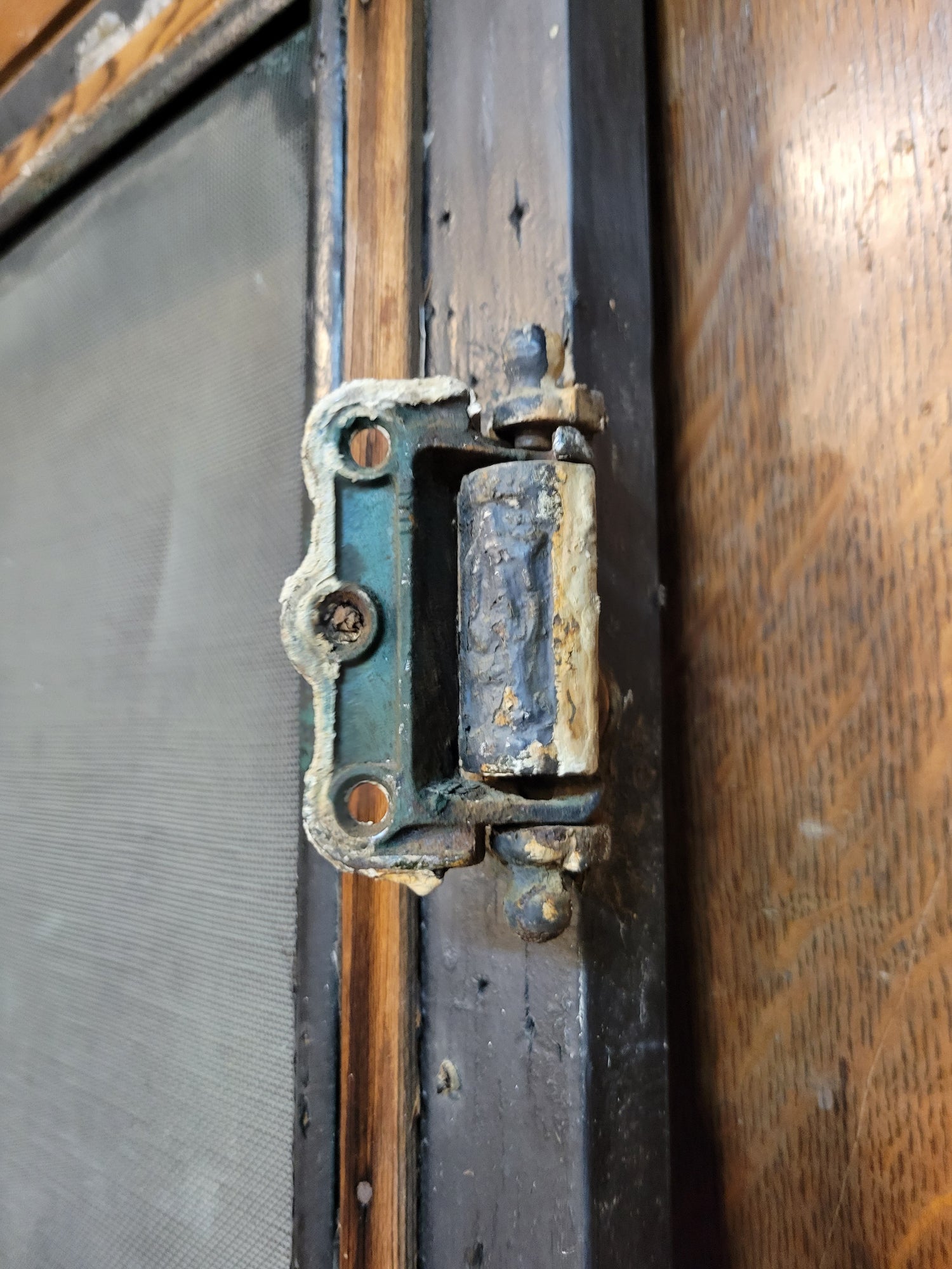 A beautiful Victorian era screen door with ornate wood accents. This historic door was salvaged from a late 1800s home in central Illinois prior to demolition. The paint is chipping and the wood will need conditioning (some minor splits in the wood due to age), however, this piece is in overall good condition. It is hard to find authentic, antique screen doors in such solid condition. Please see all of our pictures for details. There is a furring strip around the upper screen area as shown; presumably someone installed another screen over the back of the door at some point.