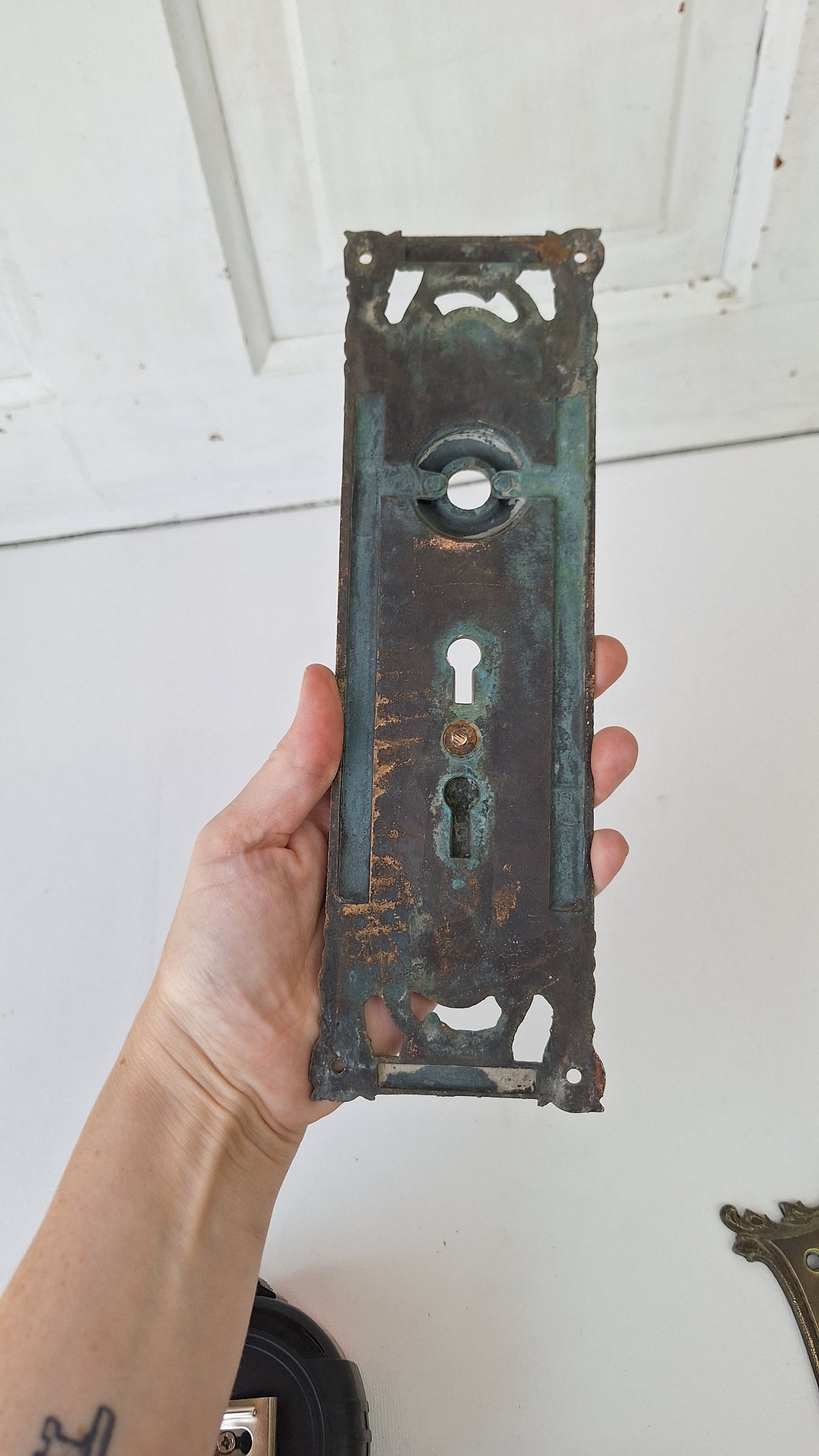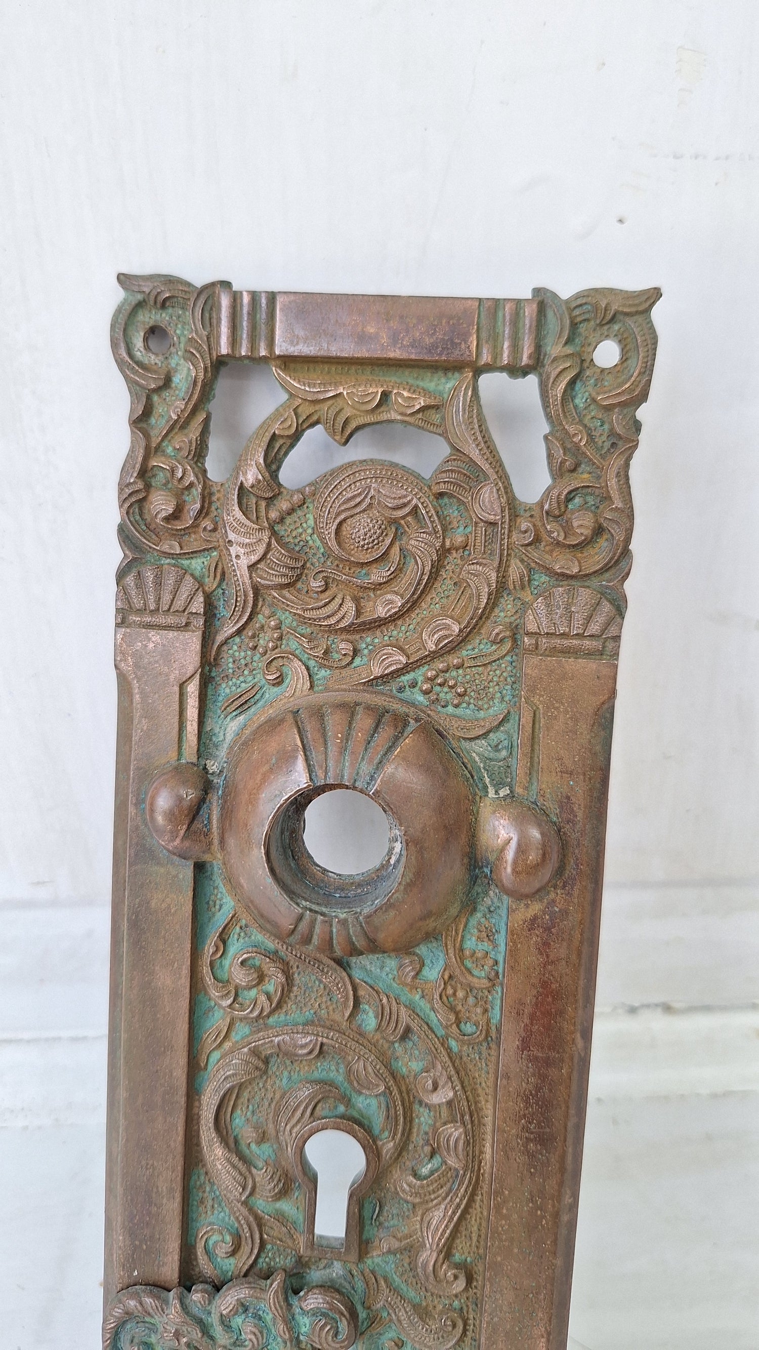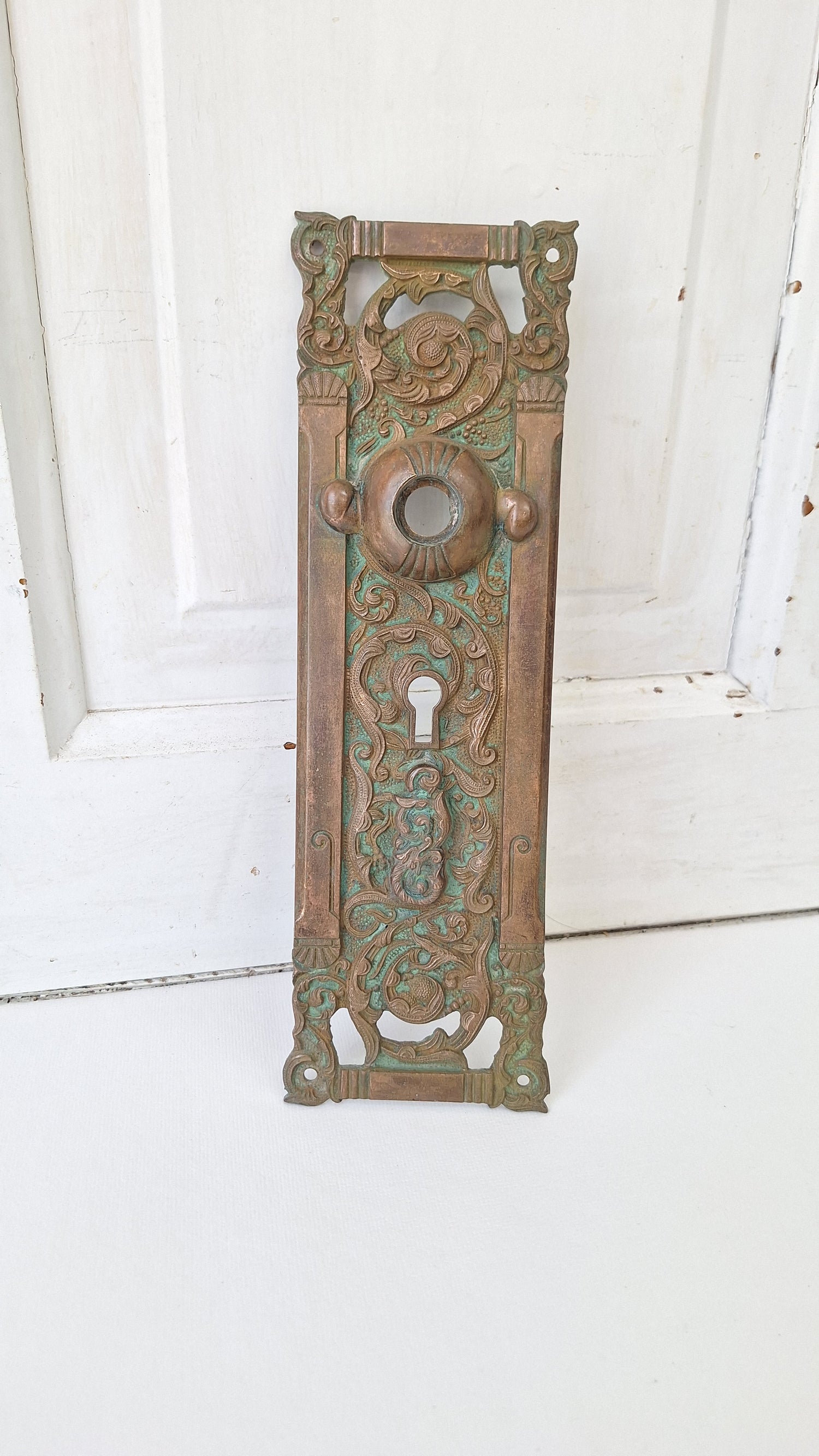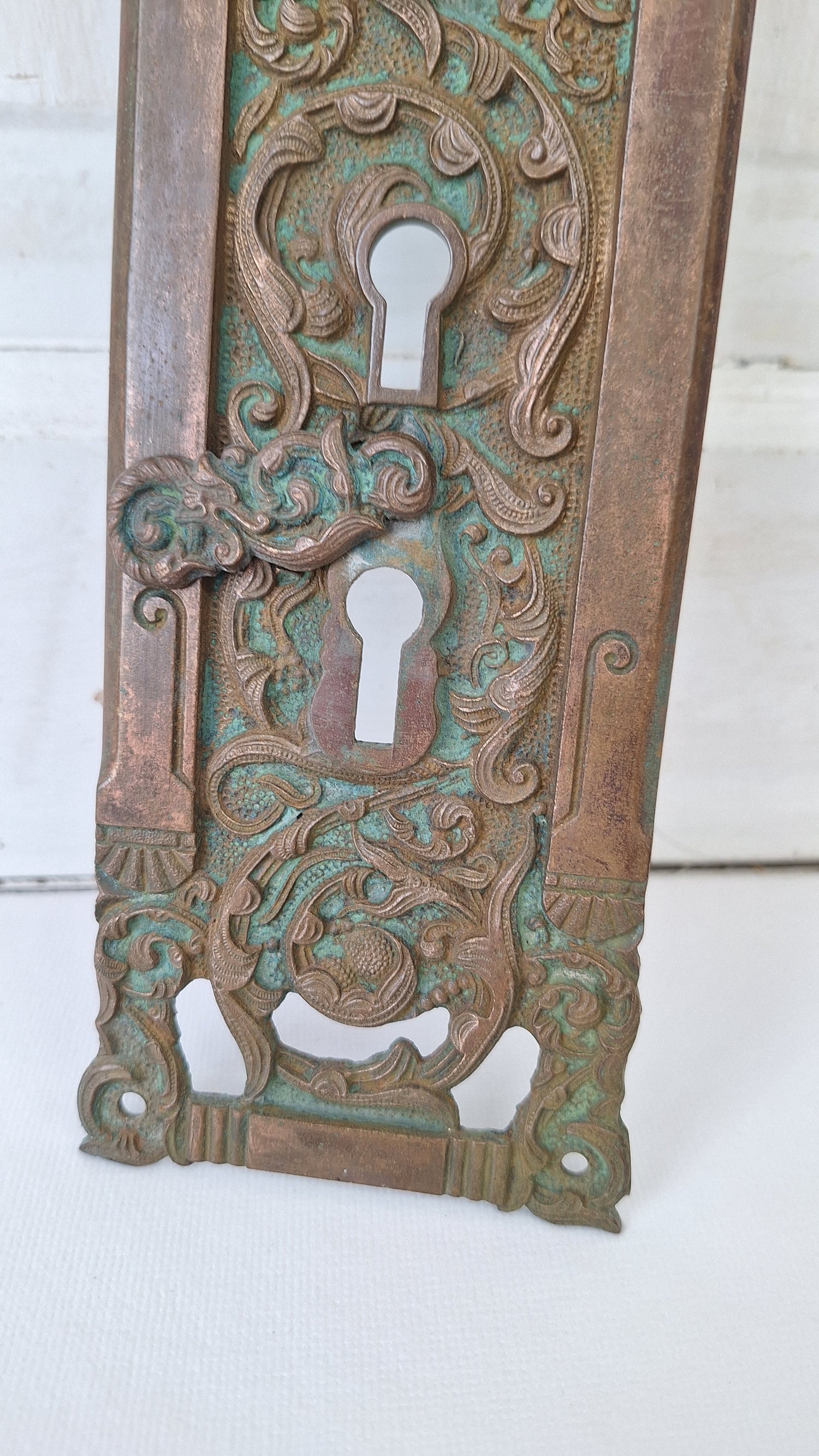 A large entry plate in the Colombian pattern by Reading Hardware. The plate features a beautiful intricate design and a swinging keyhole cover at the bottom of the plate. It is in excellent condition and has been lightly cleaned. Please see all of our pictures for details and dimensions.