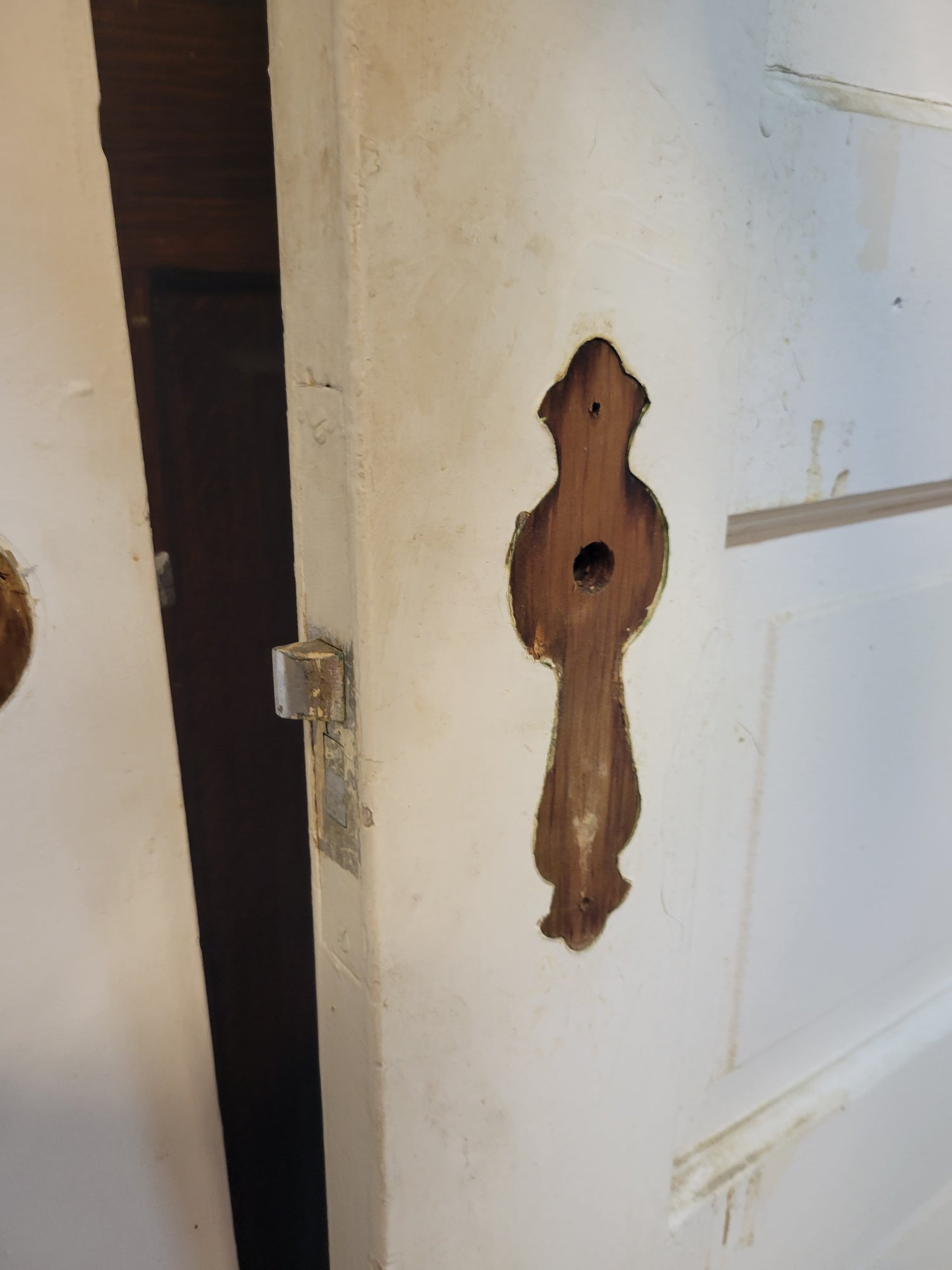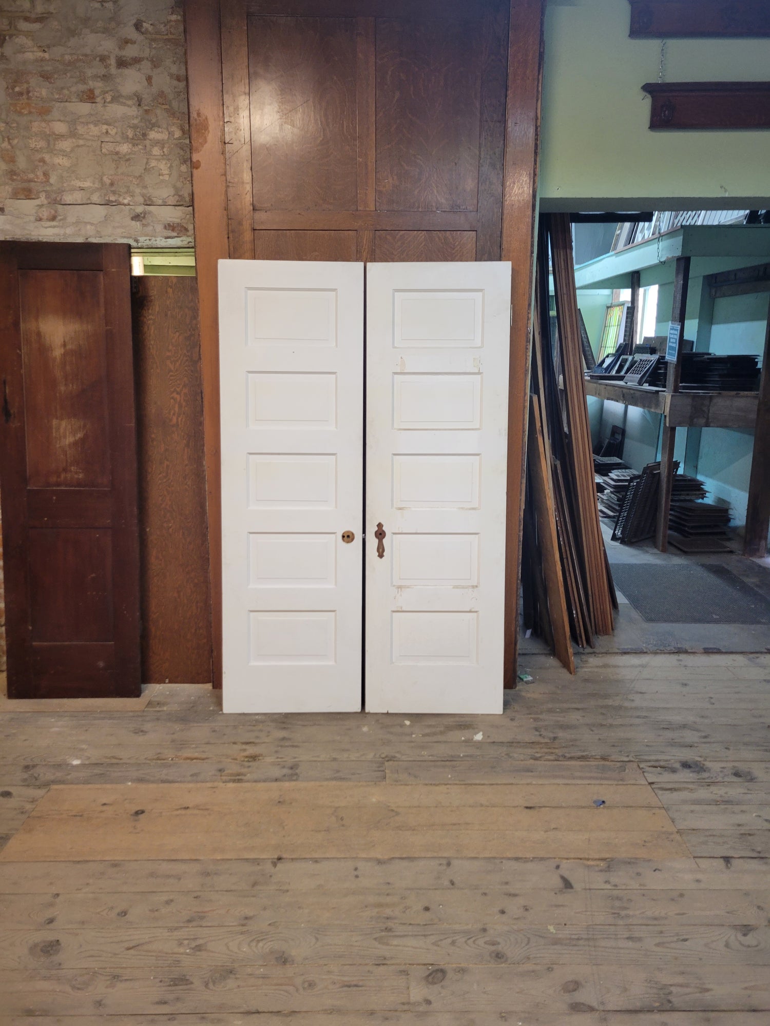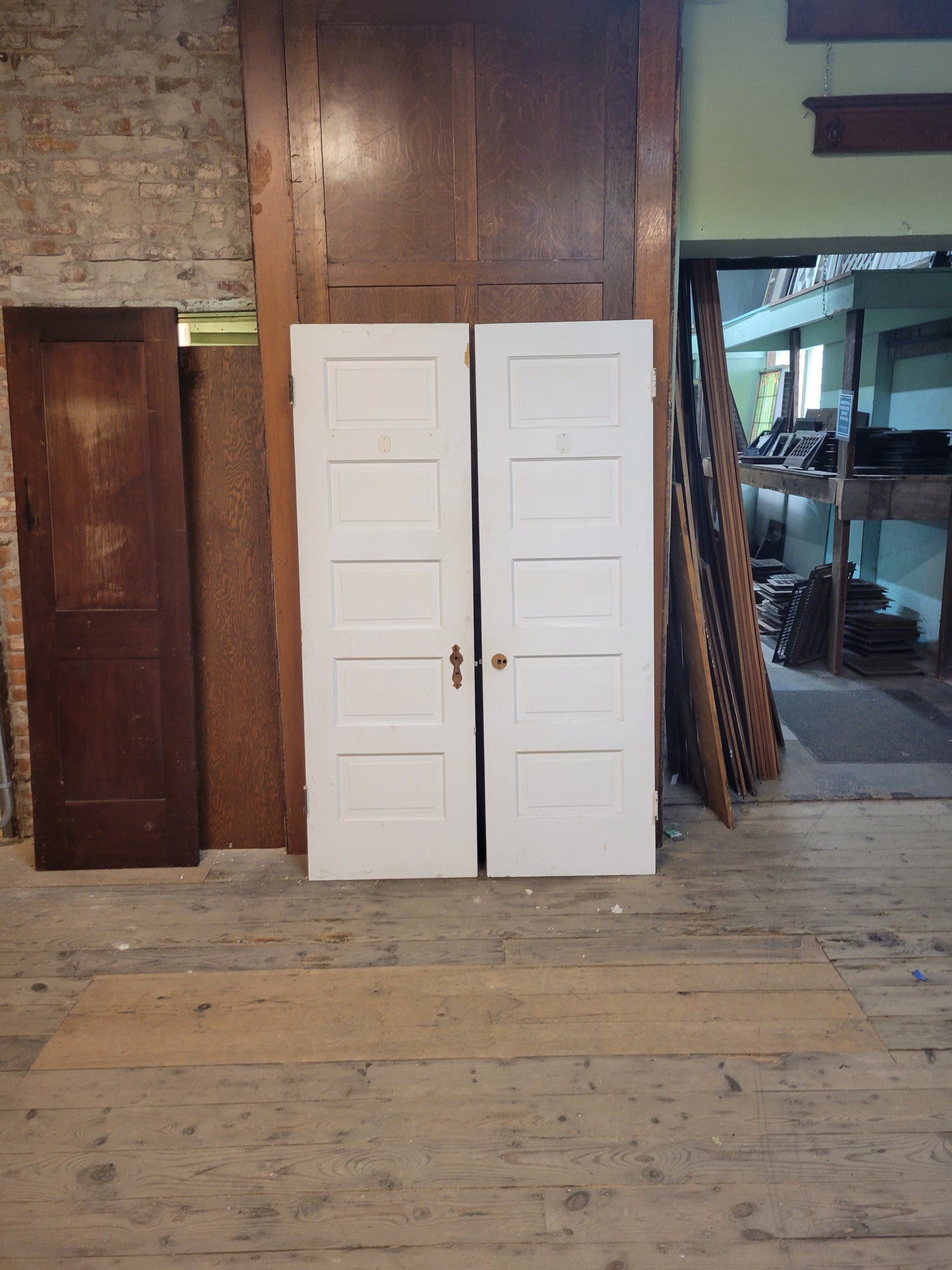 A gorgeous set of matched doors with a classic five panel design with the a white painted finish. These beautiful doors have been paired together based on size for a nicely matched set of double doors. There are some imperfections to the surface of the wood from years of use as shown (nicks in the finish or wood). The paint is distressed as pictured and has areas of imperfections and there are two different styles of lock on the doors as shown in the photos. Please see all of our pictures for details on this set.