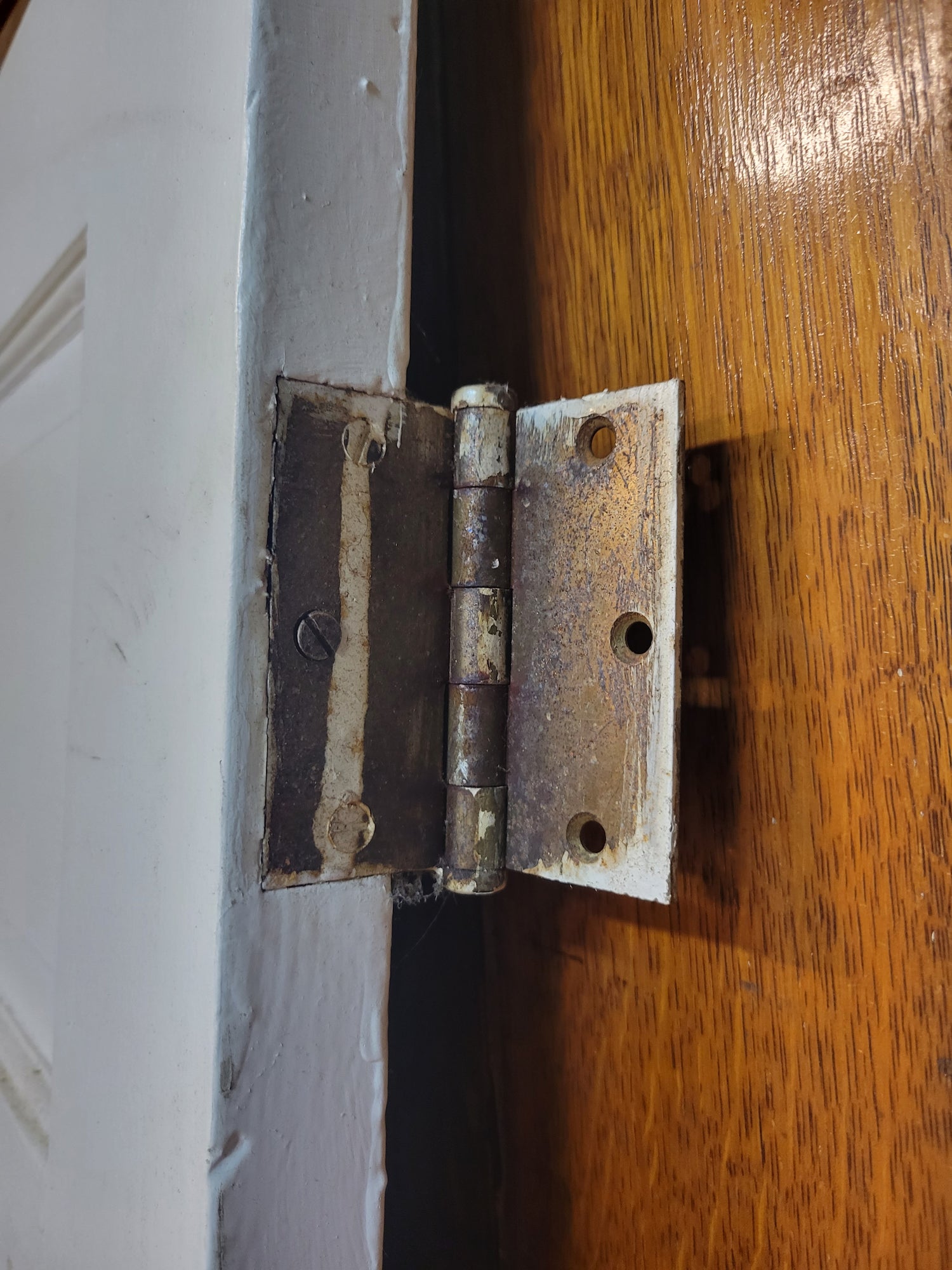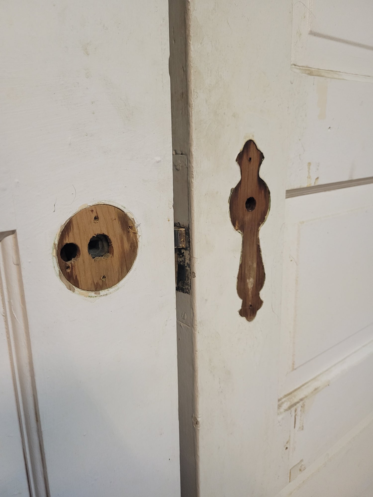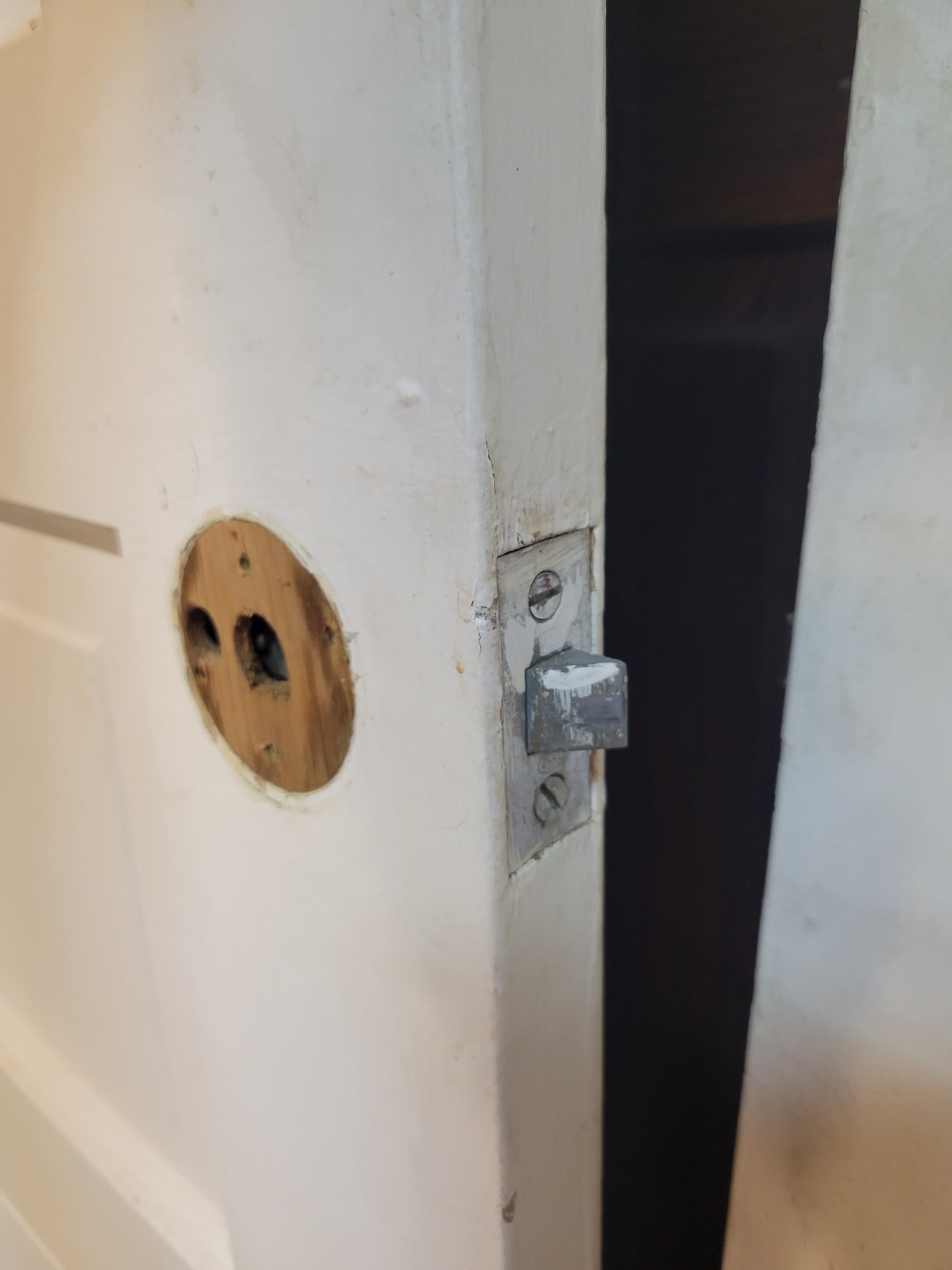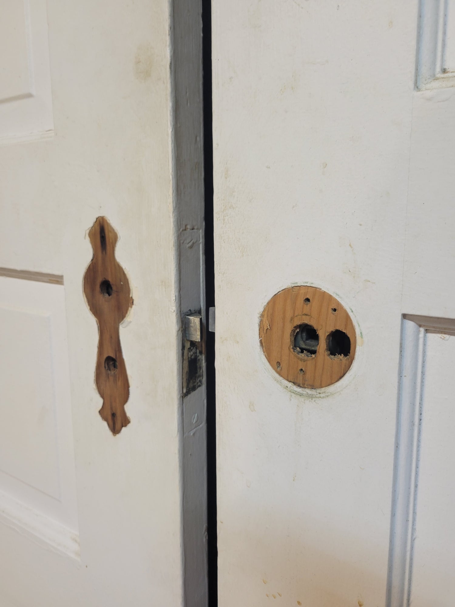 A gorgeous set of matched doors with a classic five panel design with the a white painted finish. These beautiful doors have been paired together based on size for a nicely matched set of double doors. There are some imperfections to the surface of the wood from years of use as shown (nicks in the finish or wood). The paint is distressed as pictured and has areas of imperfections and there are two different styles of lock on the doors as shown in the photos. Please see all of our pictures for details on this set.