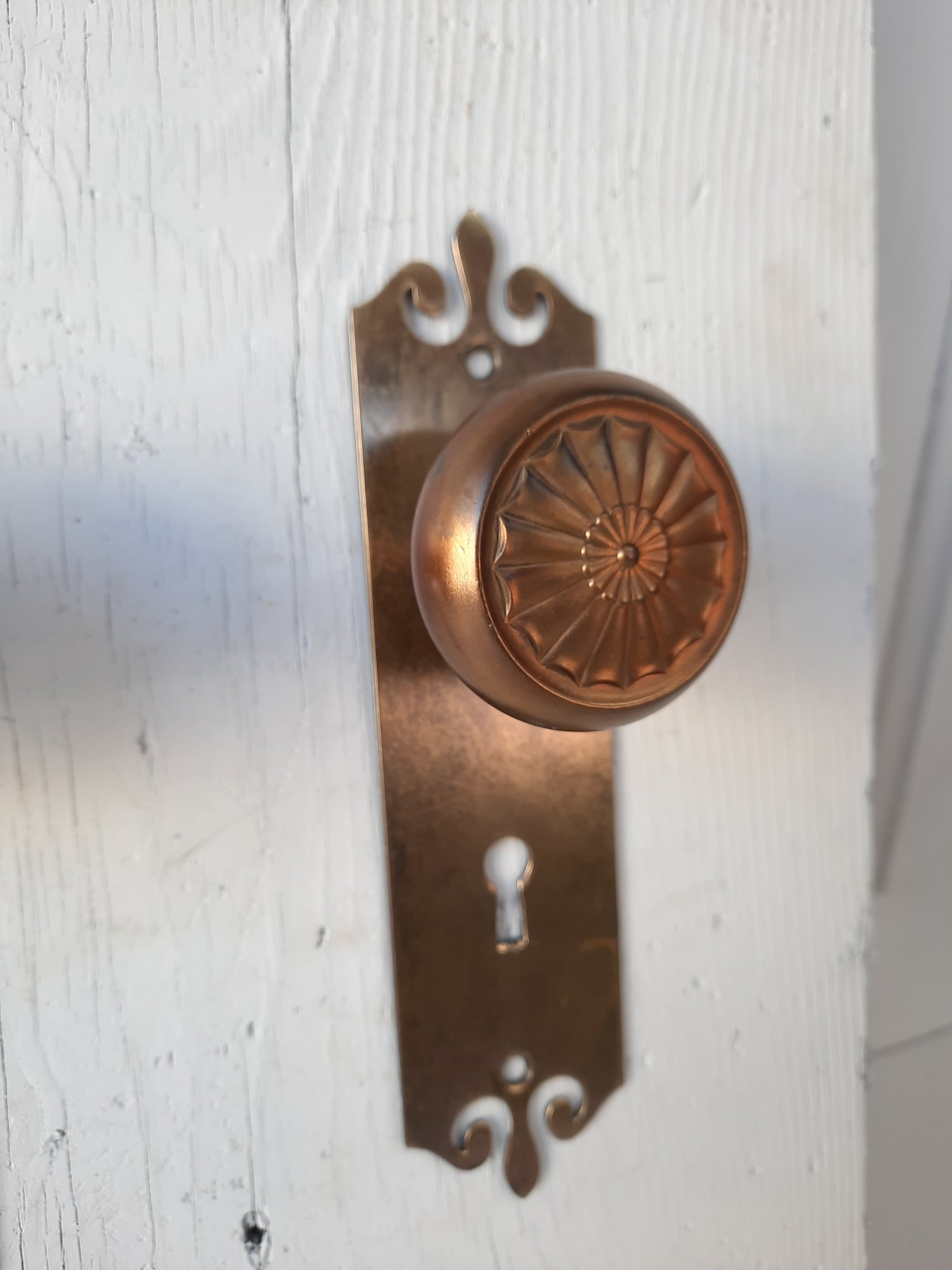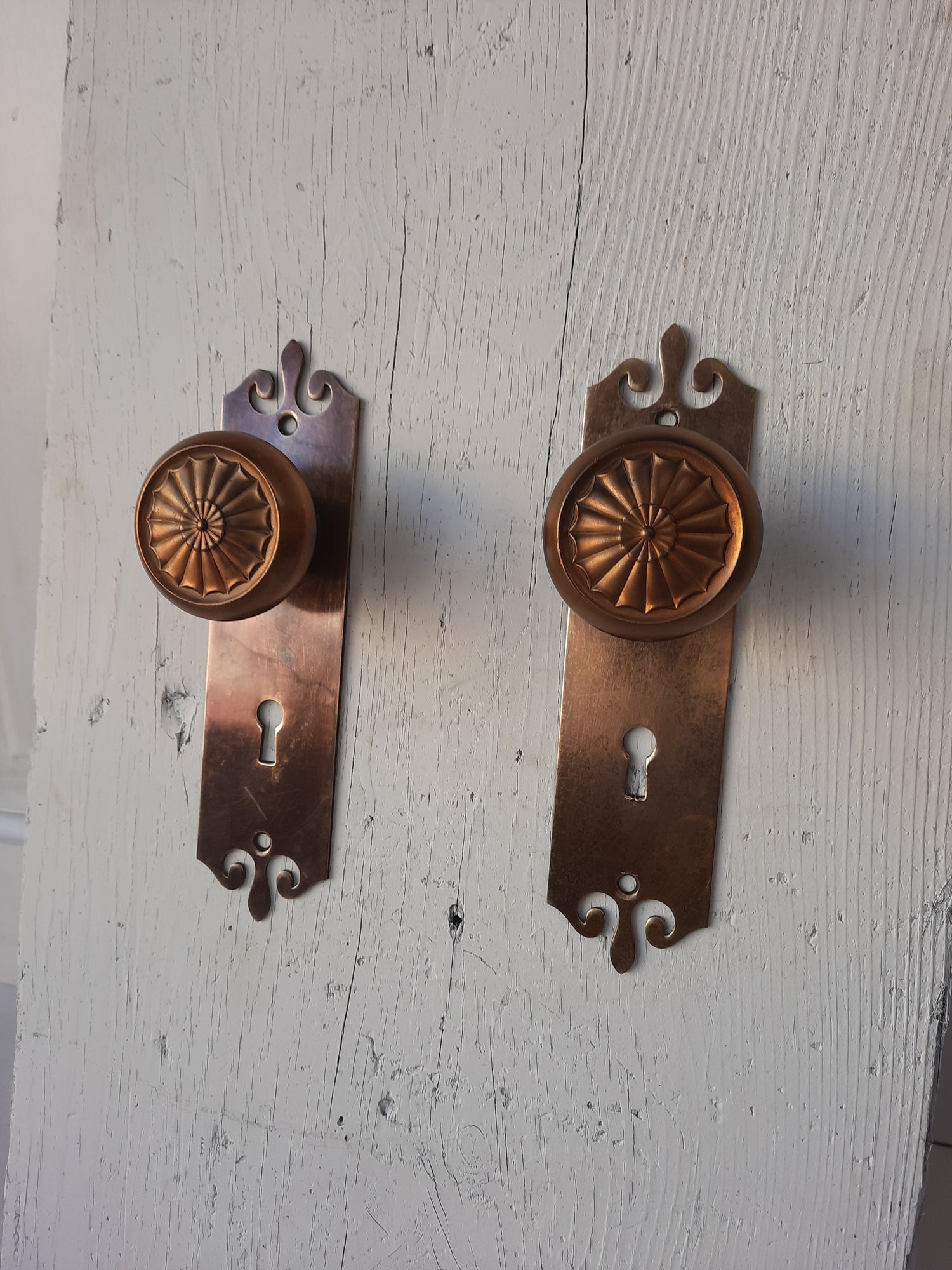 A complete set of matching Art Deco door backplates with doorknobs in a streamline pattern typical of the Art Deco era. The patina varies from plate to plate as shown. Please see all of our pictures for details on this set.