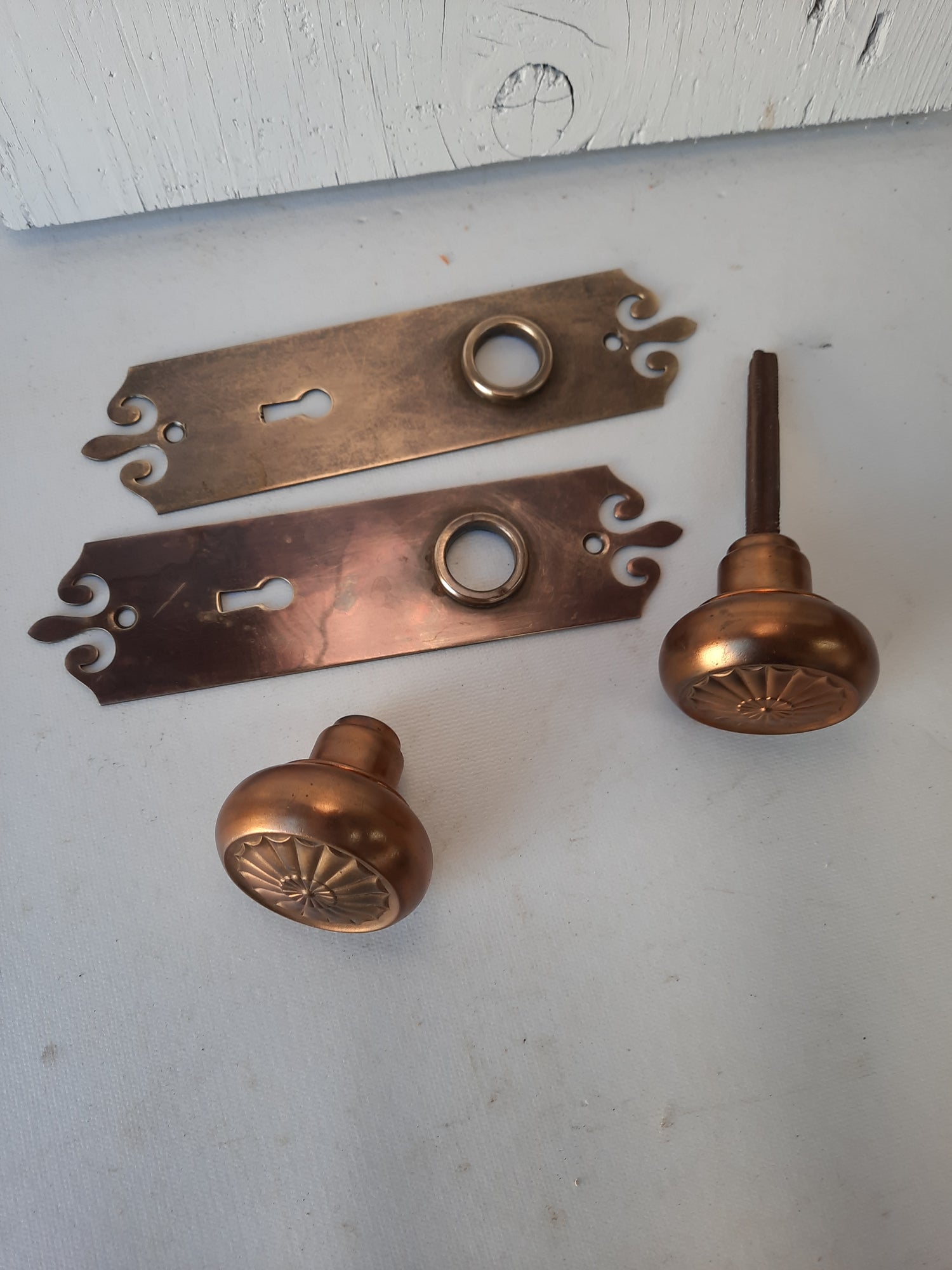 Art Deco Fan Style Doorknob with Backplates, Brass Deco Knobs and Back Plates Set 020301