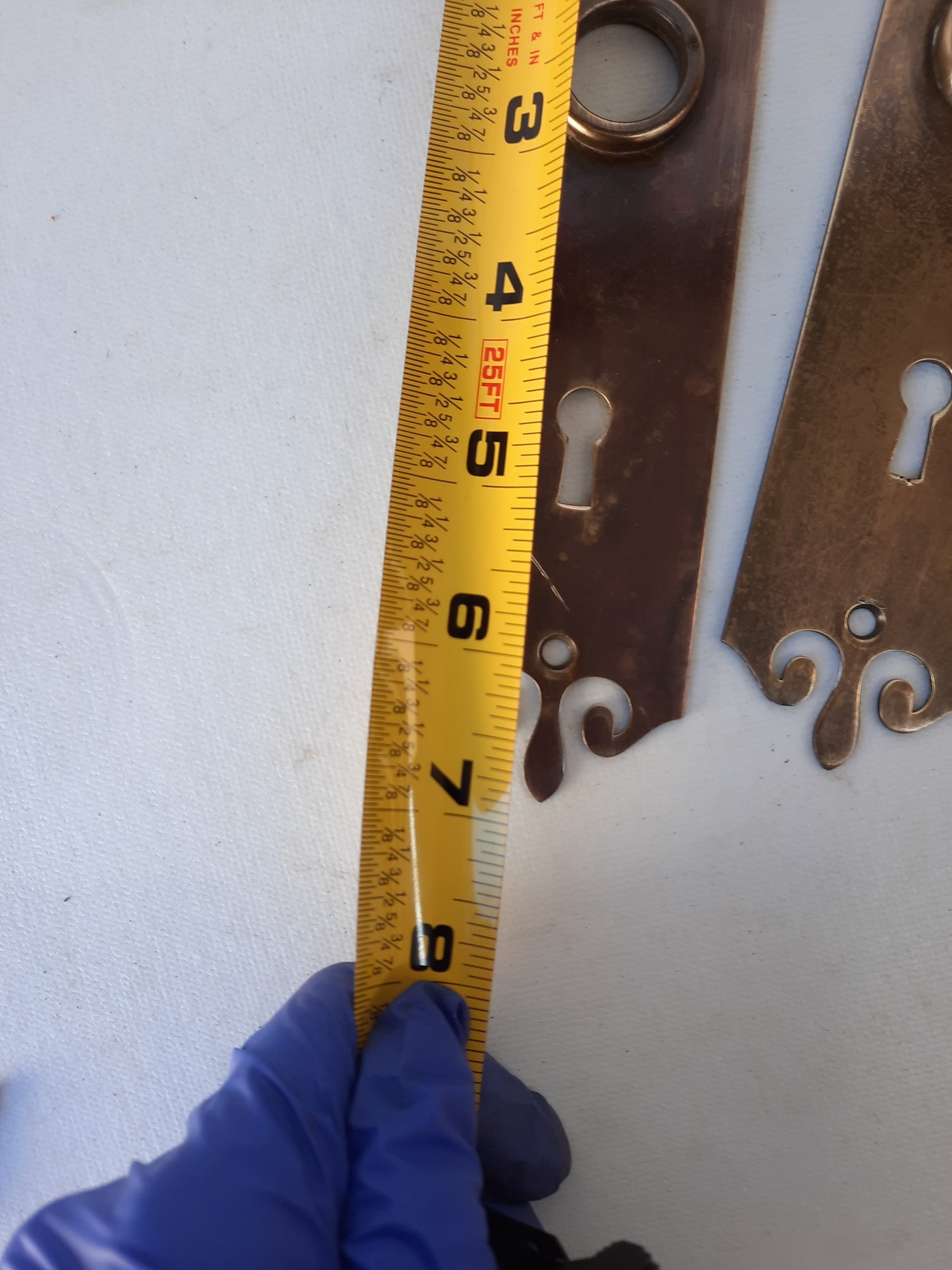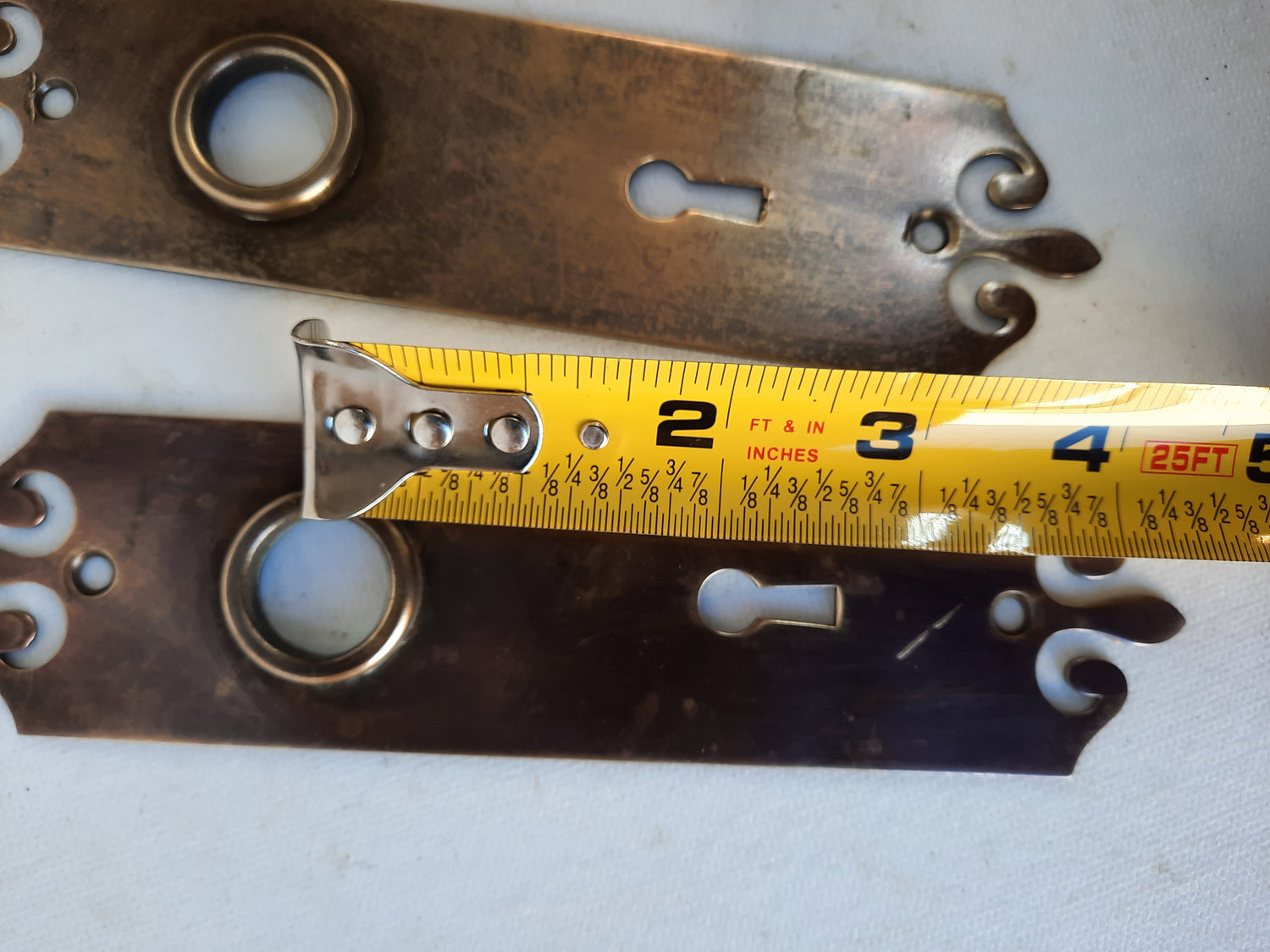 Each backplate measures 6 7/8" tall by 1 5/8" wide. This set of two plates and two knobs ships free within the US.
