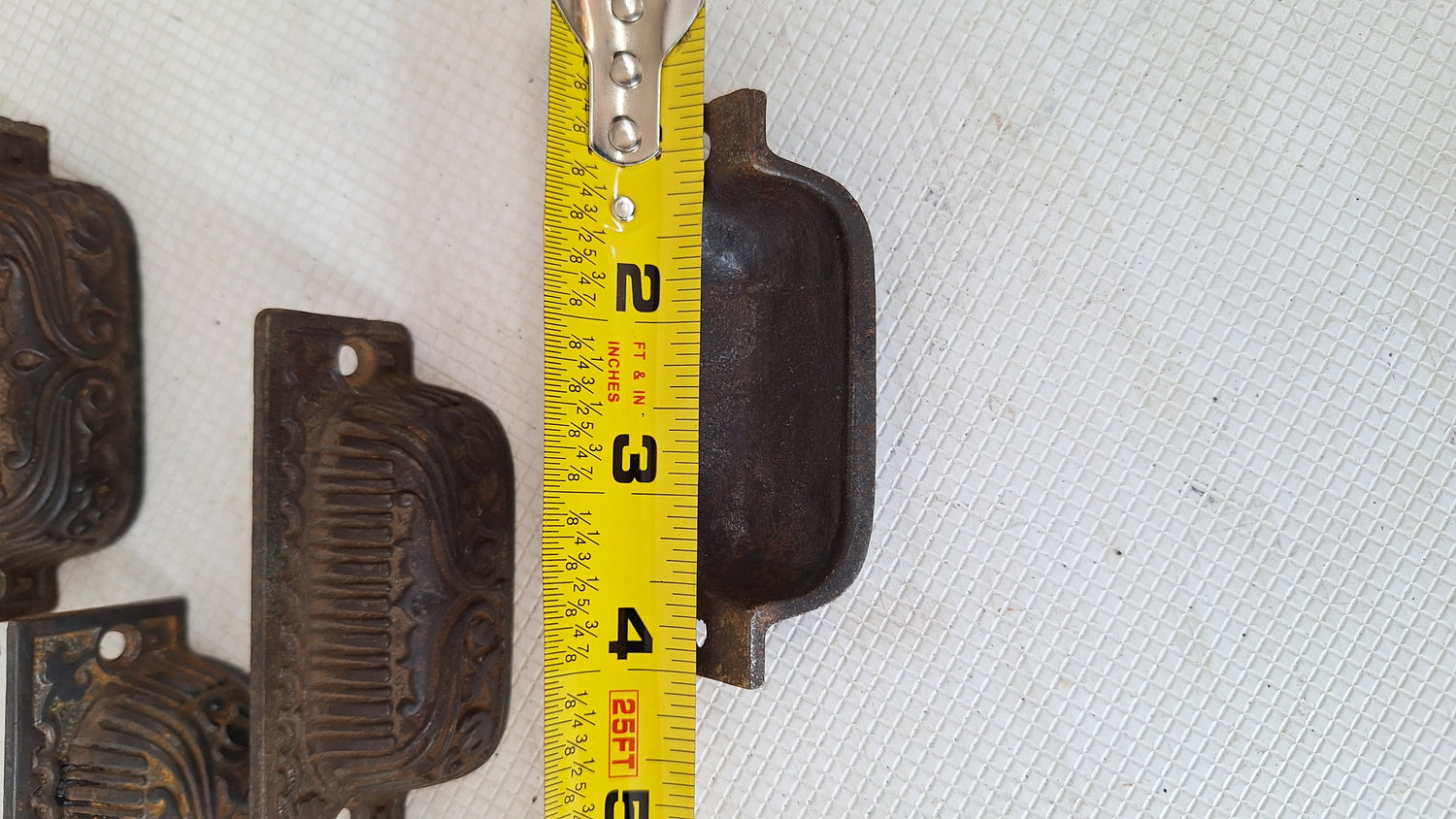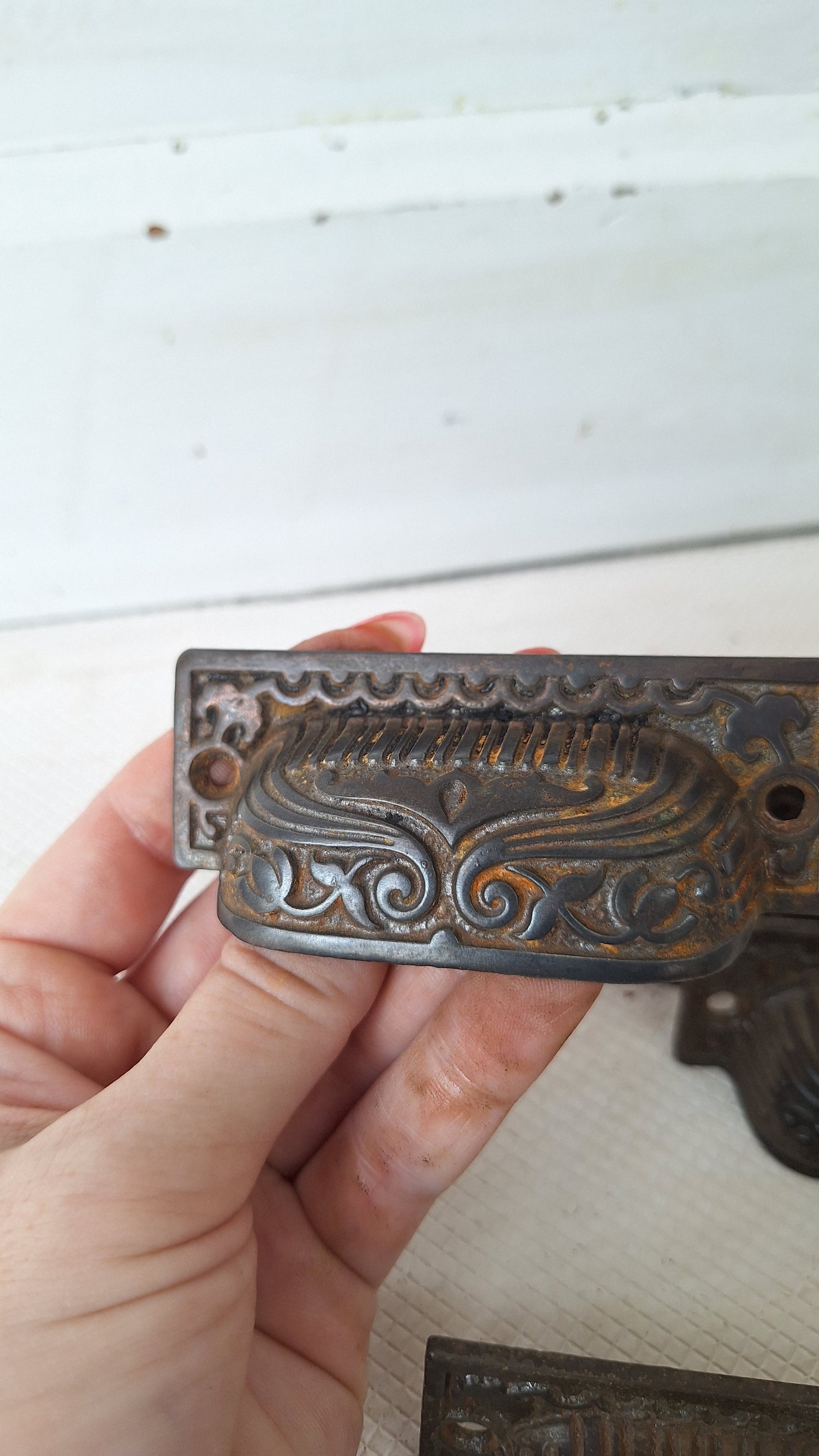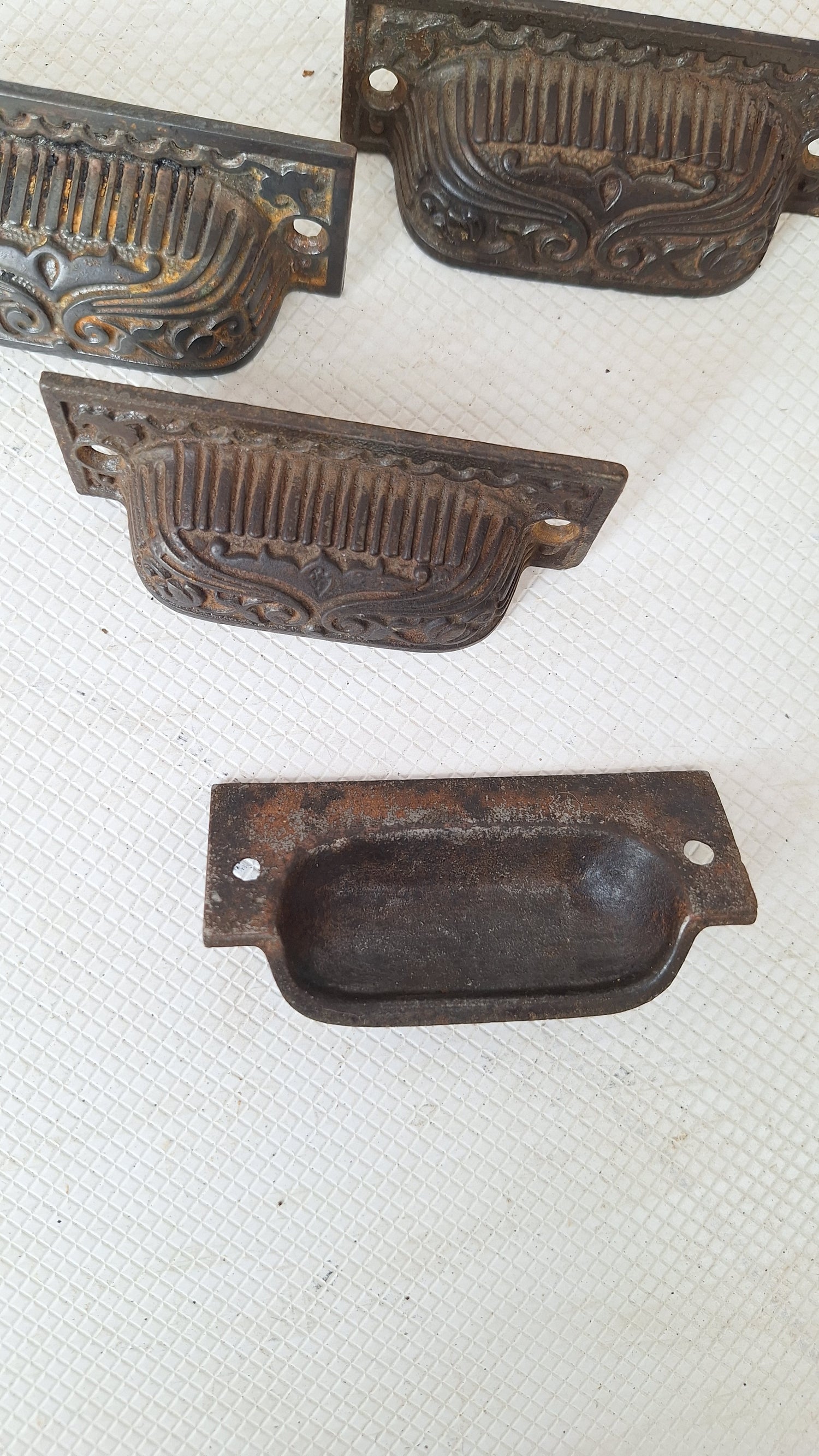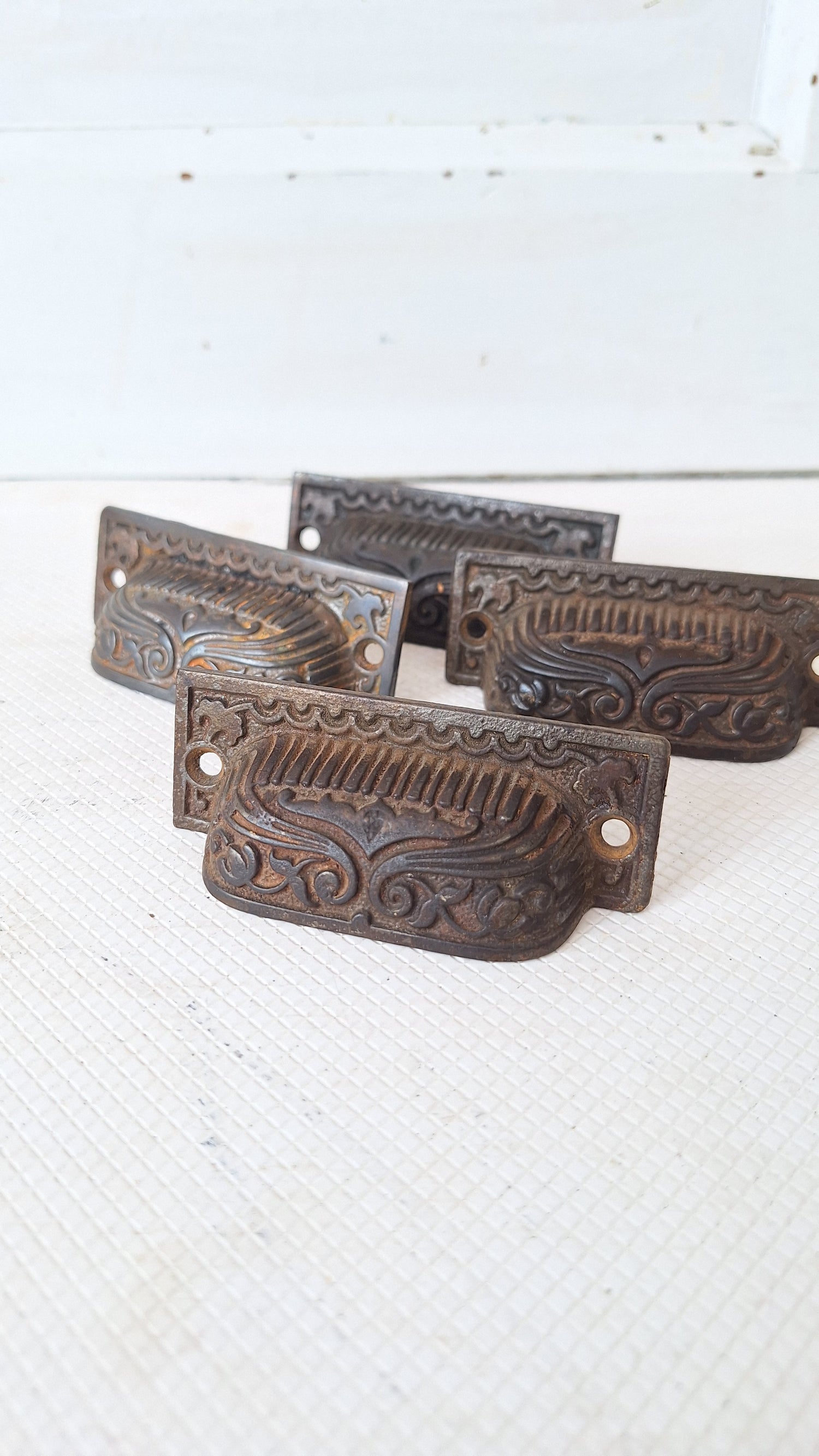 Four Cast Iron Eastlake Handles with Pierced Design, Five Antique Ornate Bin Pulls 072910