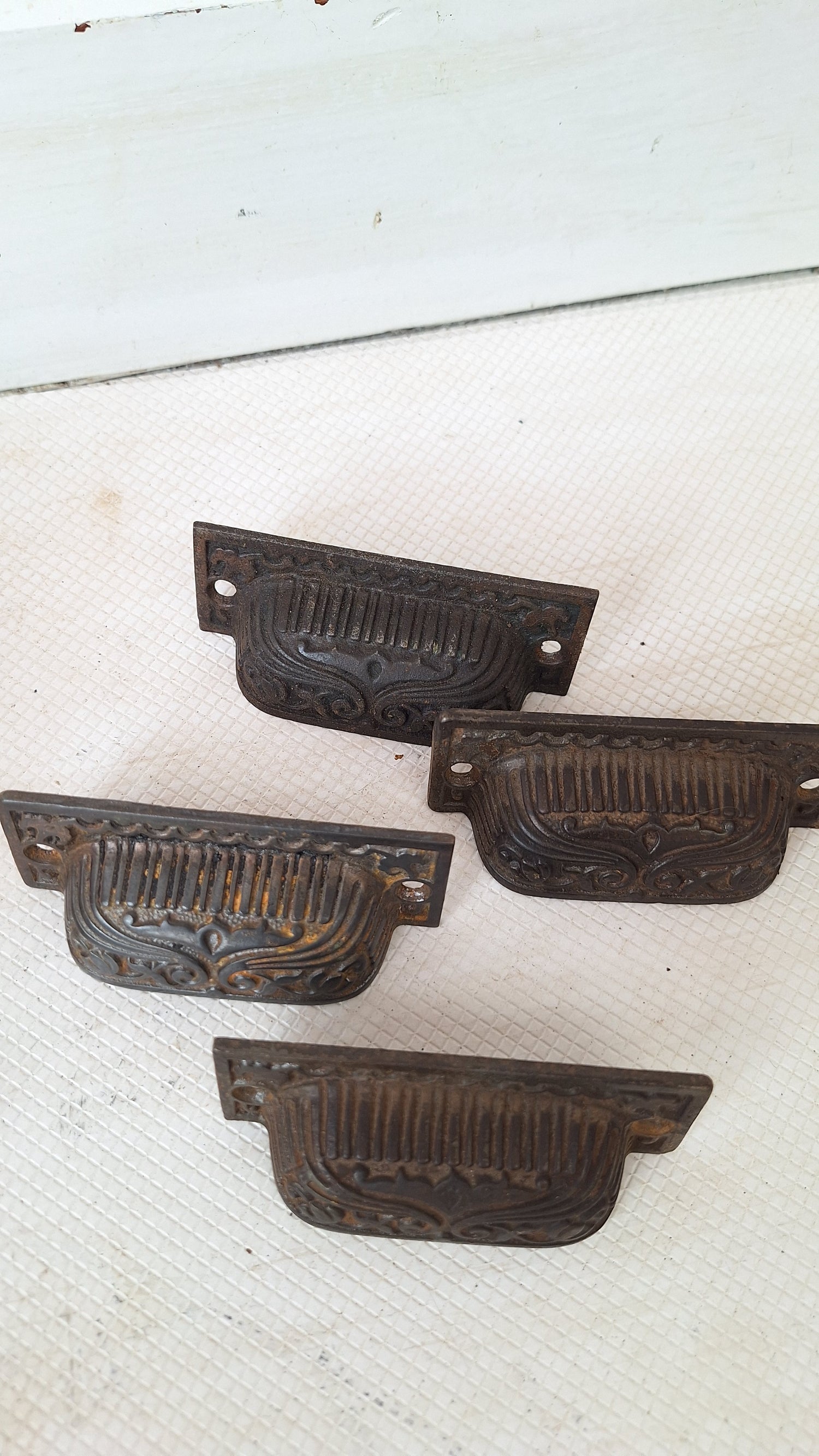 A set of four ornate iron drawer pulls with an ornate design from the Victorian era. All are in excellent condition. Screw holes measures 2 3/4" on center. This set of four ships free within the US.
