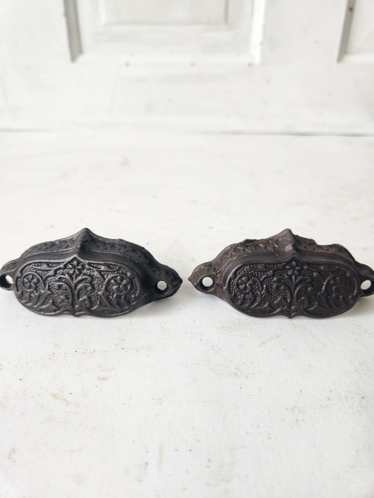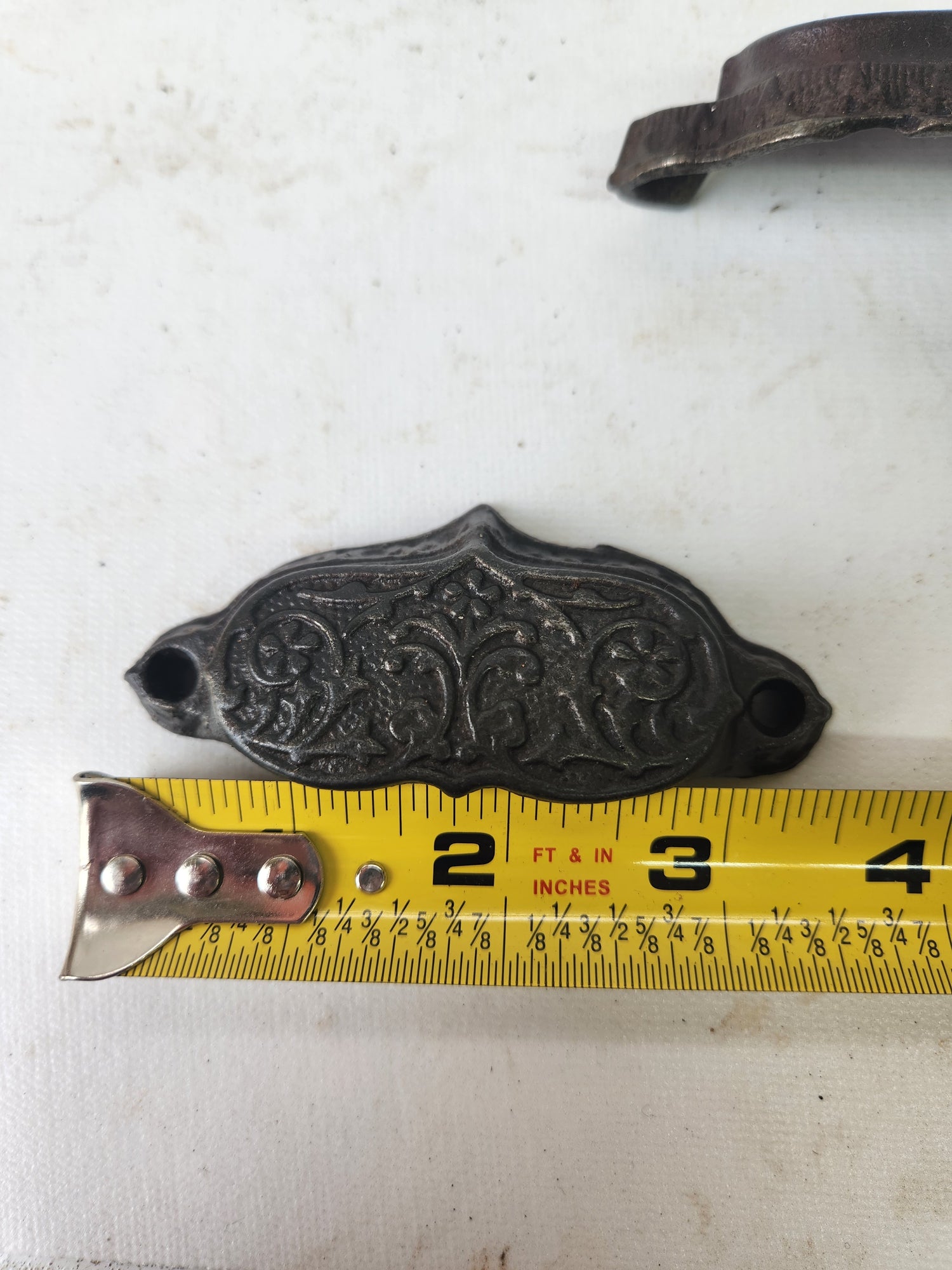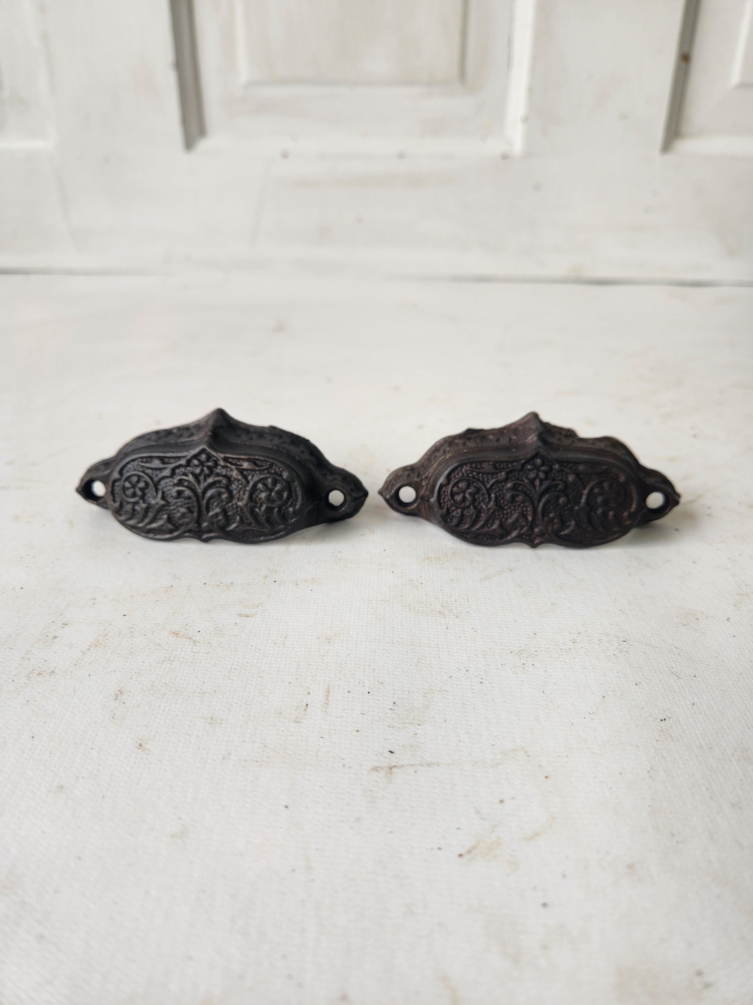 This listing is for two small cast iron pulls from the late 1800s. These can be used for drawer handles, nightstand pulls, window sash lifts, and more. They have a beautiful design along the face with stylized floral details. These have been cleaned of paint and the wear/patina varies on each pull.