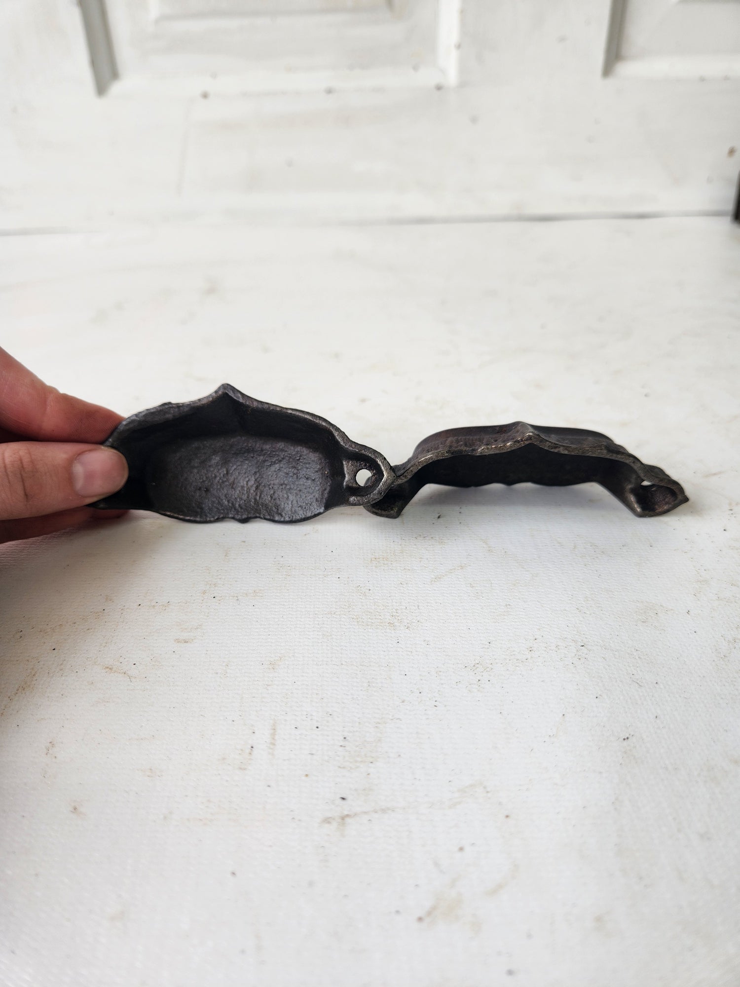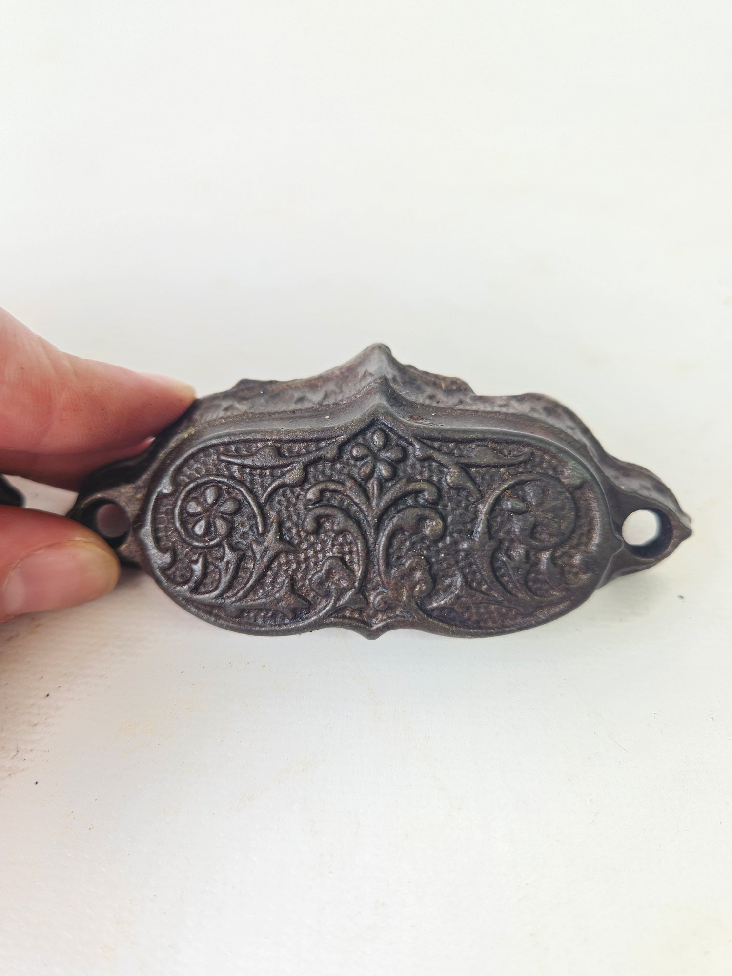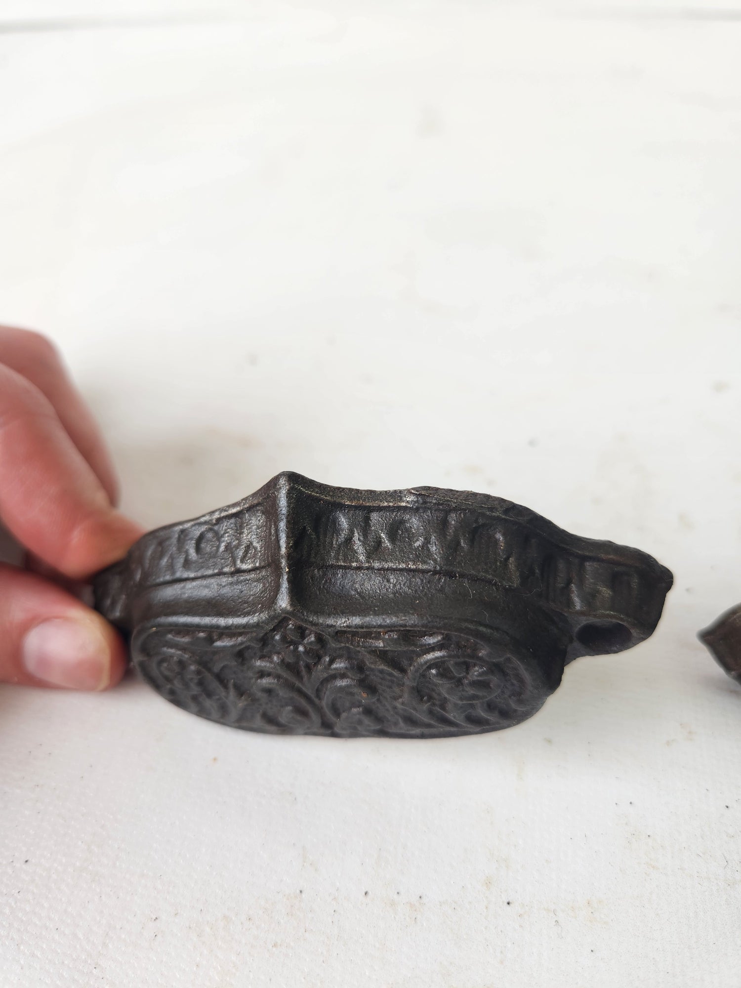 This listing is for two small cast iron pulls from the late 1800s. These can be used for drawer handles, nightstand pulls, window sash lifts, and more. They have a beautiful design along the face with stylized floral details. These have been cleaned of paint and the wear/patina varies on each pull.