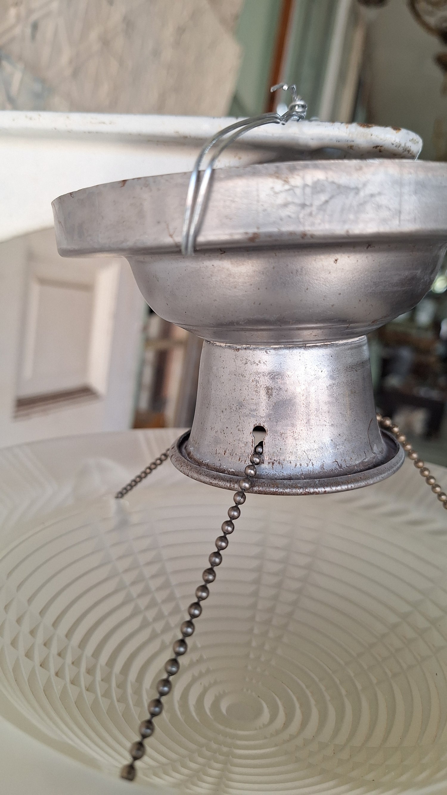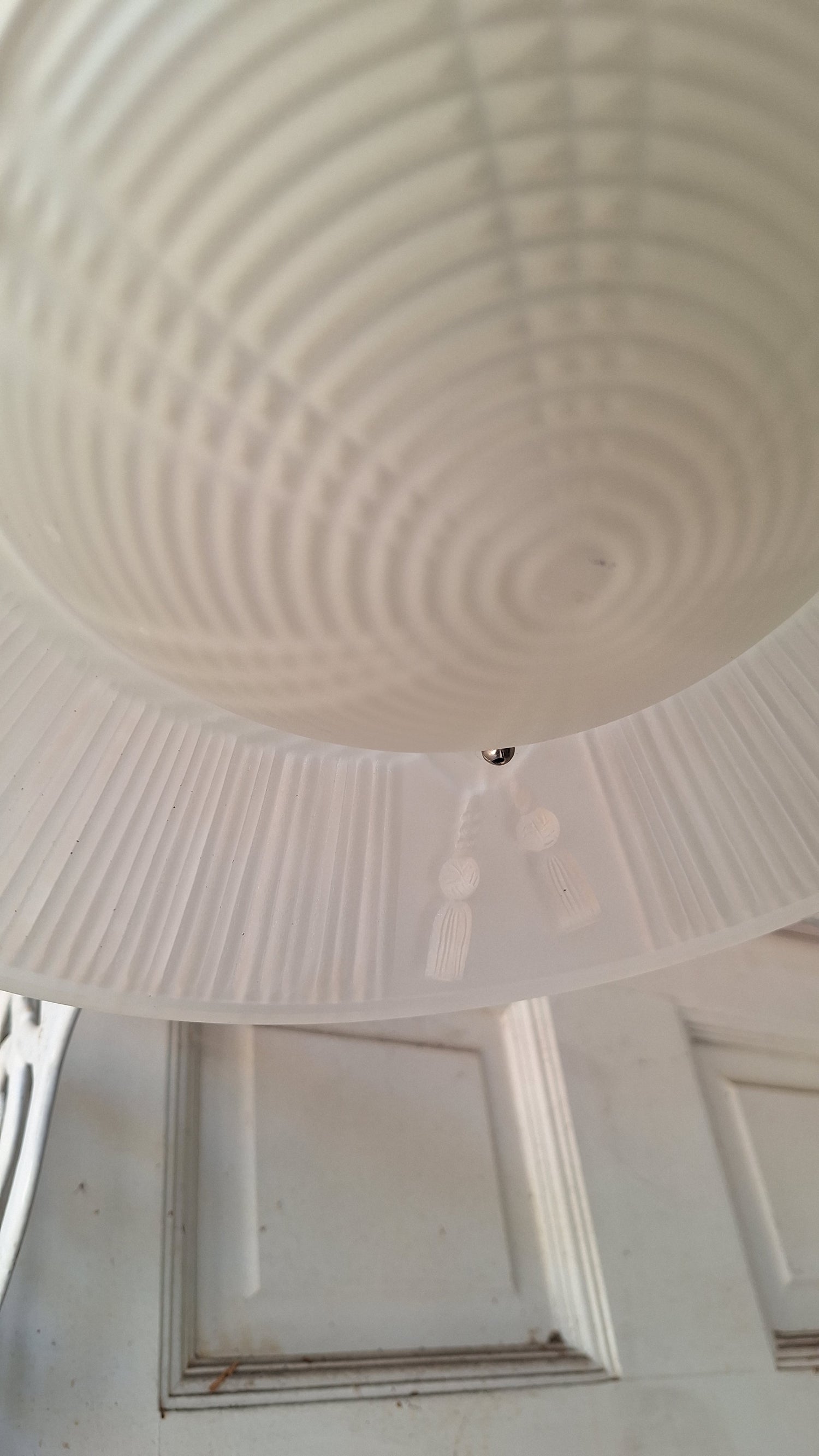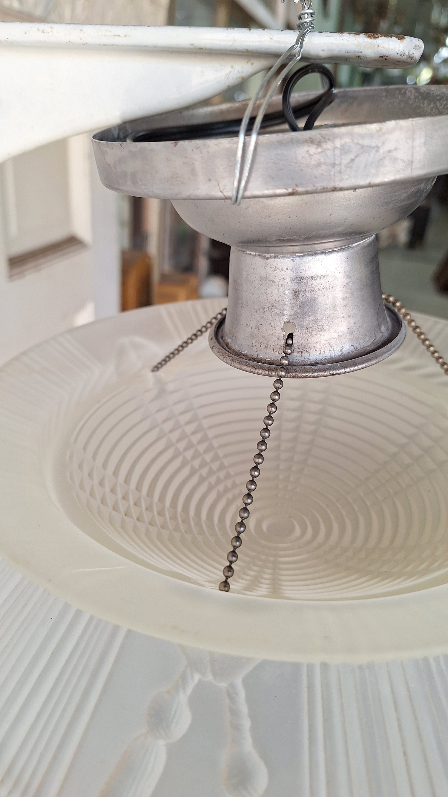 A charming vintage glass light with three beaded chains for the shade, the original metal base, and a luminous molded glass shade with tassel details. This would be the perfect retro accent for a bathroom, kitchen, or bedroom. The wiring has been updated and this piece is ready to install. There are some minor chips around the openings in the glass for the ball chains, but overall the glass is very solid and this will not affect functioning/hanging.
