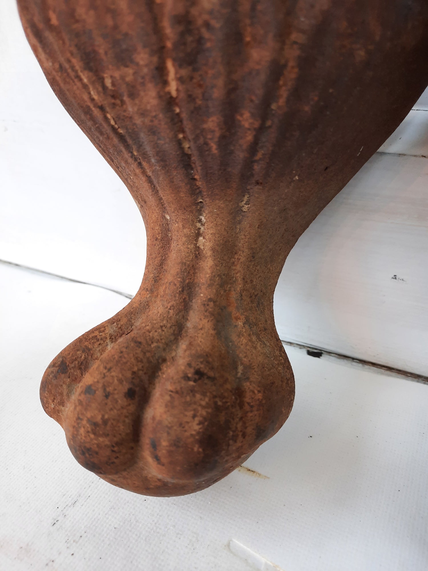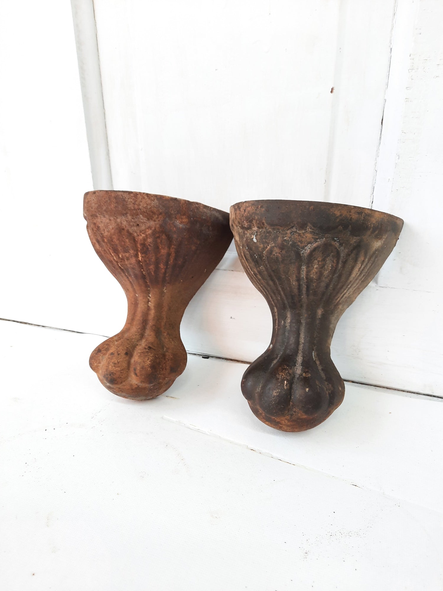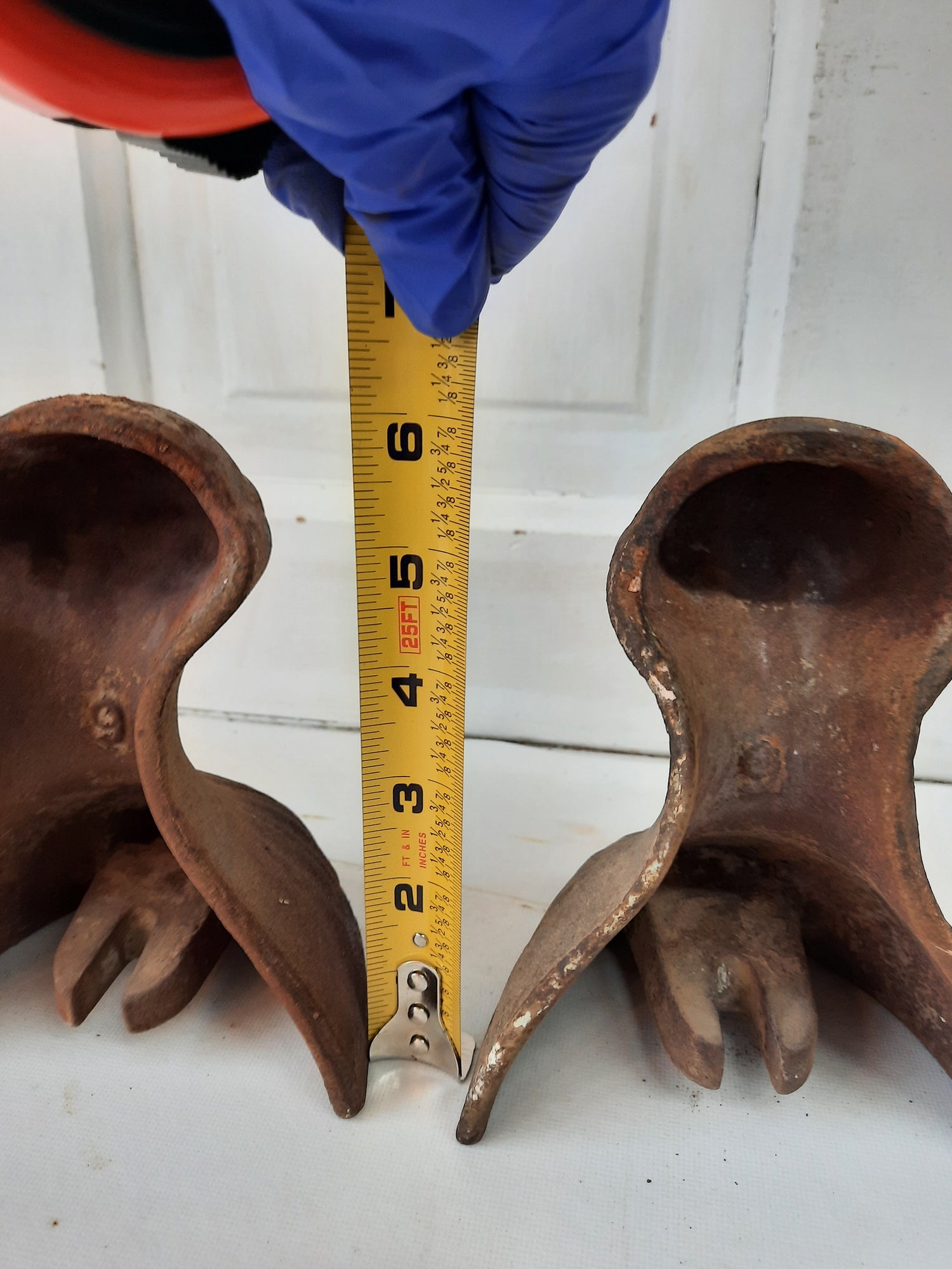 A set of cast iron tub feet in claw or lion's paw design which is more ornate and much less common that the typical ball and claw design. These were originally seen on clawfoot tubs, however, many buyers opt to use them in creative repurposes such as bookends. This pair has been cleaned of the old paint. They can be sealed and left as is or repainted.
