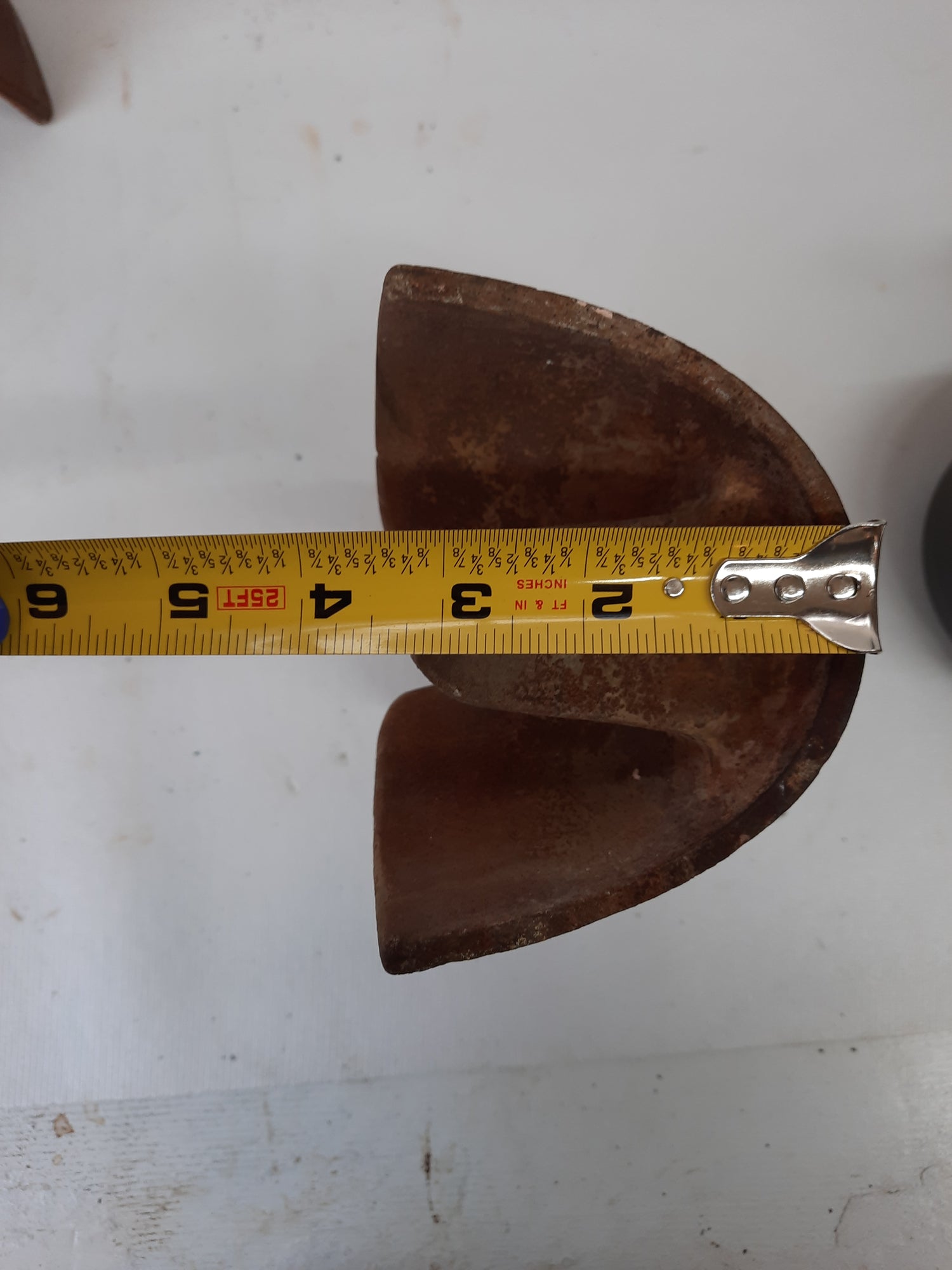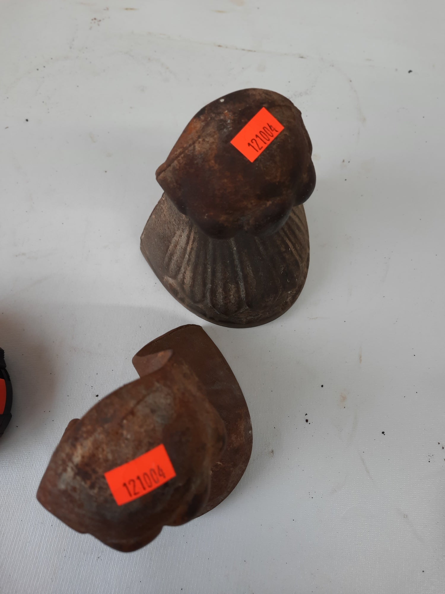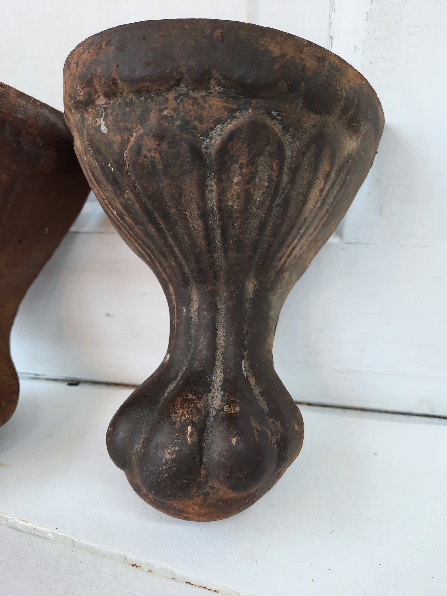 A set of cast iron tub feet in claw or lion's paw design which is more ornate and much less common that the typical ball and claw design. These were originally seen on clawfoot tubs, however, many buyers opt to use them in creative repurposes such as bookends. This pair has been cleaned of the old paint. They can be sealed and left as is or repainted.