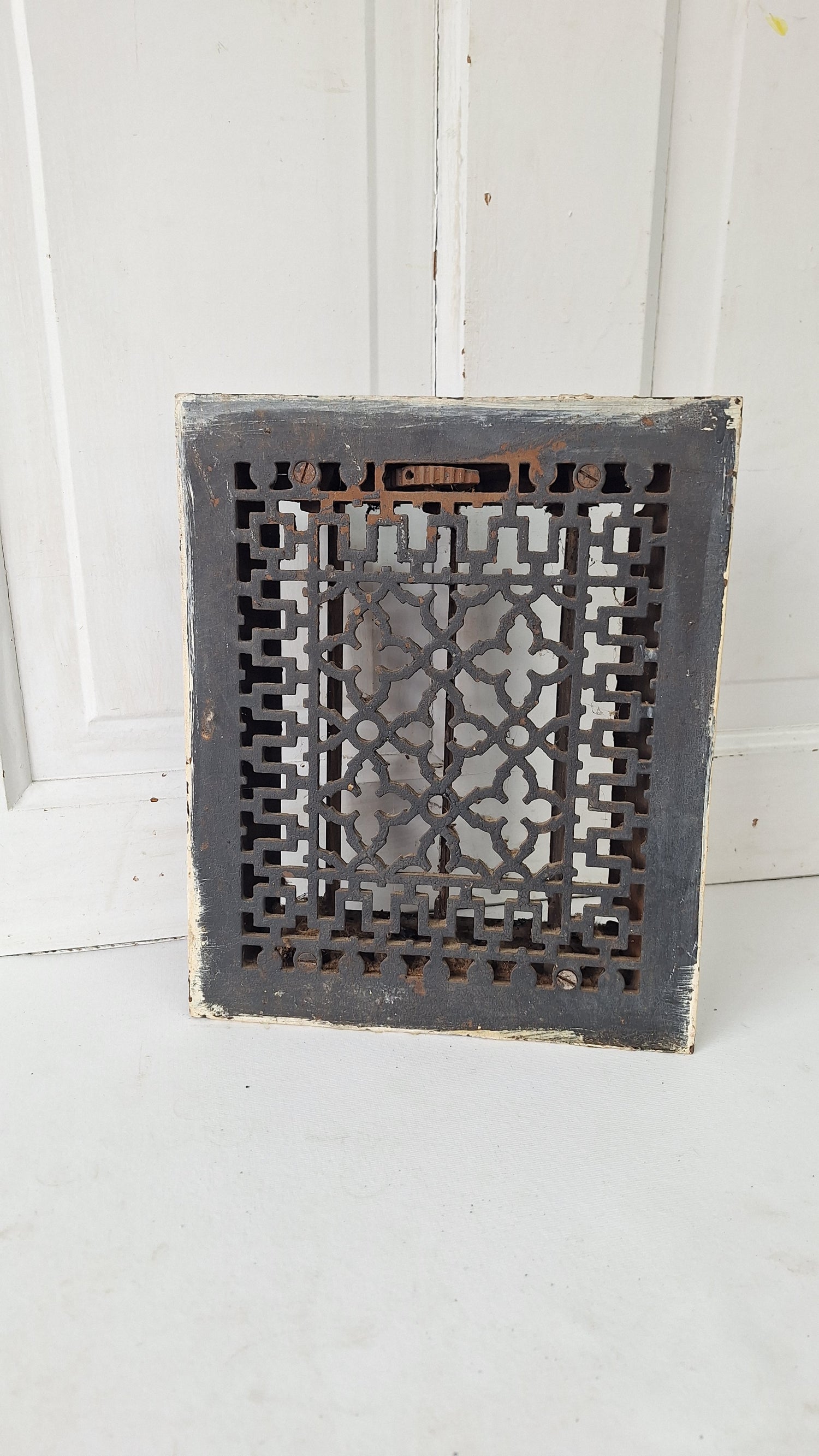 An elegant geometric design vent cover from the turn of the century. The louvers on the back are in excellent working condition, but will need cleaning before installation. Please see all of our pictures for details.