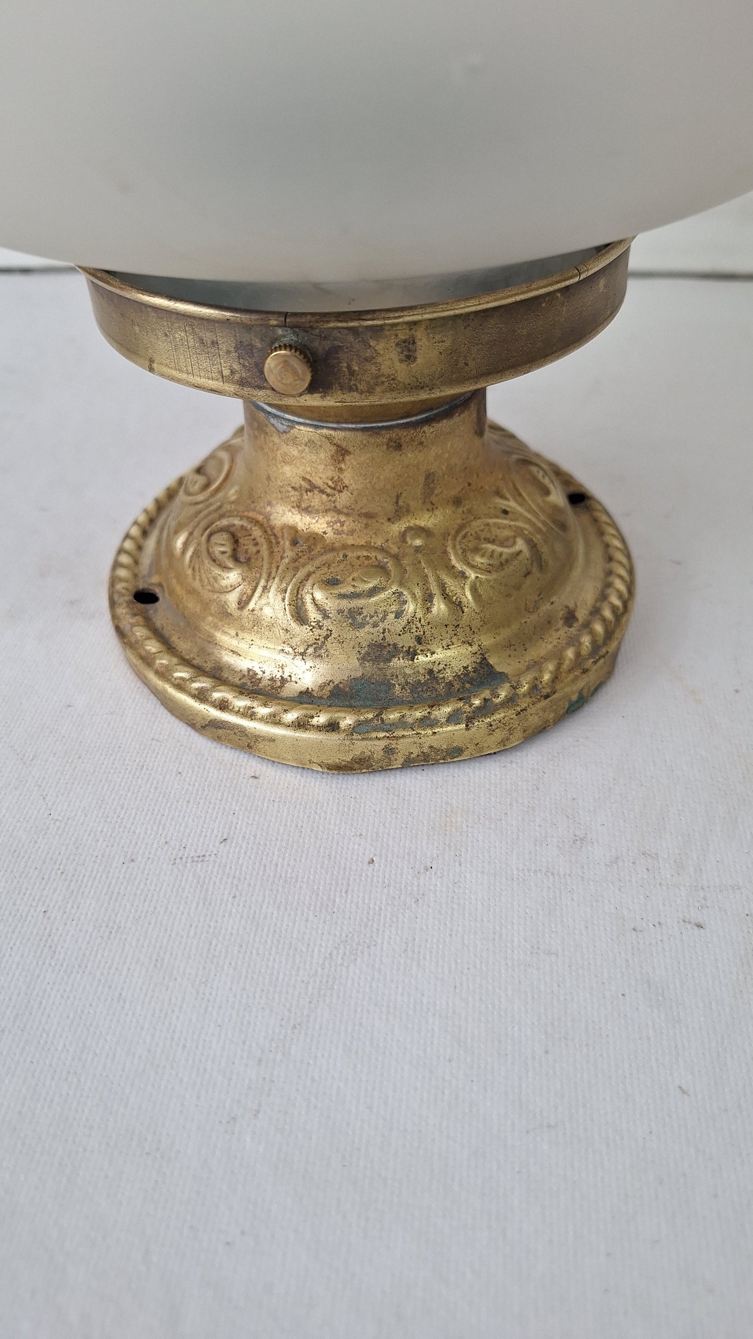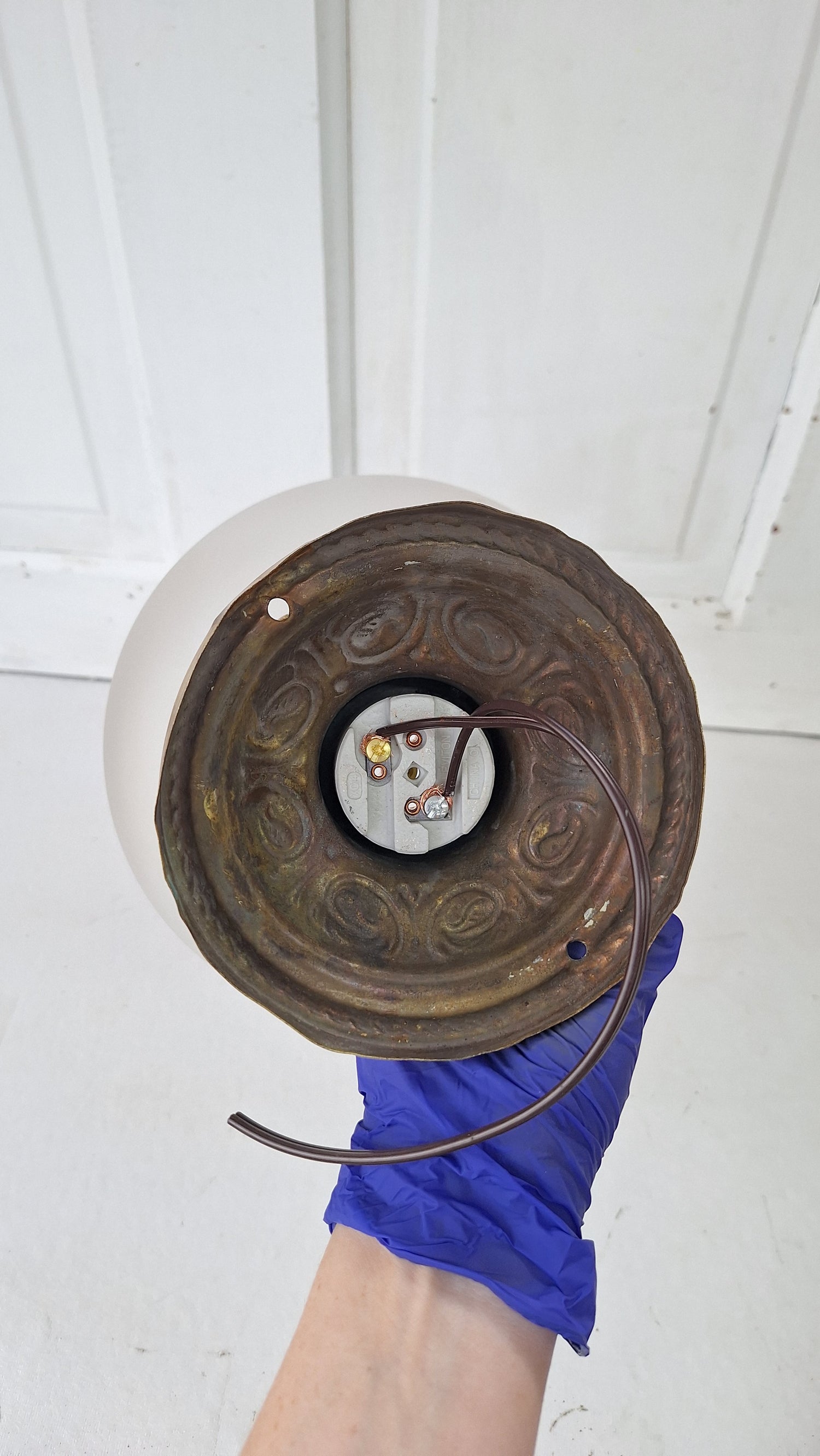 This antique fixture measures 8 1/2" tall by 7 1/2" across the globe and 5" across the canopy (ceiling mount). This item ships free within the continental US. No PO boxes please. www.peoriasalvage.com clear