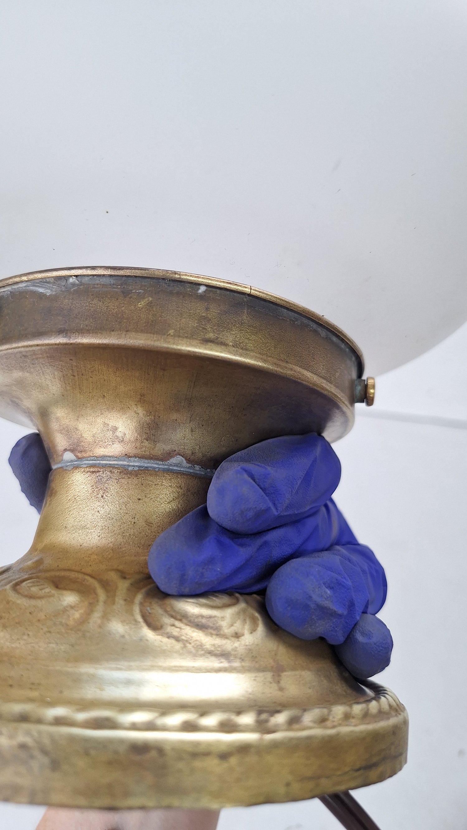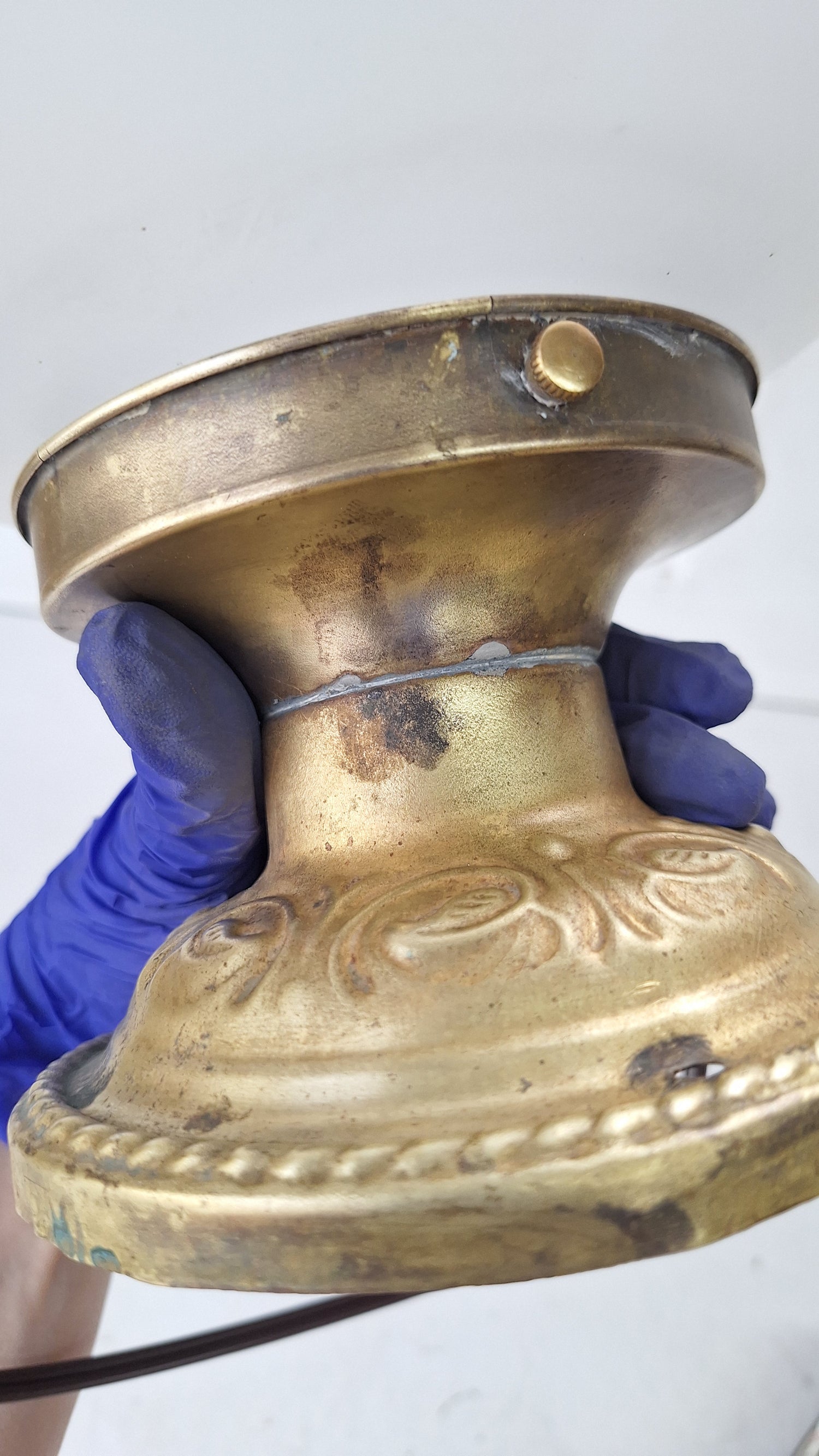 A gorgeous, wheel cut glass shade paired with a stamped decorative brass fitter. This piece has been cleaned, rewired, and is ready to install. The brass in slightly bent in a few areas and does have a few spots of dark discoloration as shown. The glass is beautifully beveled and is in excellent condition. Please see all of our pictures for details.