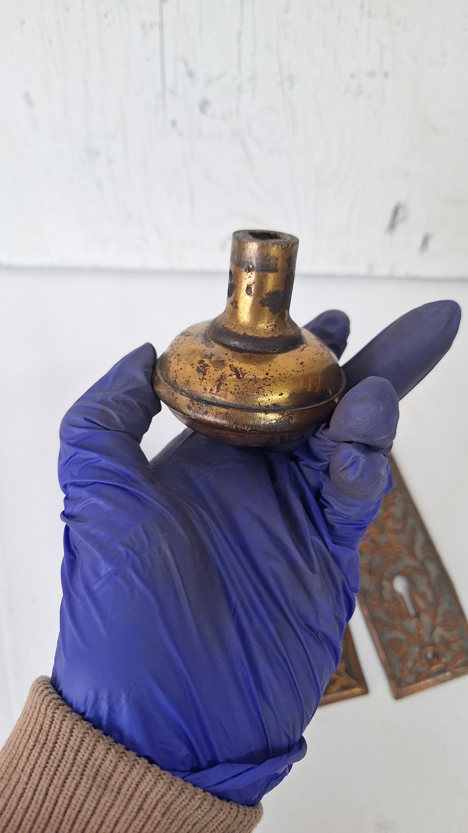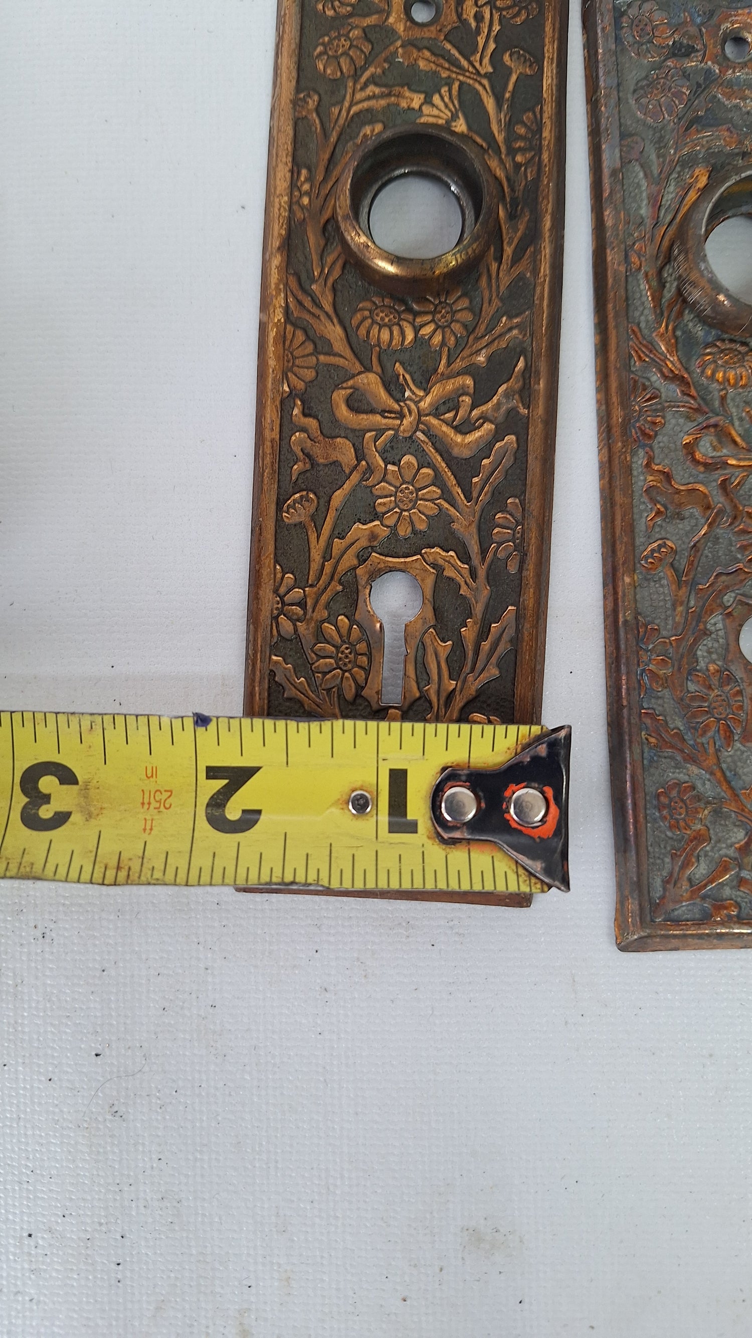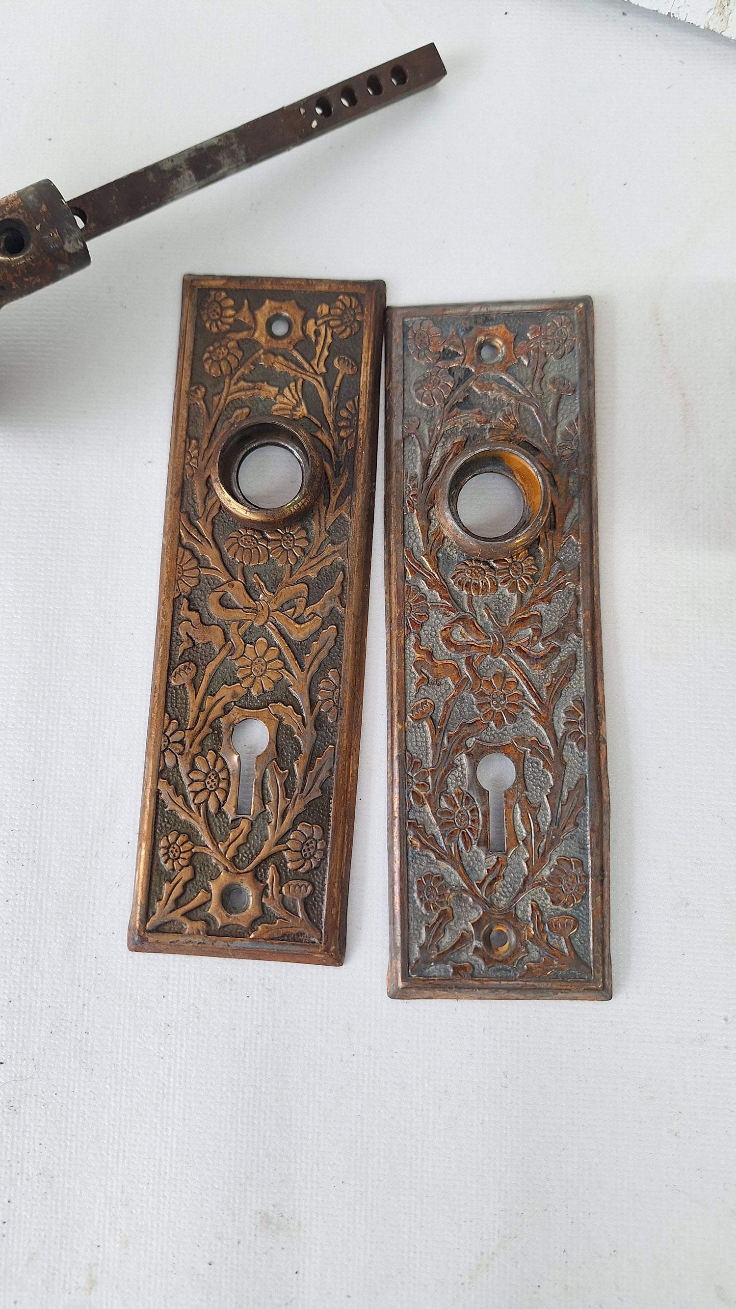 A beautifully charming set of daisy patterned hardware in bronze plated steel by the US Steel Lock company c. 1900. This set has been given a light polish and is ready to install. The finish and patina make the gorgeous floral pattern stand out. The plating is worn in several areas as shown.